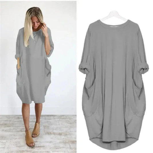 Sukienka damska na co dzień, bawełniana i lniana, z długim rękawem i okrągłym dekoltem