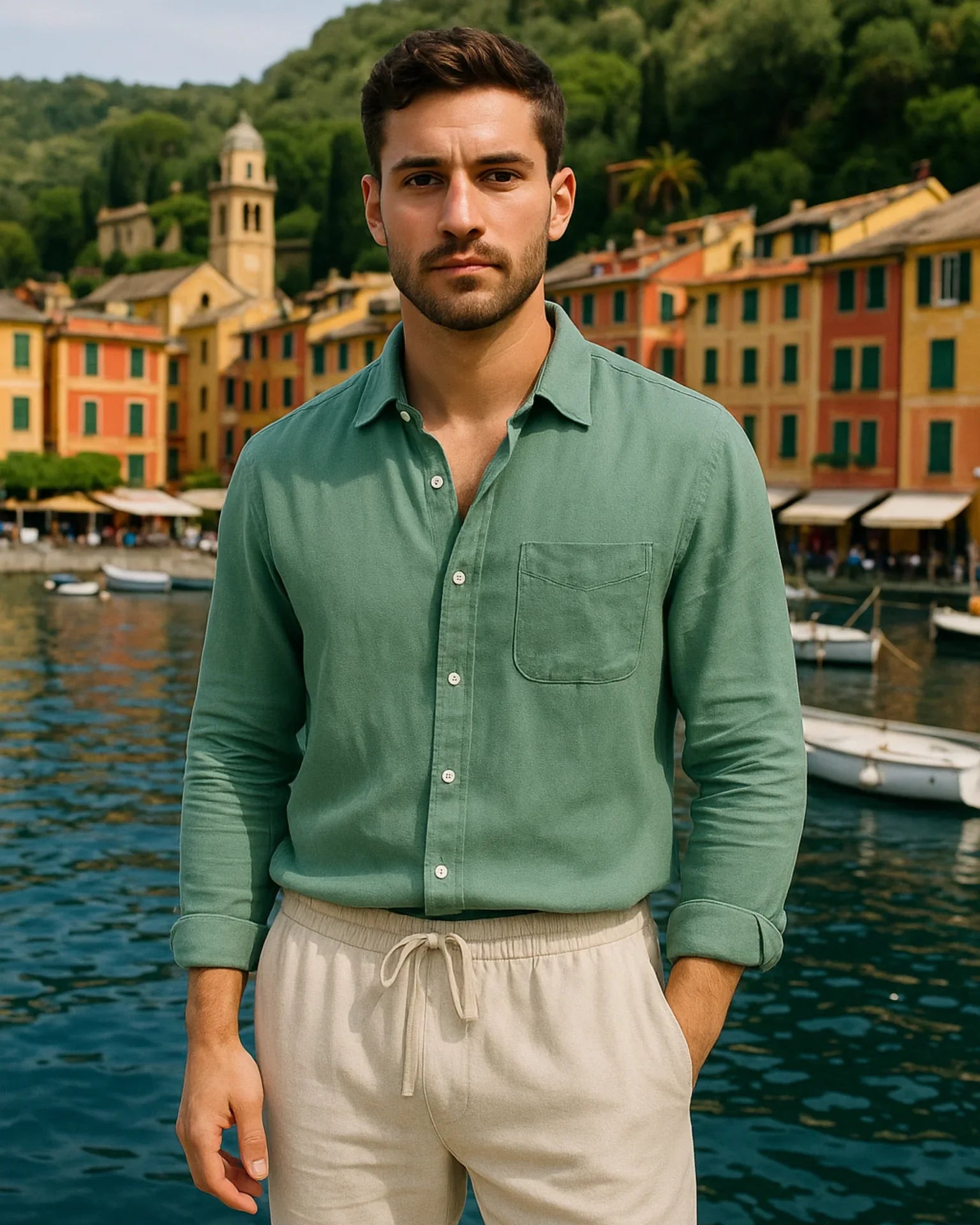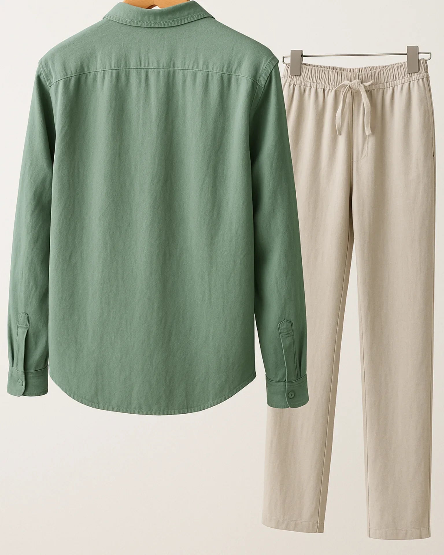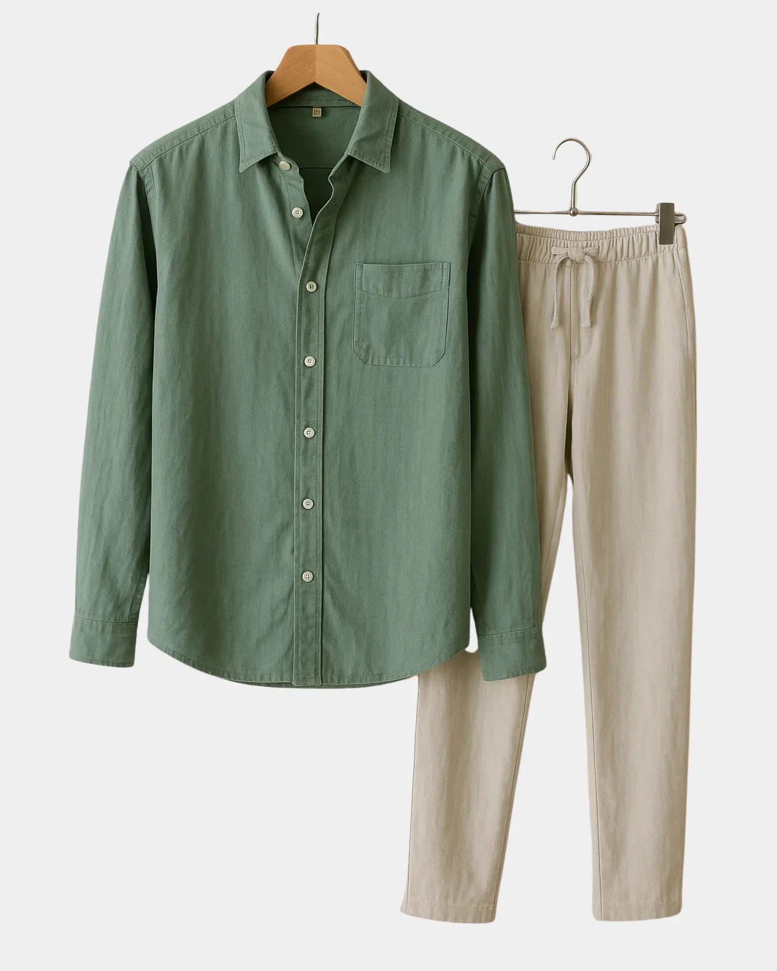 Ten 2-częściowy lniany zestaw — zielony/beżowy to definicja swobodnej elegancji. Zaprojektowany z myślą o ciepłych dniach i chłodnych wieczorach, składa się z lekkiej koszuli z długim rękawem oraz dopasowanych spodni ze ściągaczem — wykonanych z oddychającego, miękkiego w dotyku materiału, który porusza się wraz z Tobą. Doskonale skrojony dla nowoczesnej wszechstronności, sprawdzi się zarówno podczas spaceru po mieście, jak i weekendowego wypadu.