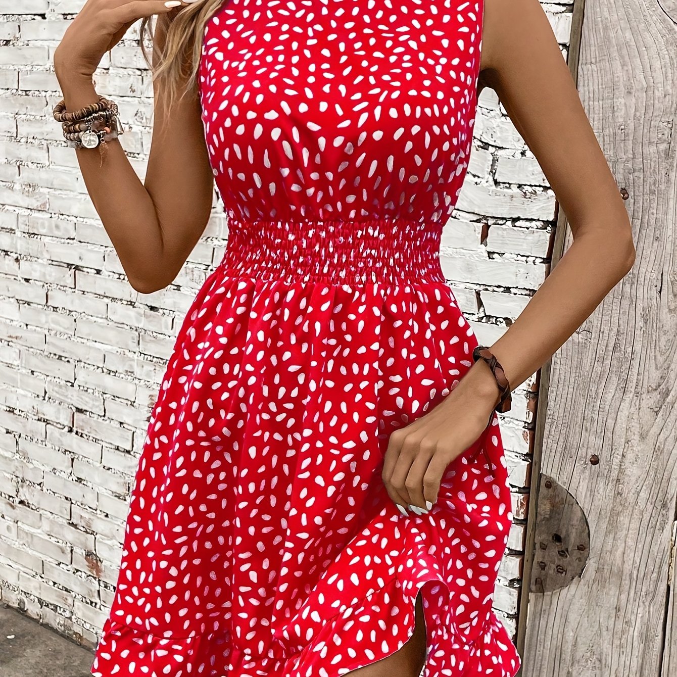 Sukienka Aldona łączy prostotę bezrękawowego kroju z delikatnym kwiatowym nadrukiem, tworząc stylową propozycję na cieplejsze dni. Okrągły dekolt i dopasowana talia nadają jej elegancji, idealnej zarówno na codzienne spacery, jak i bardziej wyjątkowe okazje.