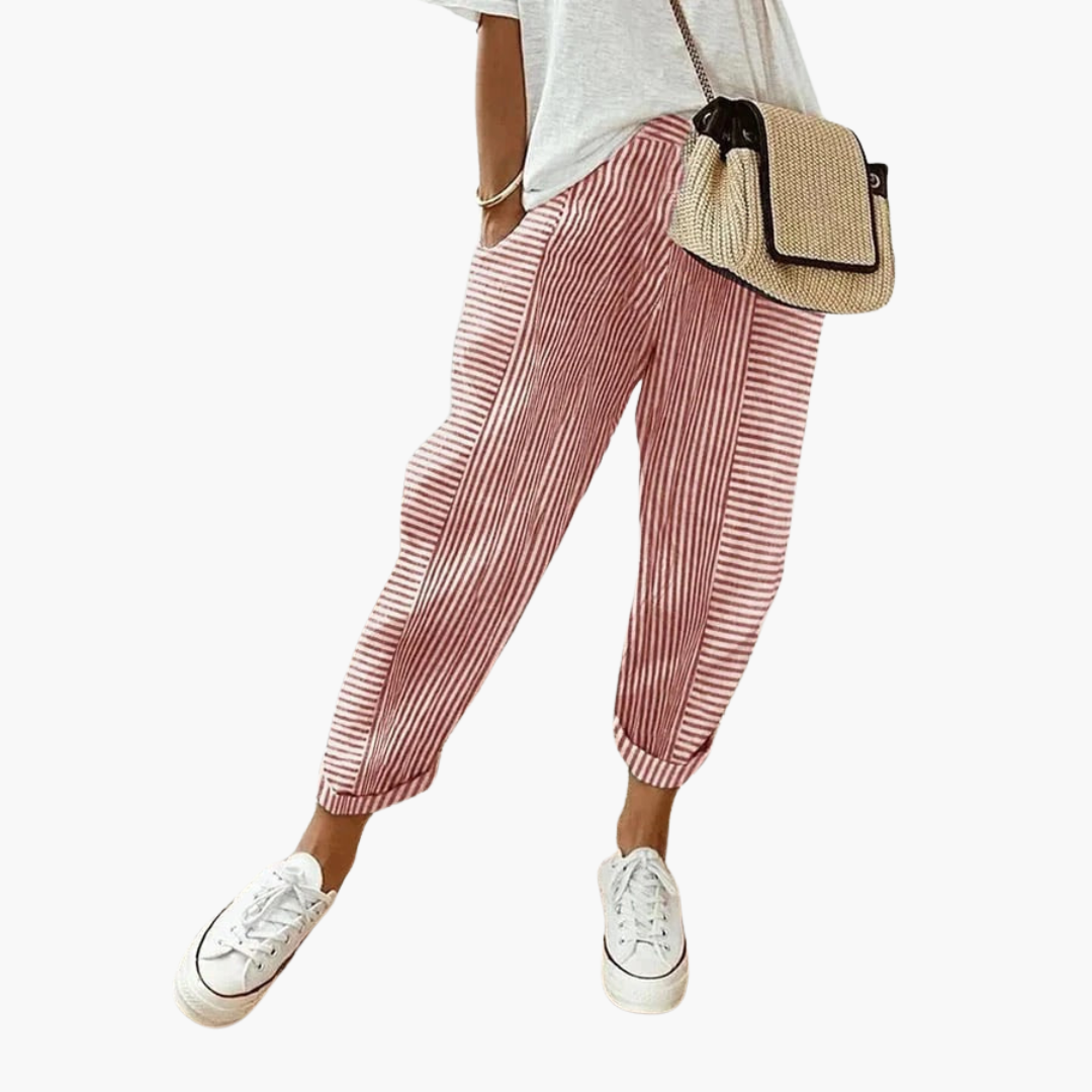 Verleihen Sie Ihrem Look mit den Alina Bequemen Streifen-Hosen zeitlose Eleganz. Diese gestreiften Hosen bieten unvergleichlichen Komfort, während sie gleichzeitig einen schicken, elegancki wygląd bewahren – der perfekte Begleiter für jede Gelegenheit. Ob für einen legeren Ausflug oder ein stilvolles Abend-Event, diese Hosen bieten die perfekte Balance aus Leichtigkeit und Stil.