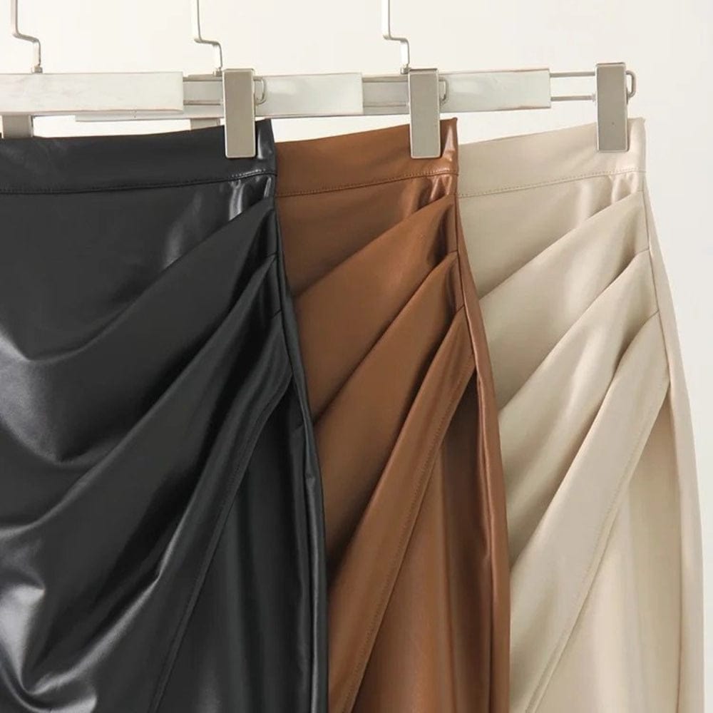 Przyciągaj wzrok tą olśniewającą spódnicą midi z rozcięciem, wykonaną z miękkiej, teksturowanej skóry wegańskiej. Marszczenia i odważne rozcięcie z przodu dodają Twojej garderobie włoskiego szyku, idealnego na całodzienną elegancję z nutą śmiałości.