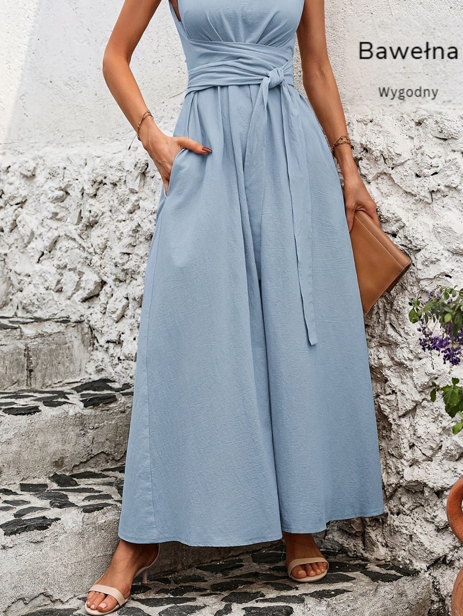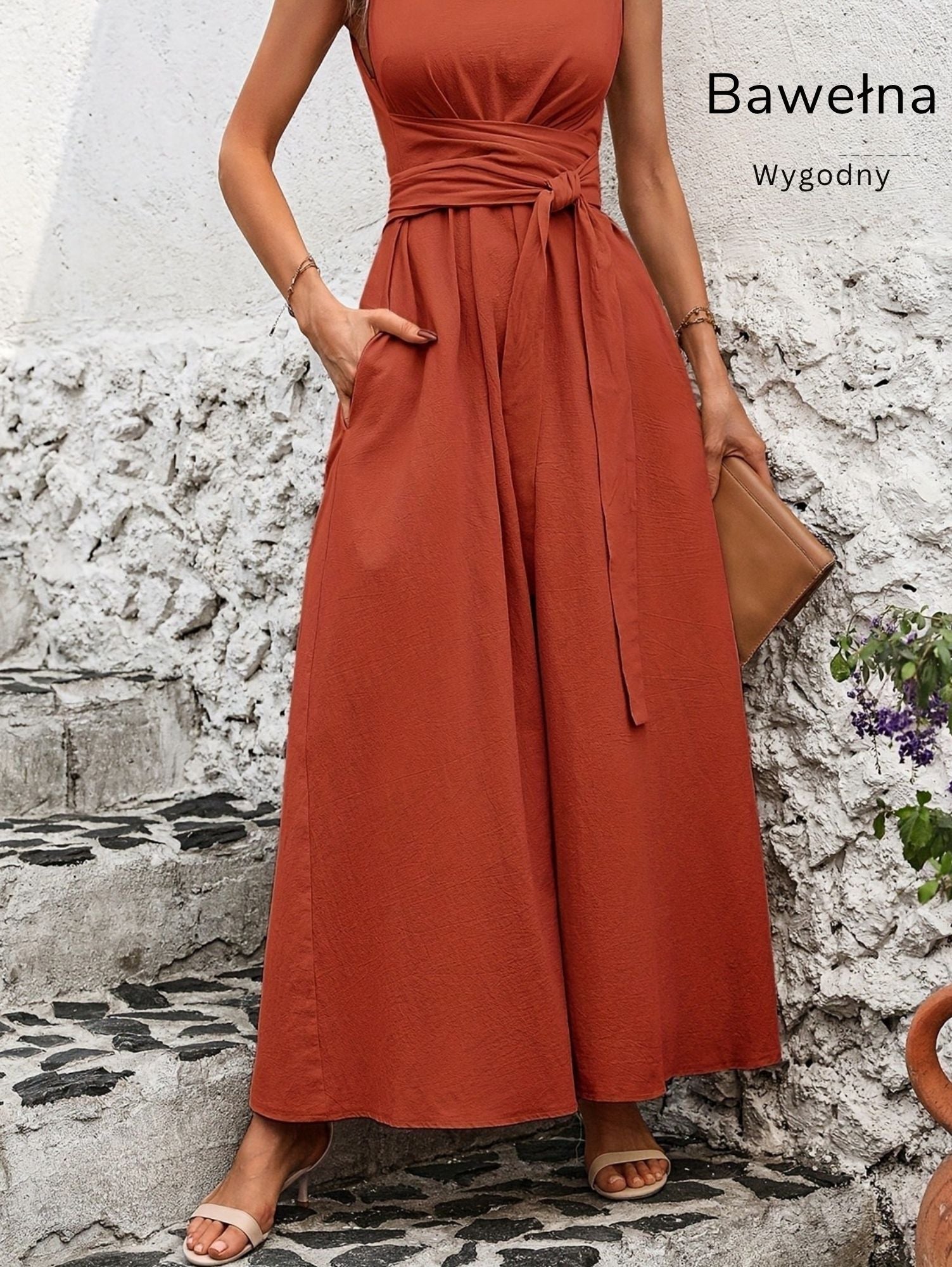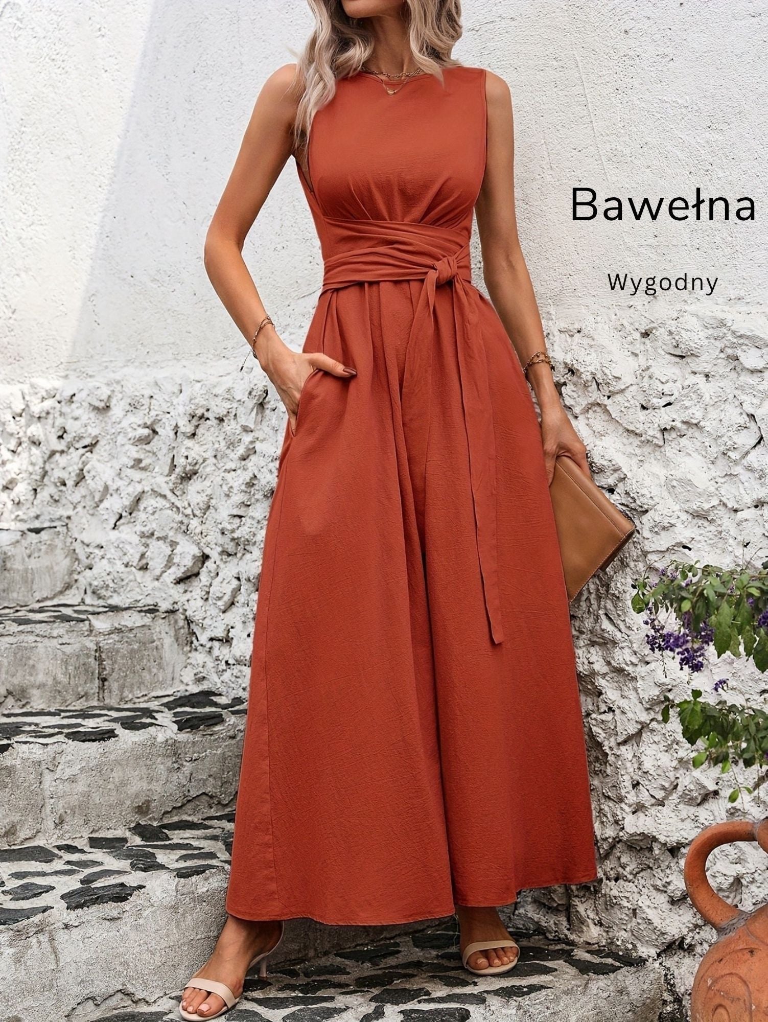 Bezrękawnikowa sukienka A-line z bocznymi kieszeniami łączy elegancję i praktyczność, zapewniając komfort przez cały dzień. Wykonana w 100% z oddychającej bawełny, idealnie sprawdzi się na ciepłe dni wiosny i lata. Dzięki prostemu, ponadczasowemu fasonowi pasuje zarówno na codzienne spacery, jak i formalne spotkania. Materiał pozwala skórze oddychać, co wspiera naturalną termoregulację ciała.