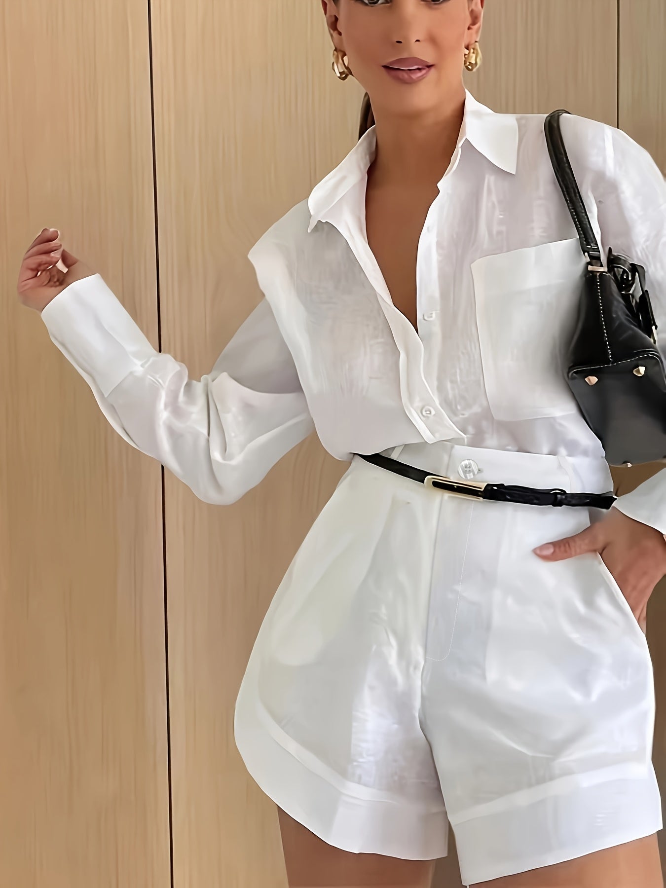 Zestaw Barbara to jednokolorowy komplet z prostą koszulą i szortami, idealny na wiosnę i lato. Lekka tkanina i brak elastyczności nadają mu uniwersalny charakter, pasujący do codziennych stylizacji.