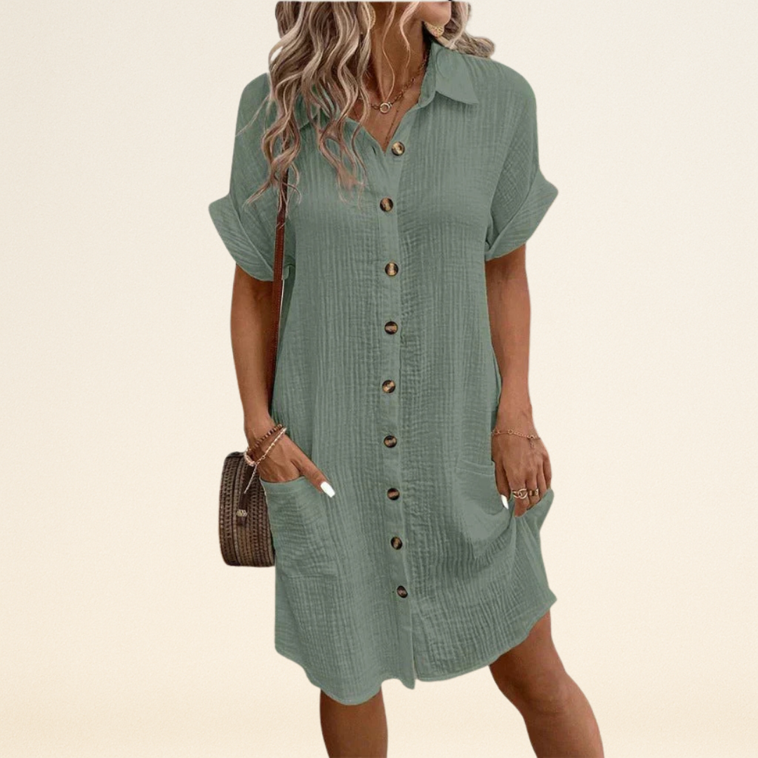 Ponadczasowy design polo : Ta sukienka z klasycznym kołnierzykiem polo i zapięciem na guziki z przodu nadaje nowoczesny charakter ponadczasowemu stylowi.