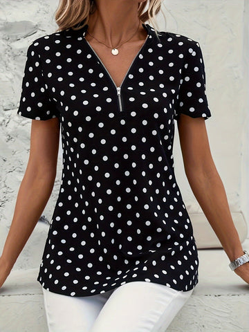 Bluzka w kropki z dekoltem w serek i zamkiem z przodu. Lekka i przewiewna, idealna na wiosnę i lato. Łączy dziewczęcy urok z elegancją na co dzień.