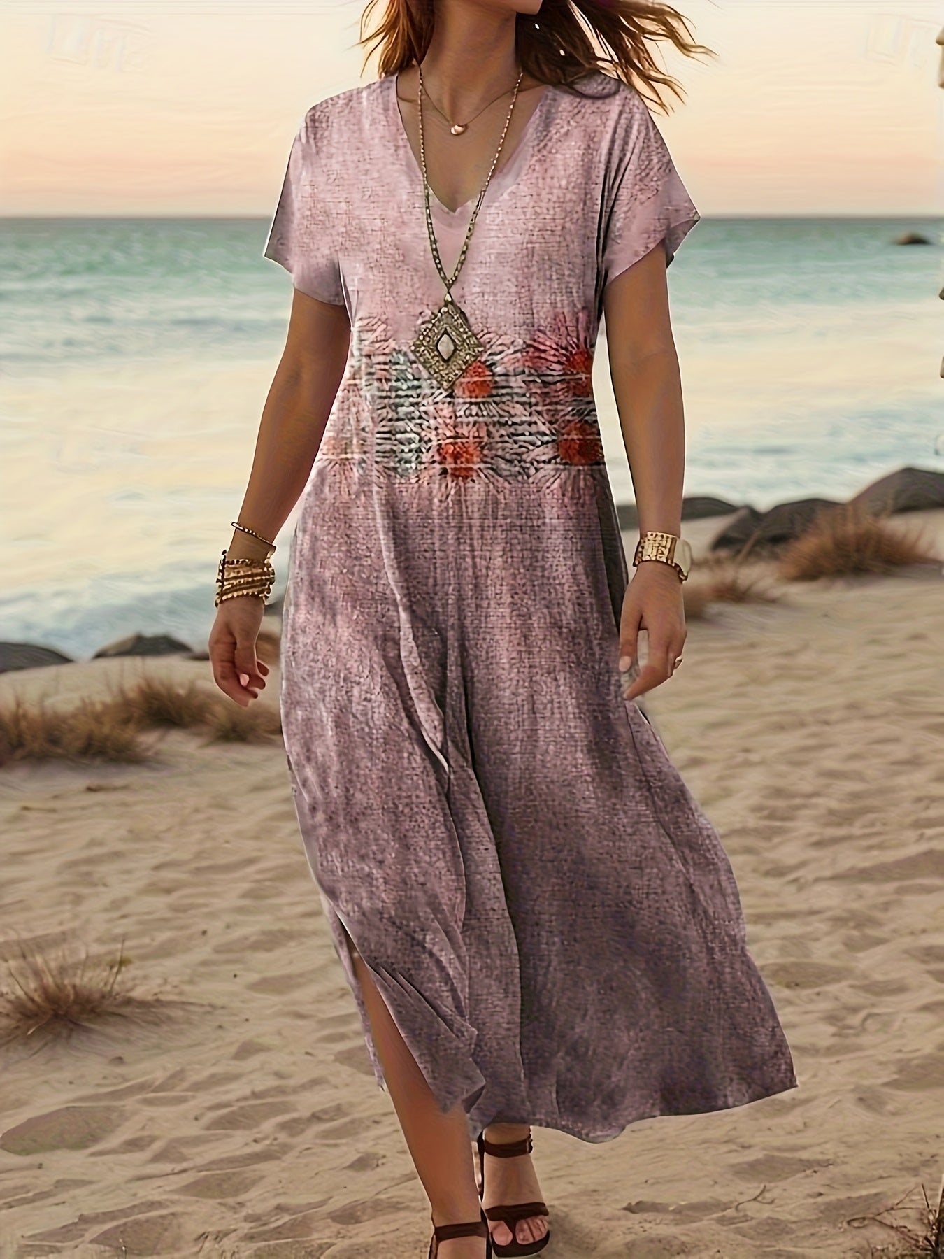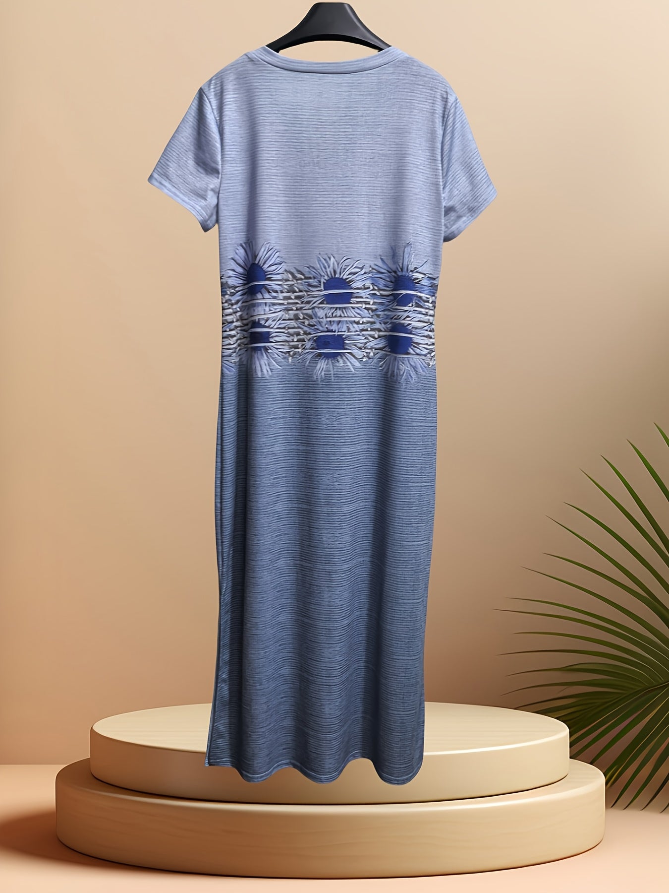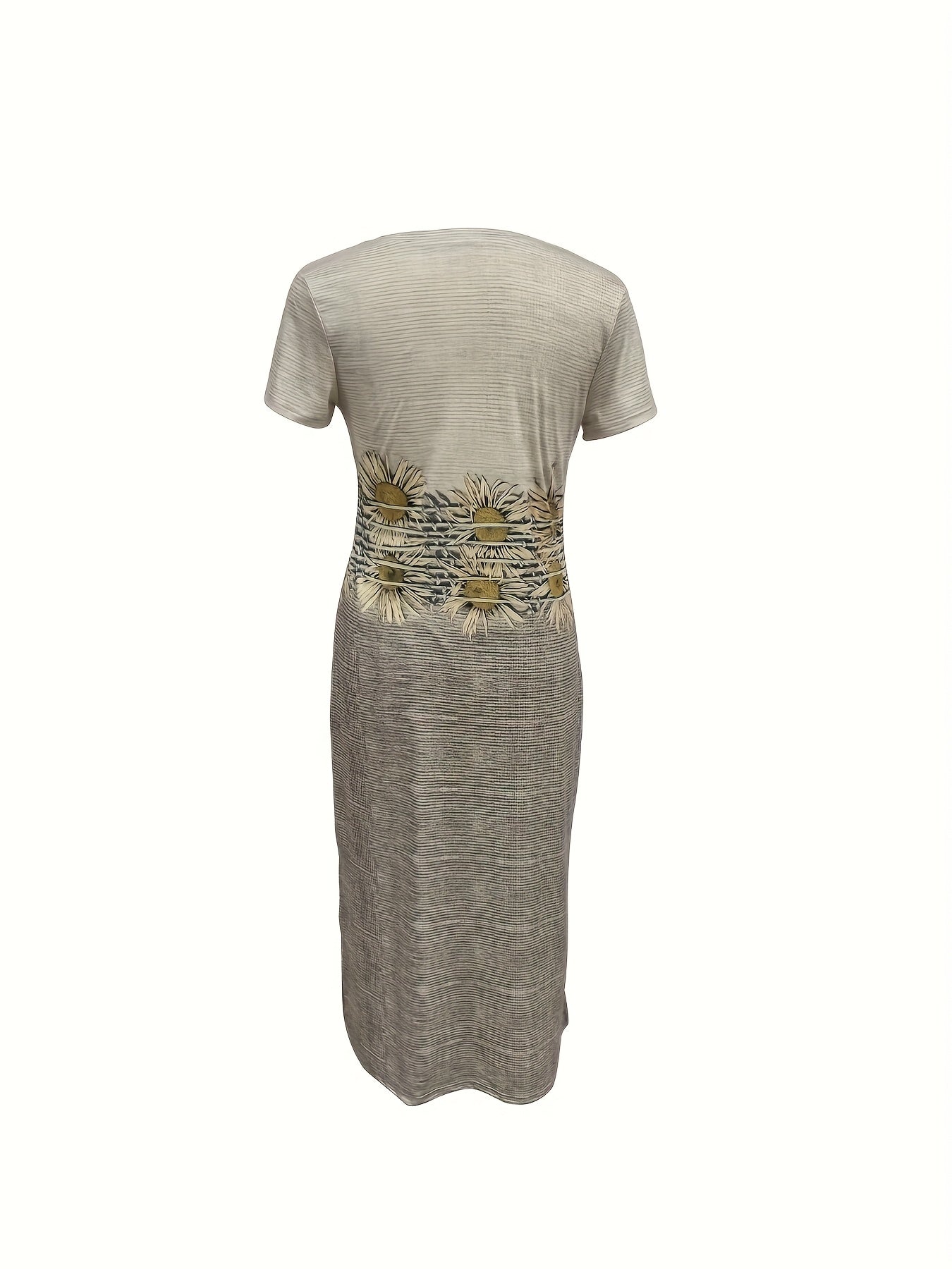 Sukienka Brygida to letnia maxi w tropikalny wzór słonecznika z rozcięciem po boku. Dekolt w serek i lekki poliester sprawiają, że świetnie nadaje się na plażę lub letnie spacery. Krótki rękaw zapewnia wygodę i przewiewność w upalne dni.