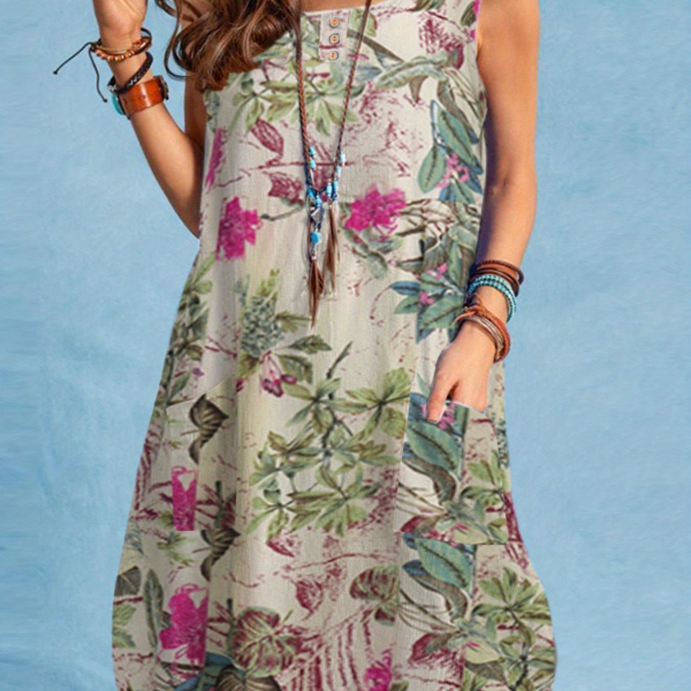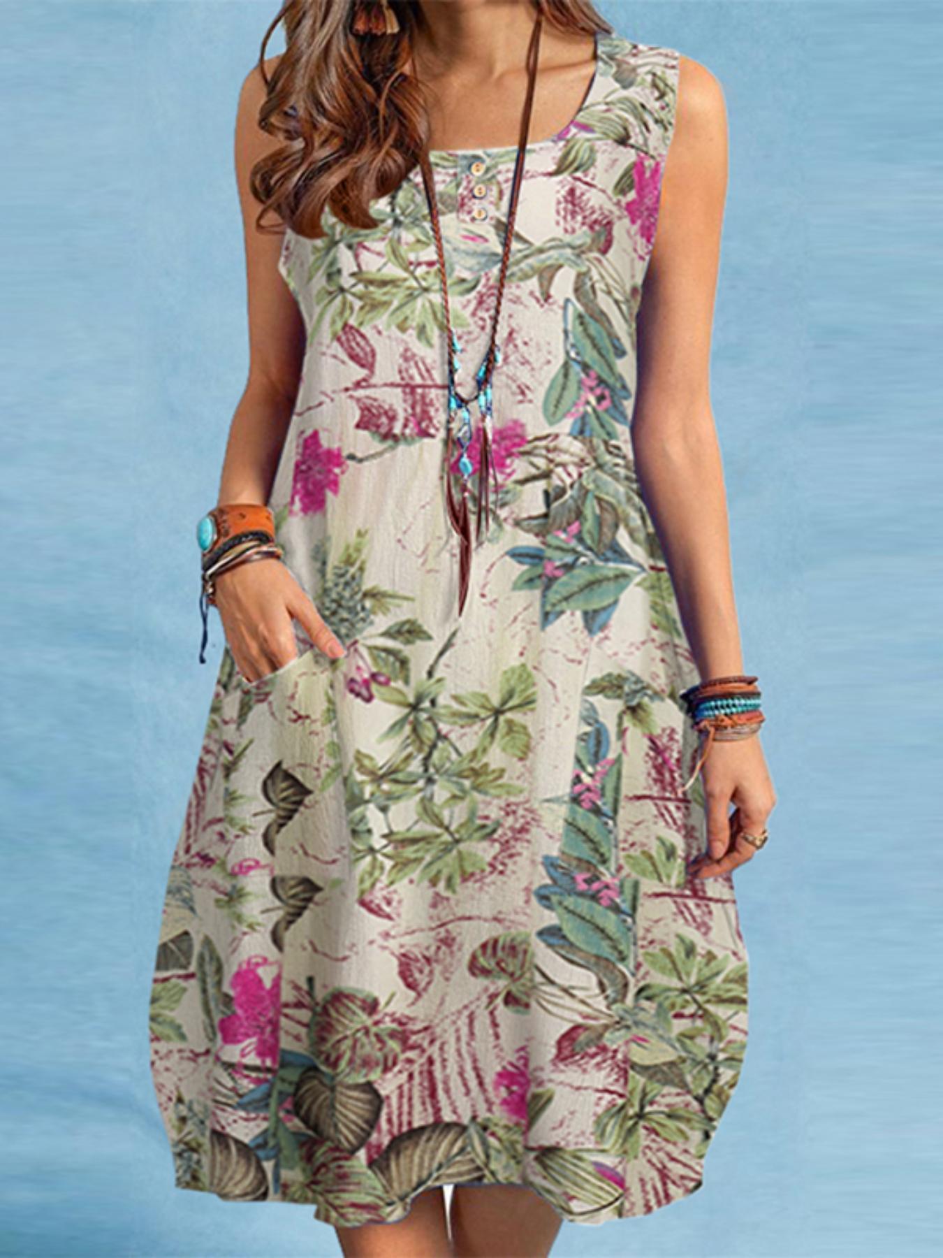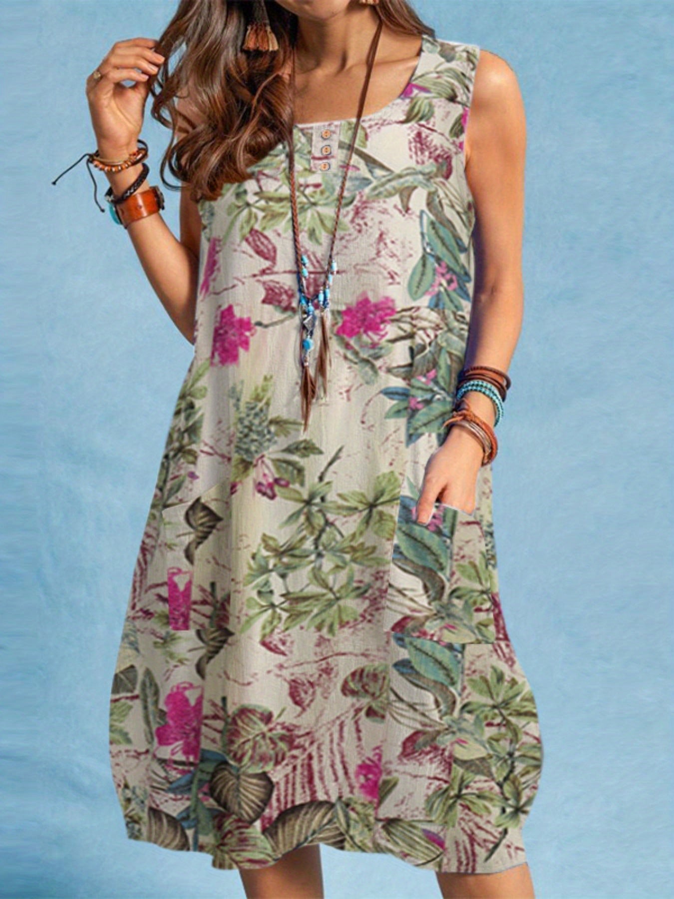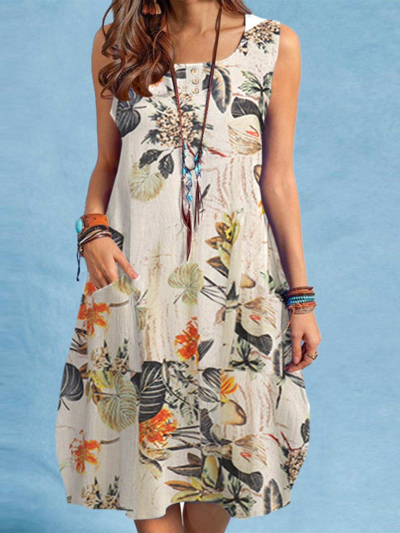 Sukienka Danuta to bezrękawnikowa midi z nadrukiem vintage. Bawełniana tkanina i kieszeń nadają jej praktyczności i lekkości, idealnej na letnie spacery i wyjazdy.