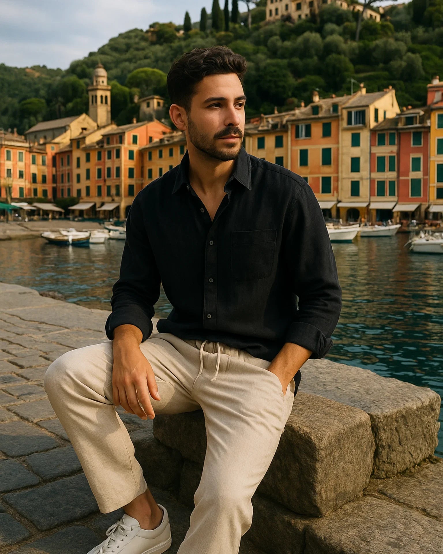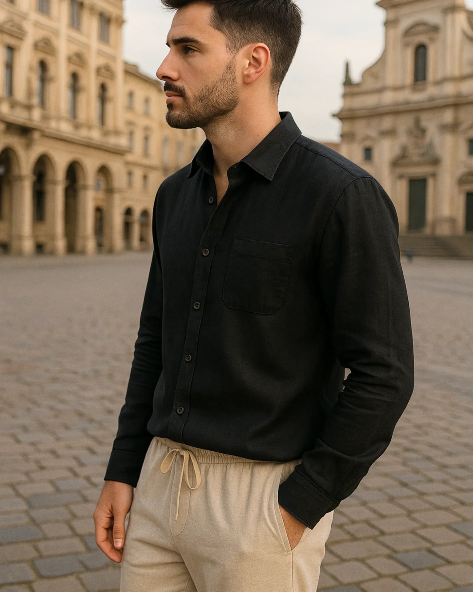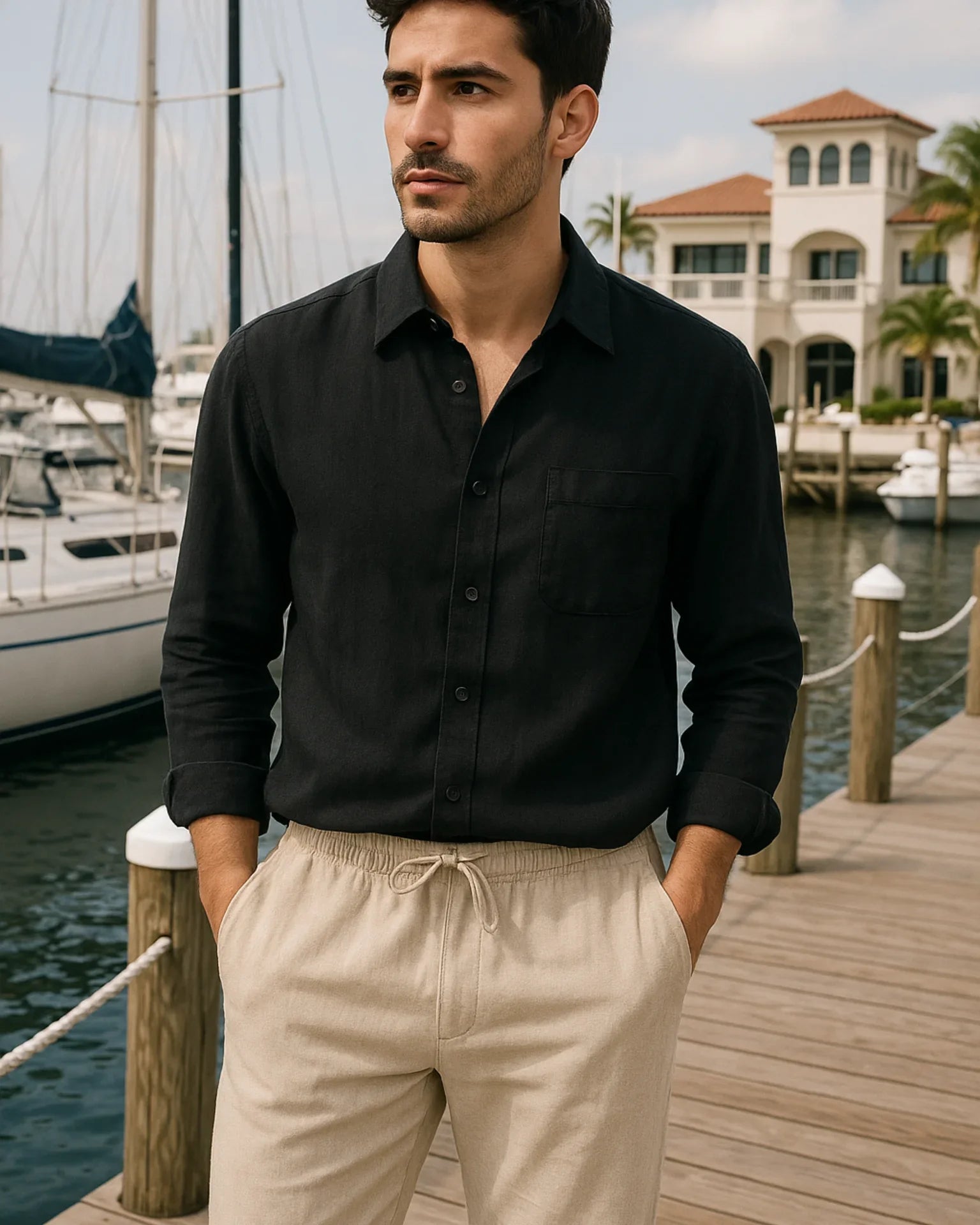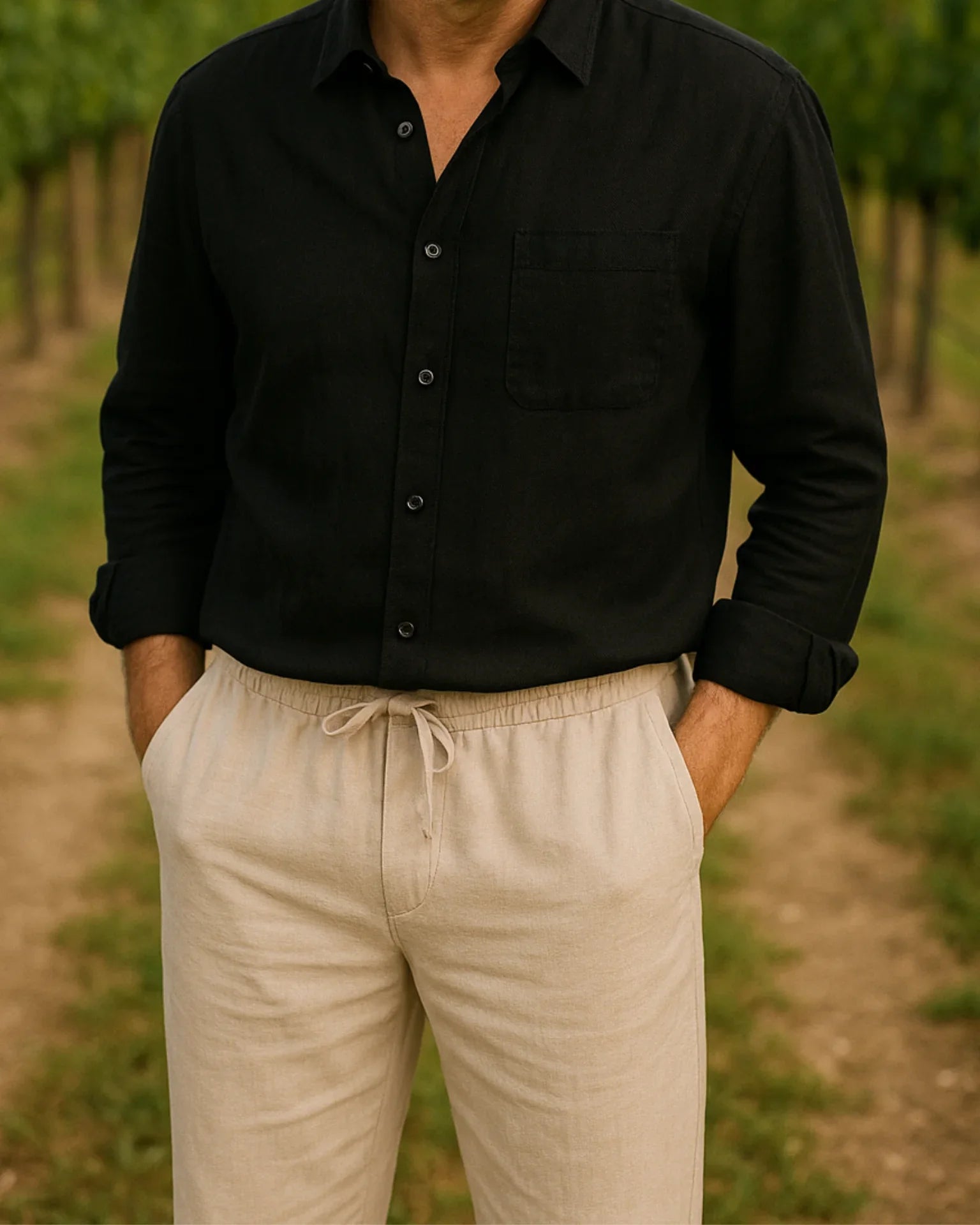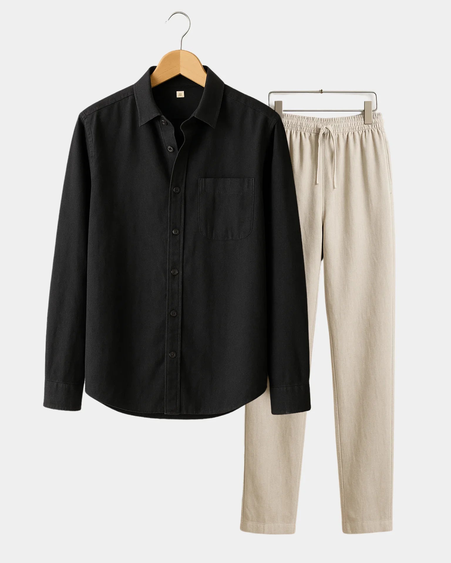 Ten dwuczęściowy lniany zestaw – czarny / beżowy to definicja swobodnej elegancji. Zaprojektowany na ciepłe dni i chłodne wieczory, zawiera lekką koszulę z długim rękawem i dopasowane spodnie na sznurek — wykonane z oddychającego, przyjemnego w dotyku materiału, który porusza się wraz z Tobą. Doskonale skrojony z myślą o nowoczesnej wszechstronności, sprawdzi się zarówno podczas spaceru po mieście, jak i weekendowego wypadu.