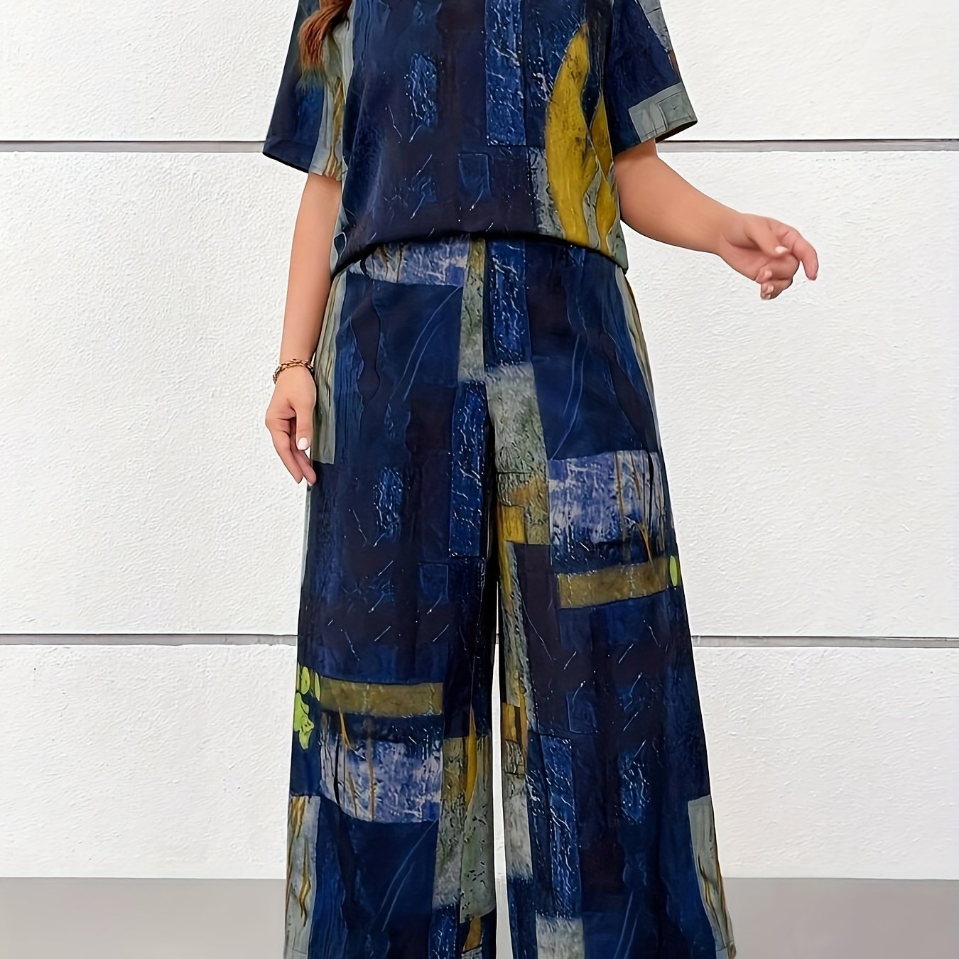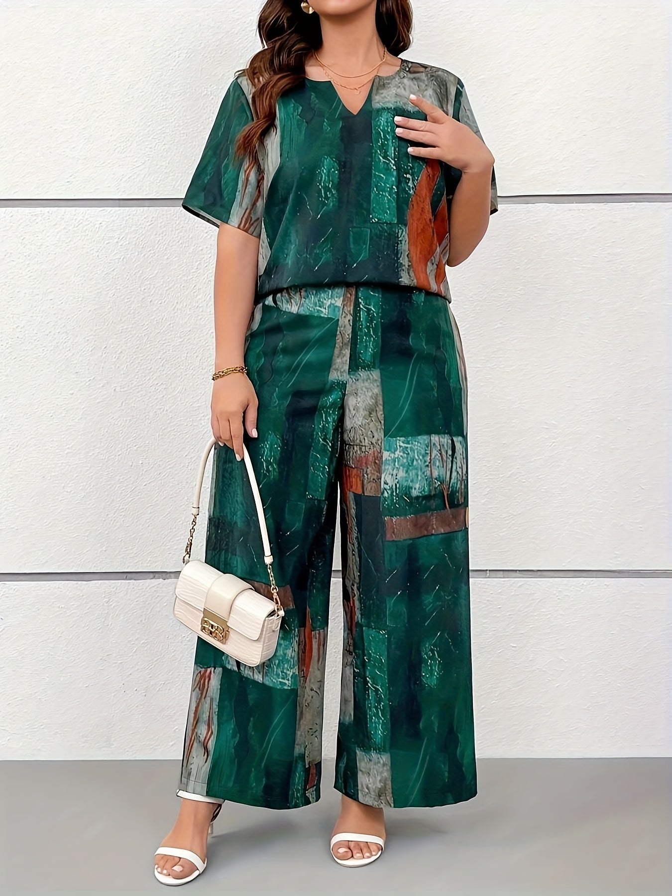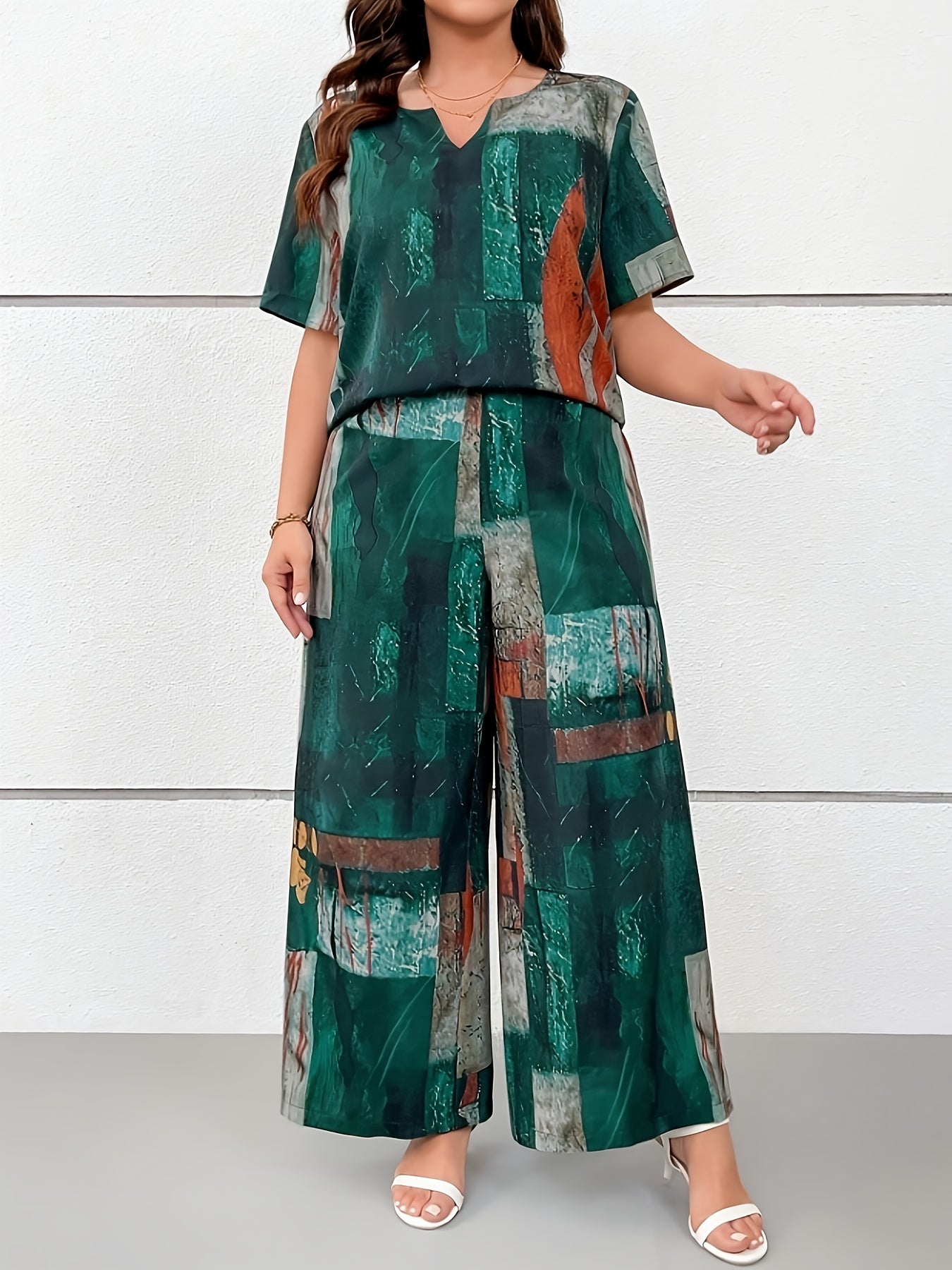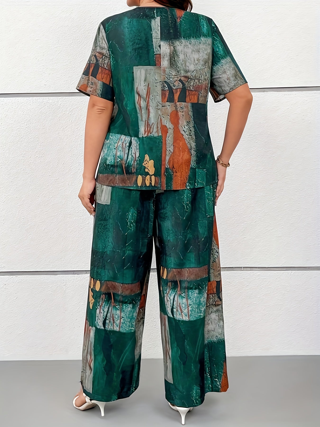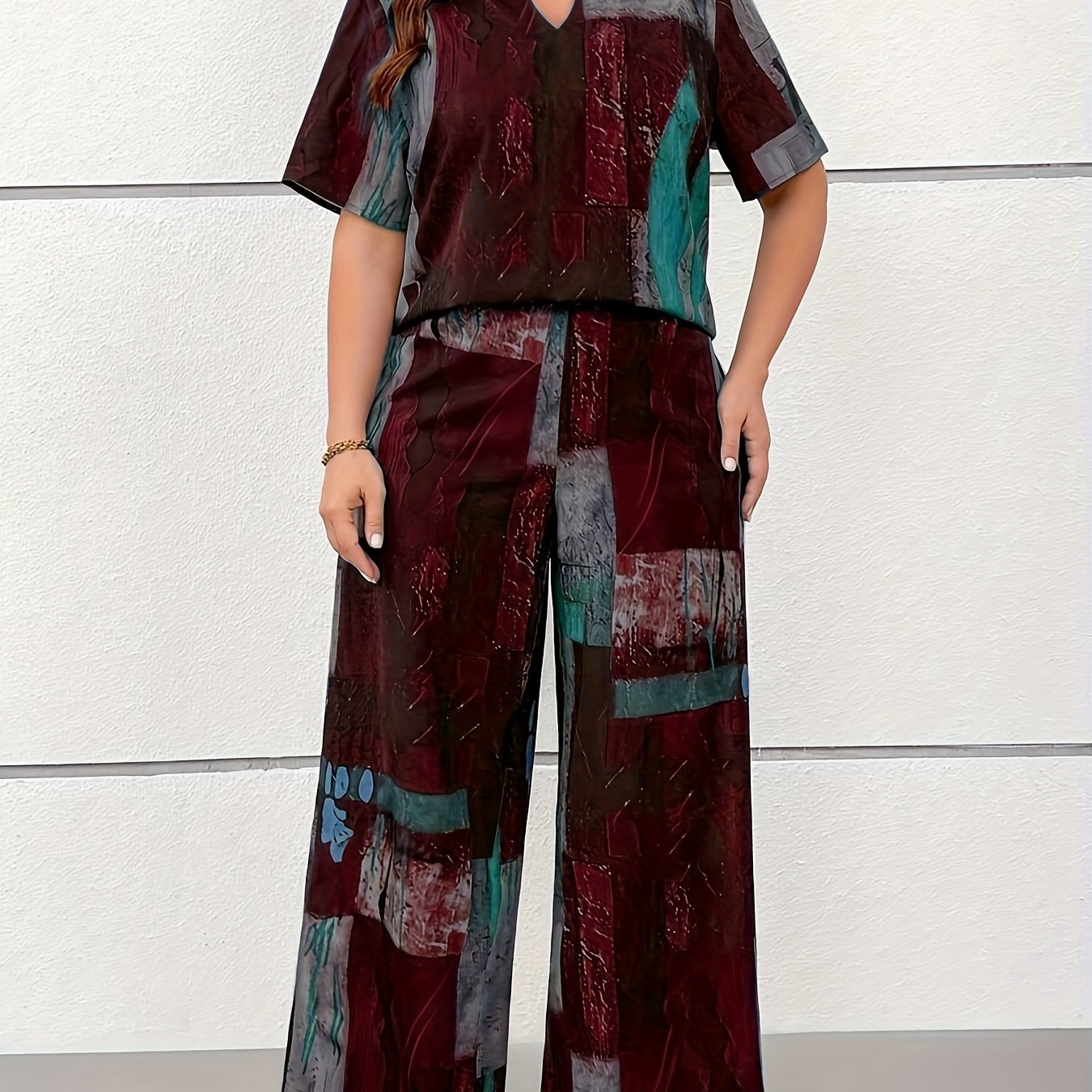 Dwuczęściowy zestaw z koszulką o dekolcie V i nadrukiem w stylu vintage oraz długimi spodniami. Luźny krój zapewnia wygodę, a miękka tkanina jest idealna na wiosnę i lato. Stylowy wybór dla miłośniczek retro klimatów.