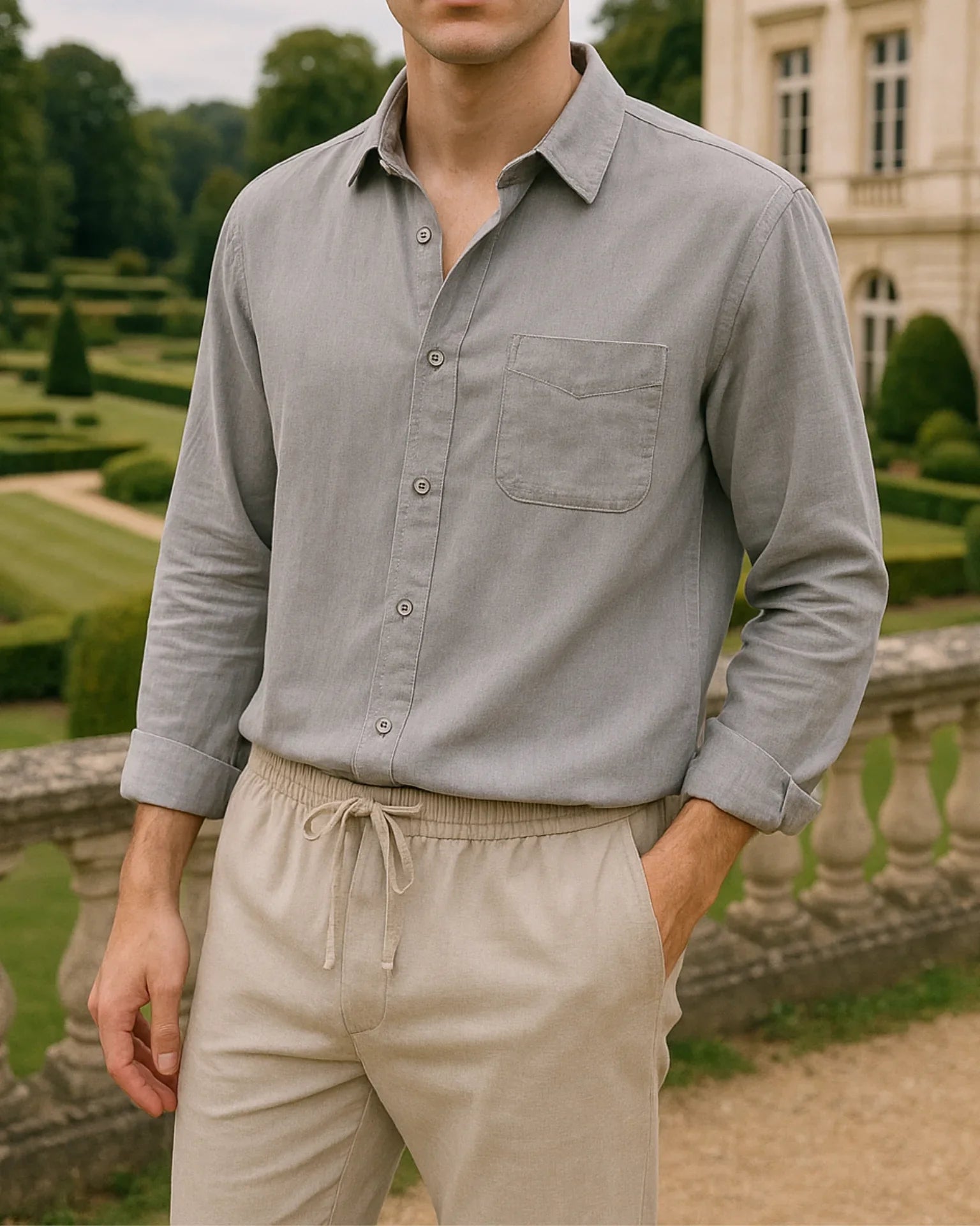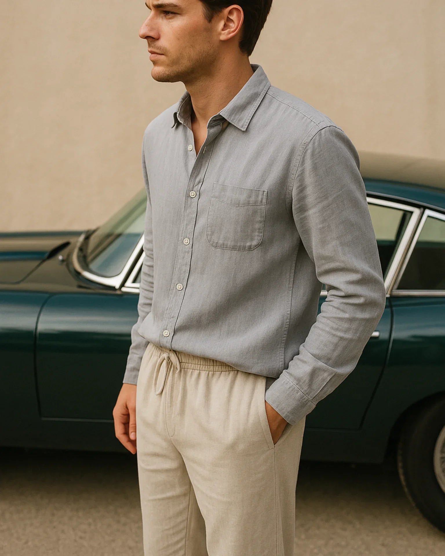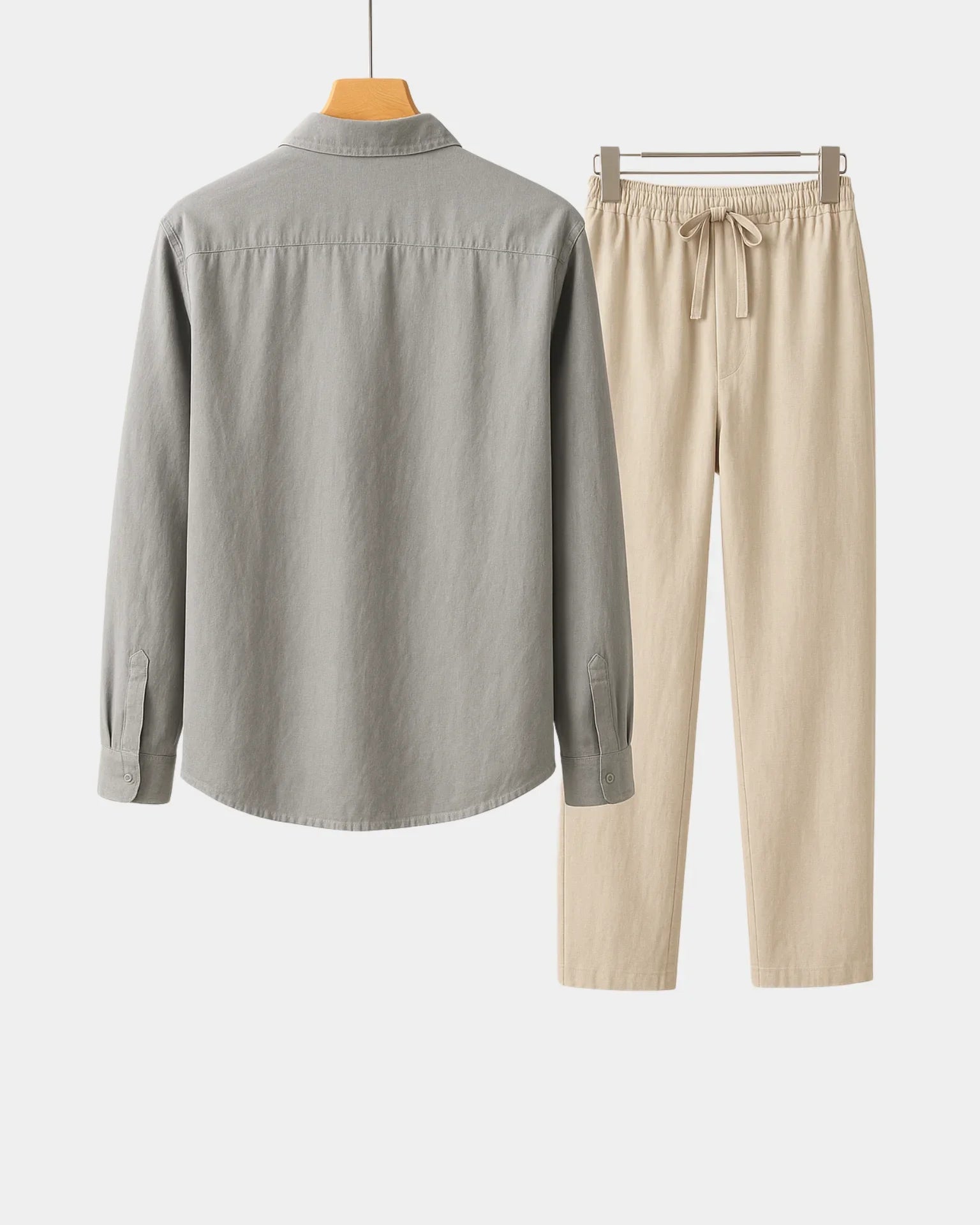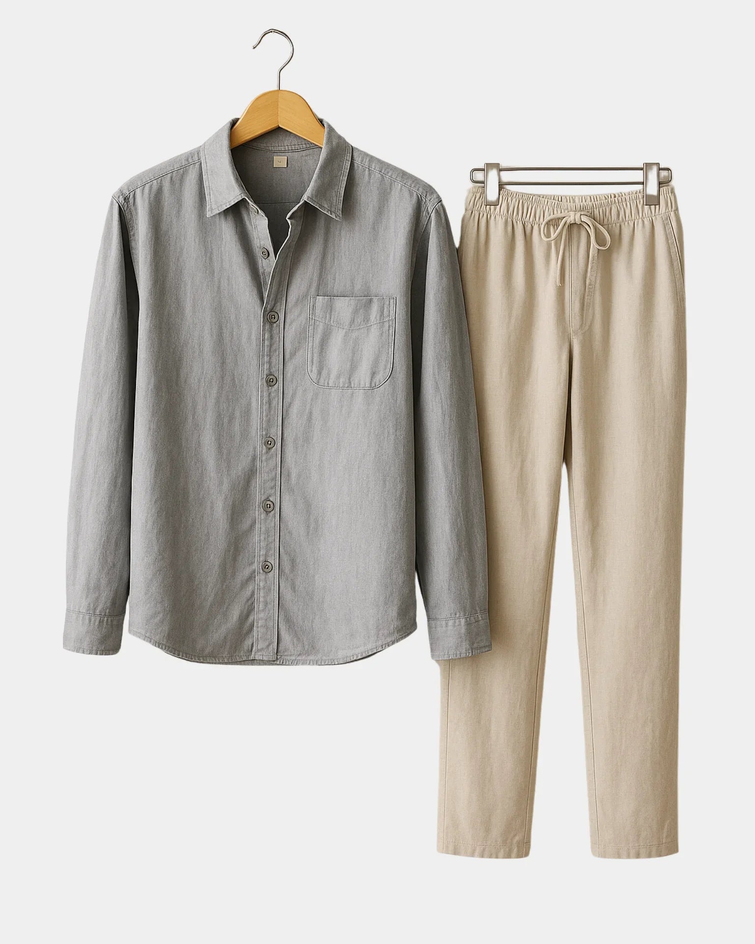 Ten dwuczęściowy letni zestaw to definicja swobodnej elegancji. Zaprojektowany na ciepłe dni i chłodne wieczory, zawiera lekką koszulę z długim rękawem oraz pasujące spodnie na sznurek — wykonane z oddychającego, miękkiego w dotyku materiału, który porusza się razem z Tobą. Doskonale skrojony z myślą o nowoczesnej wszechstronności — sprawdzi się zarówno podczas spaceru po mieście, jak i weekendowego wypadu.