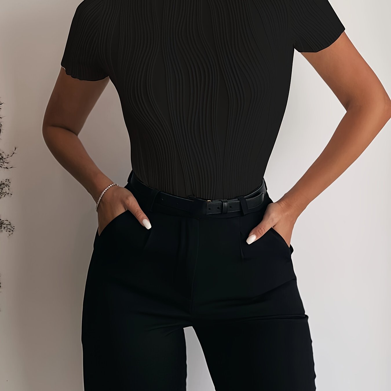 Jednokolorowa koszulka z pionowymi przeszyciami i okrągłym dekoltem, idealna dla miłośniczek prostoty. Białe pasy optycznie wysmuklają sylwetkę, a krótki rękaw zapewnia komfort w cieplejsze dni. Sprawdzi się jako baza wielu stylizacji.