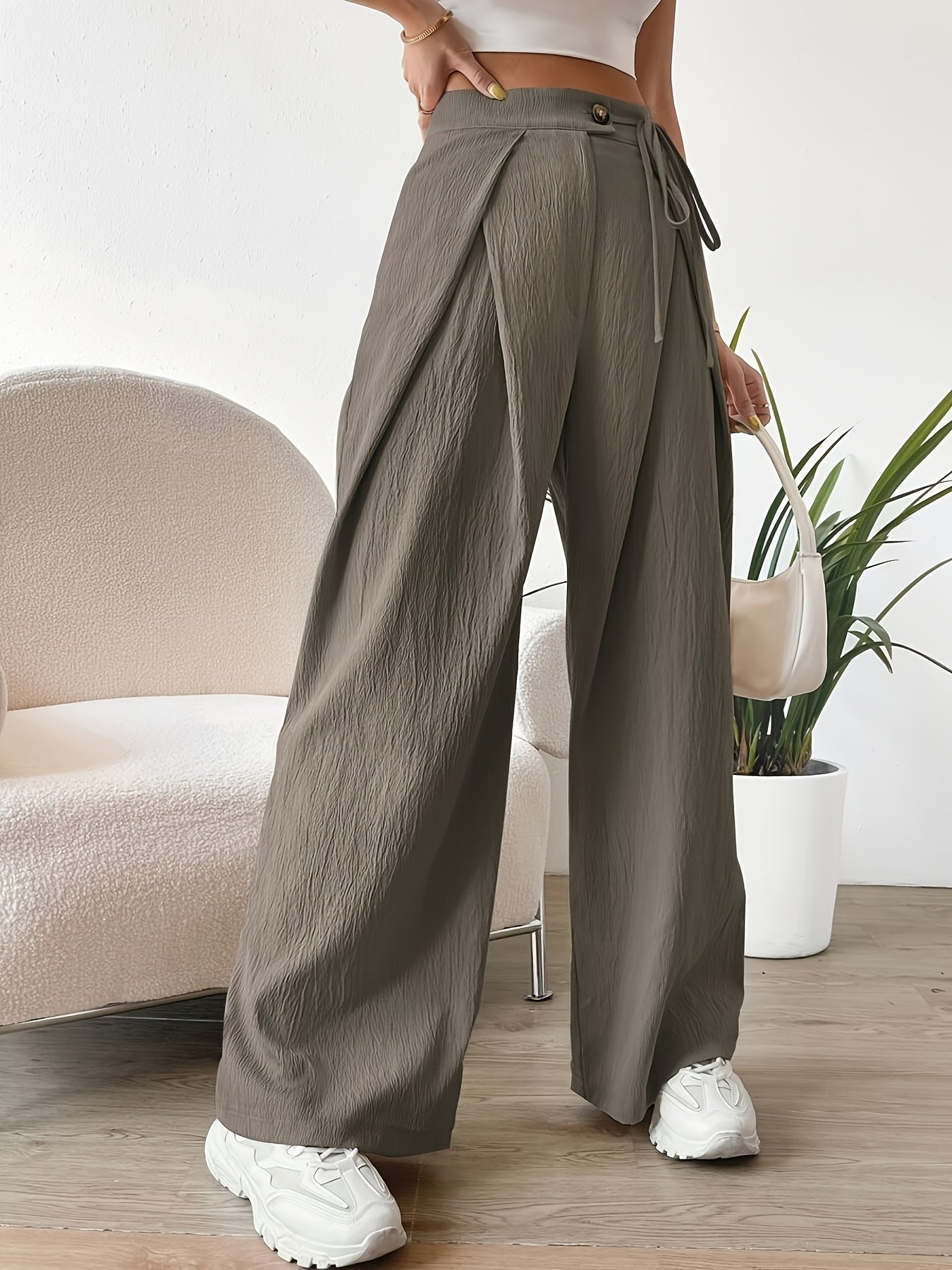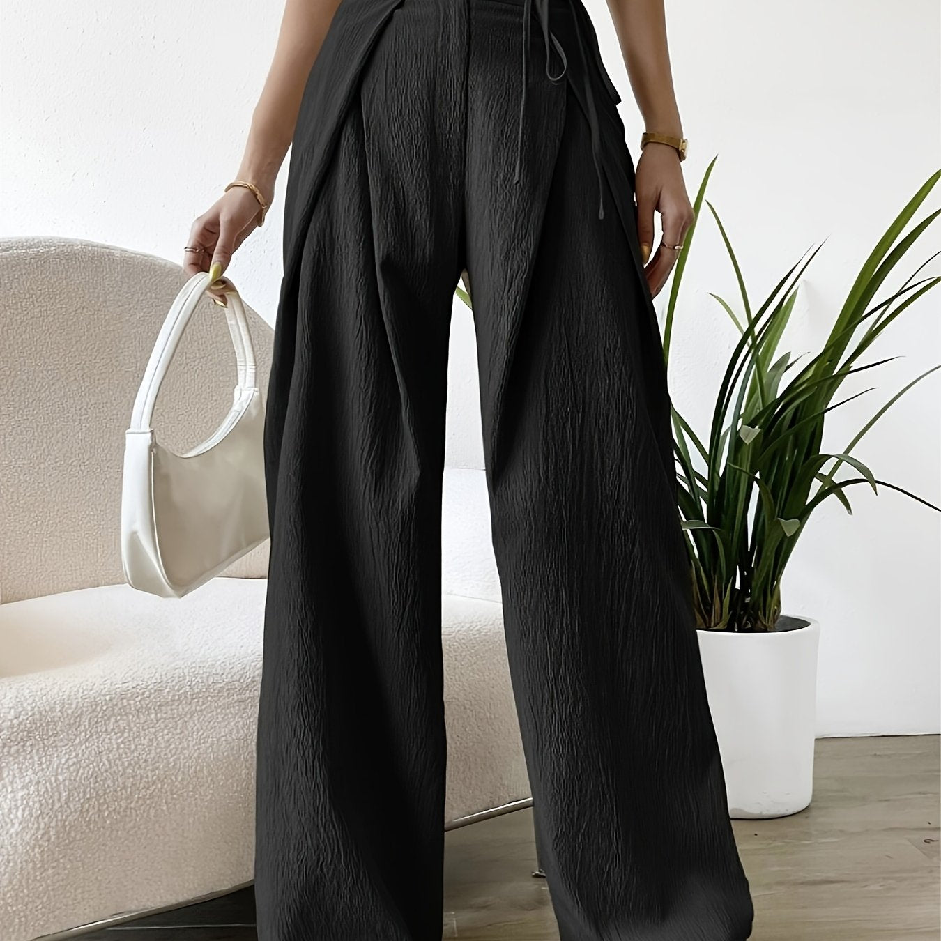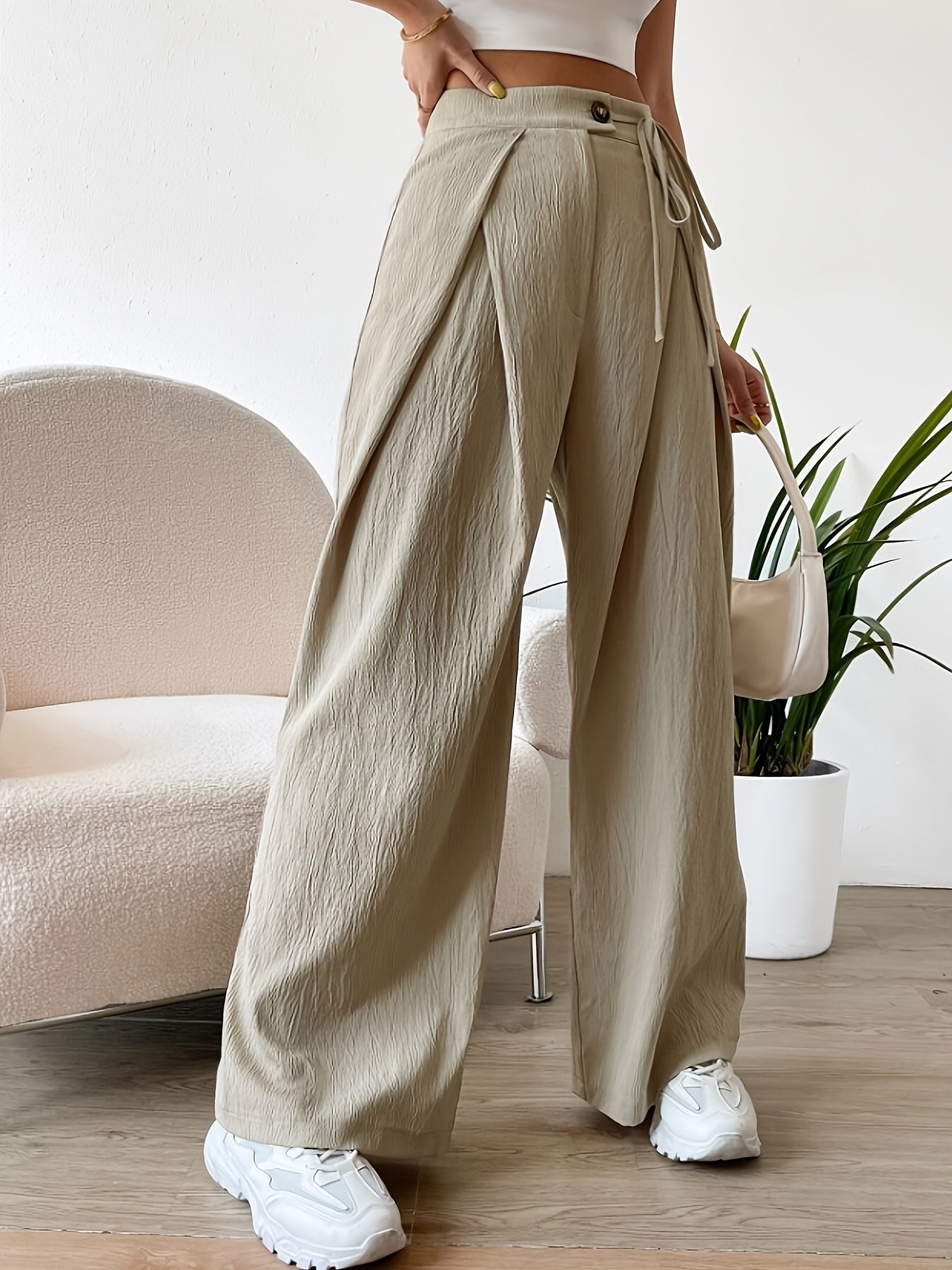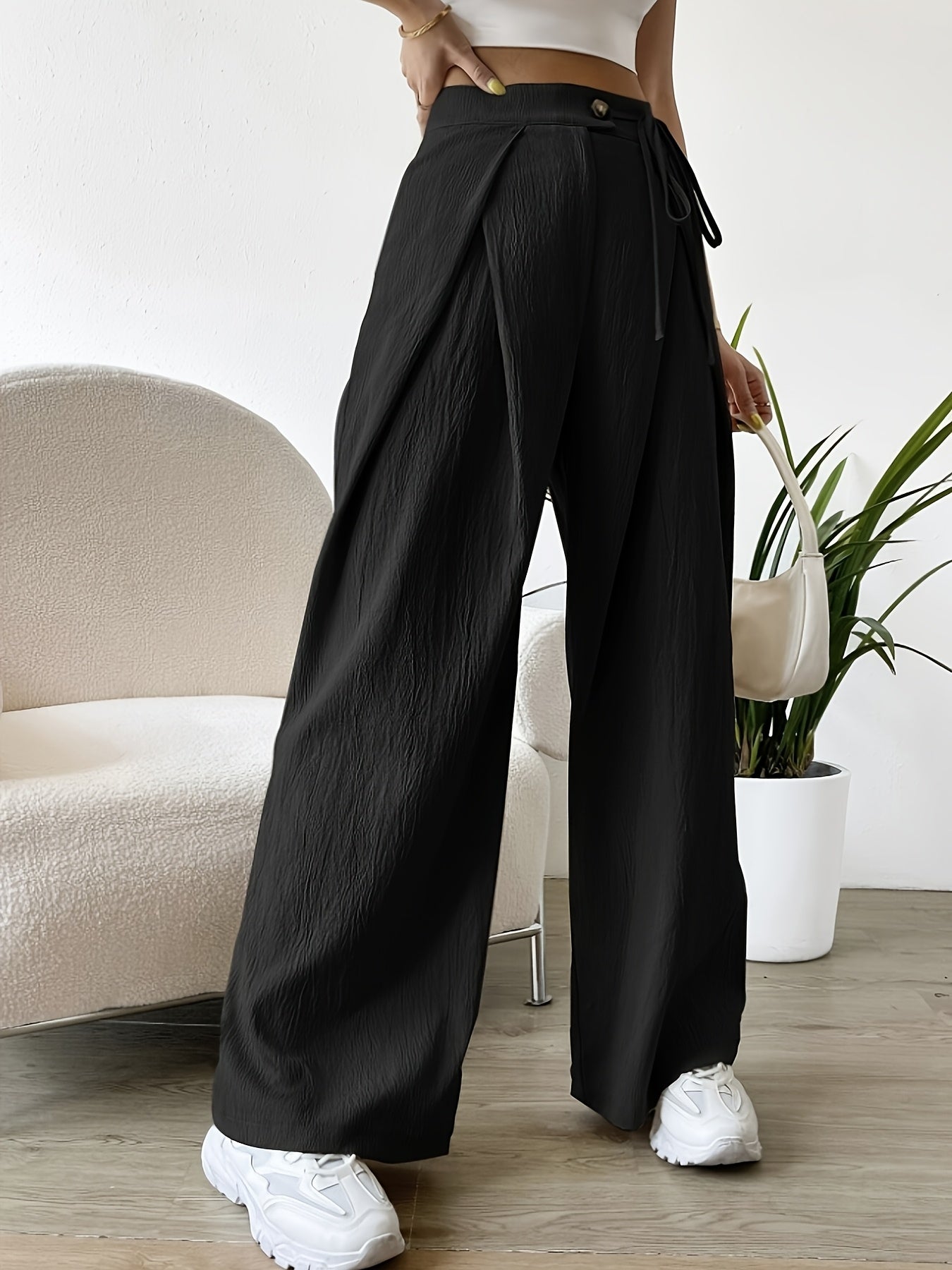 Czarne spodnie z wysokim stanem i plisowanymi detalami oferują maksymalny komfort i wydłużają optycznie nogi. Elastyczny pas ze sznurowaniem pozwala na idealne dopasowanie do sylwetki. Luźny krój sprzyja swobodzie ruchów, czyniąc je idealnym wyborem na każdą porę roku. Gładka tkanina dodaje im elegancji, zachowując codzienną funkcjonalność.
