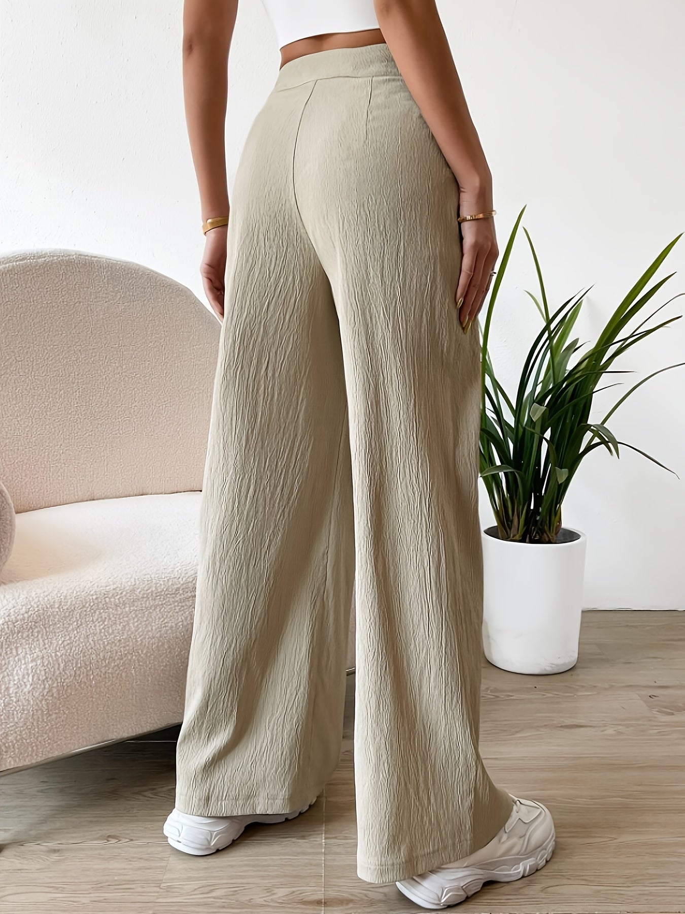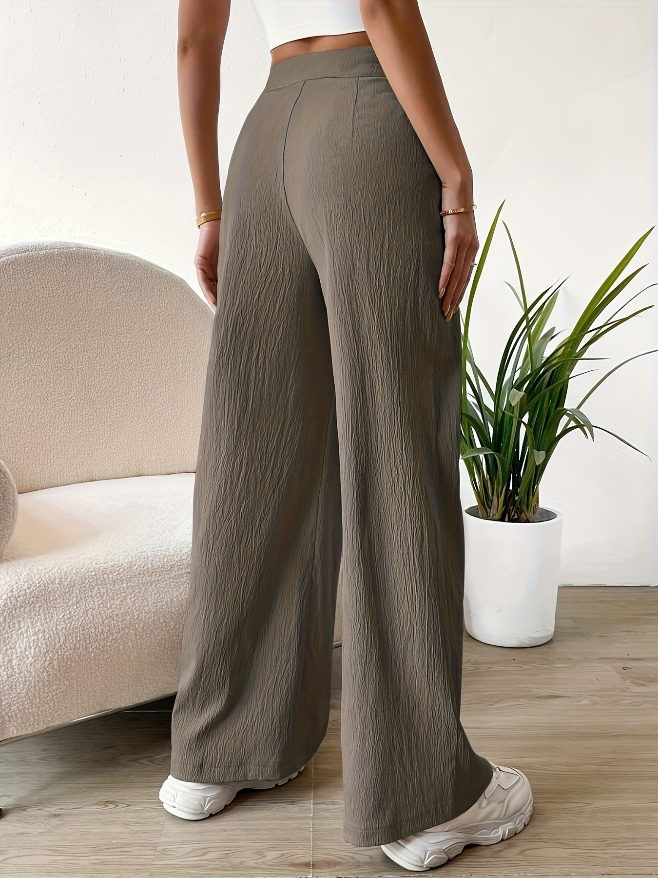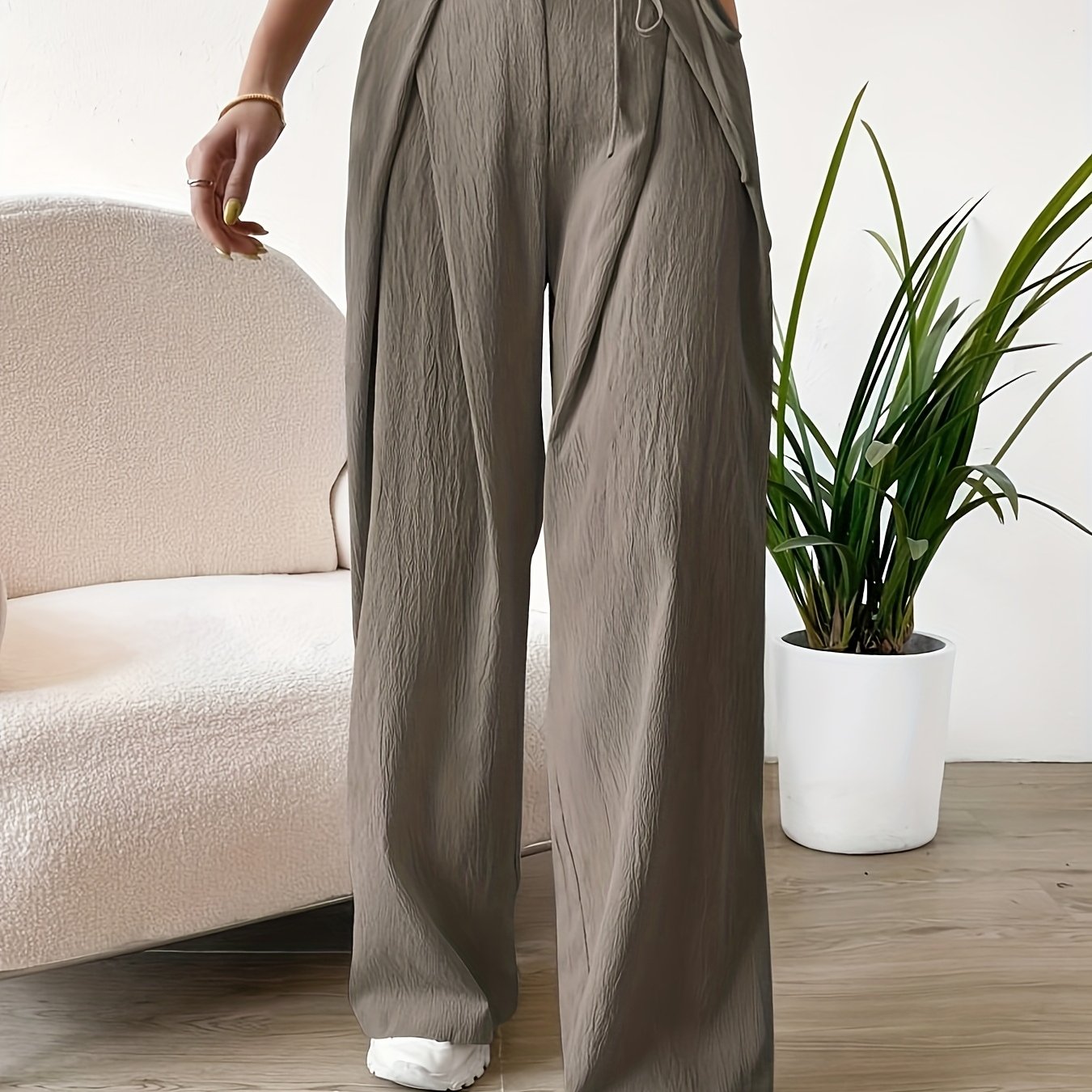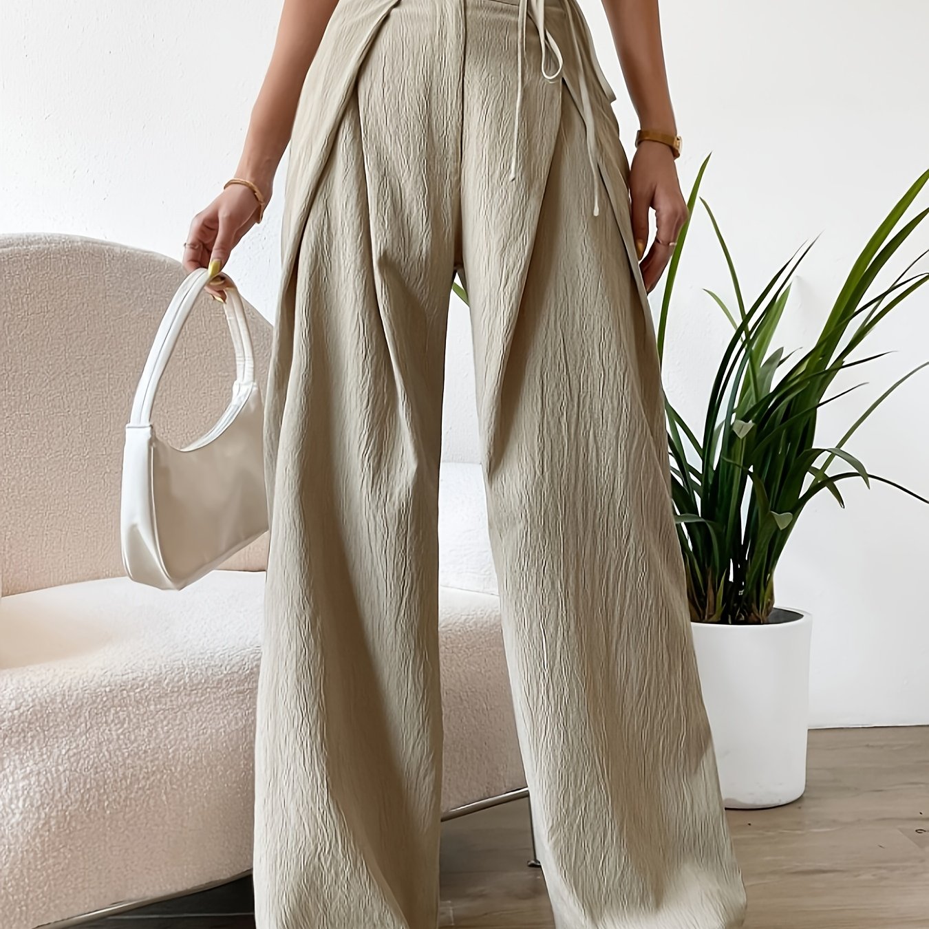 Czarne spodnie z wysokim stanem i plisowanymi detalami oferują maksymalny komfort i wydłużają optycznie nogi. Elastyczny pas ze sznurowaniem pozwala na idealne dopasowanie do sylwetki. Luźny krój sprzyja swobodzie ruchów, czyniąc je idealnym wyborem na każdą porę roku. Gładka tkanina dodaje im elegancji, zachowując codzienną funkcjonalność.