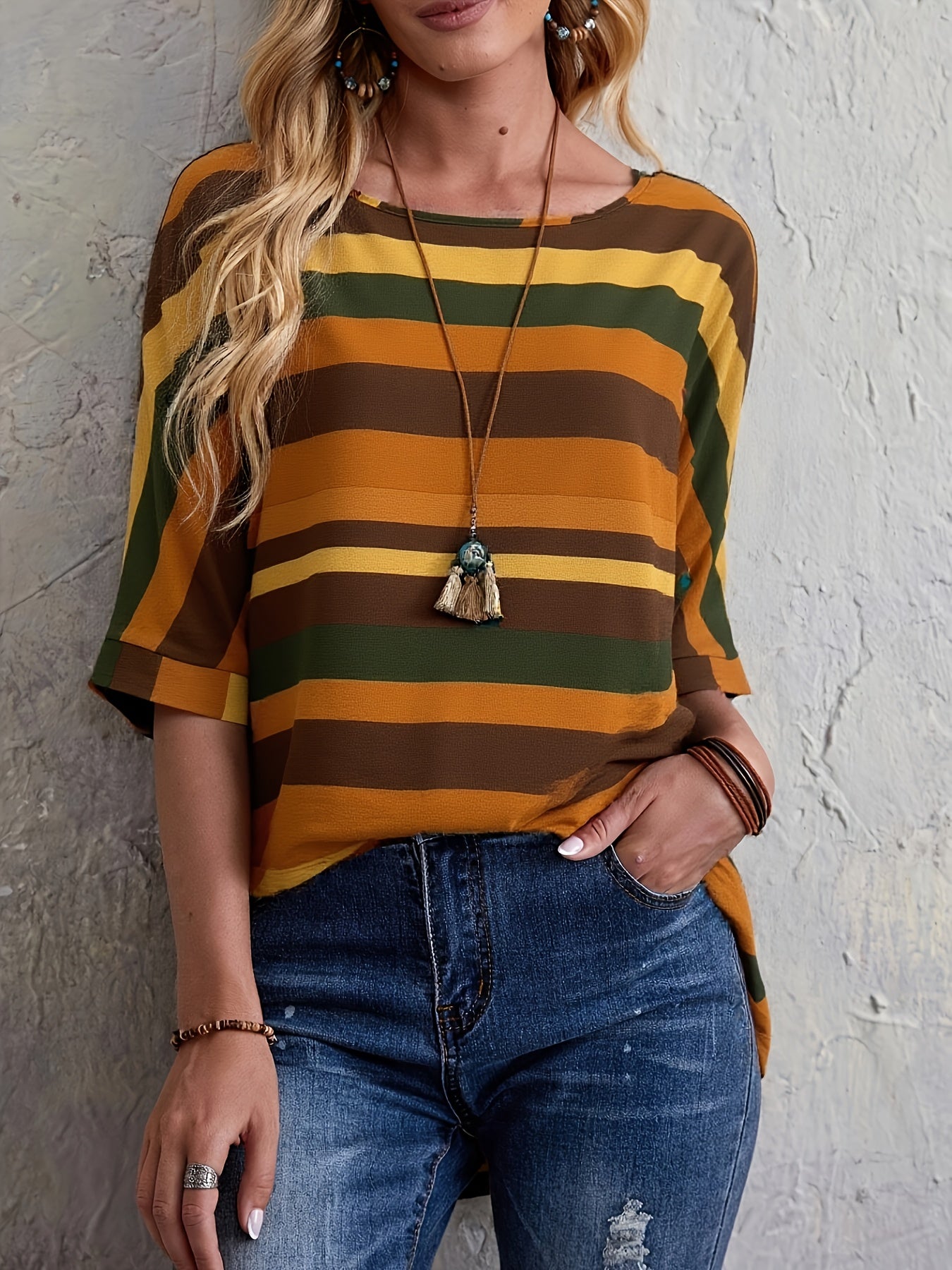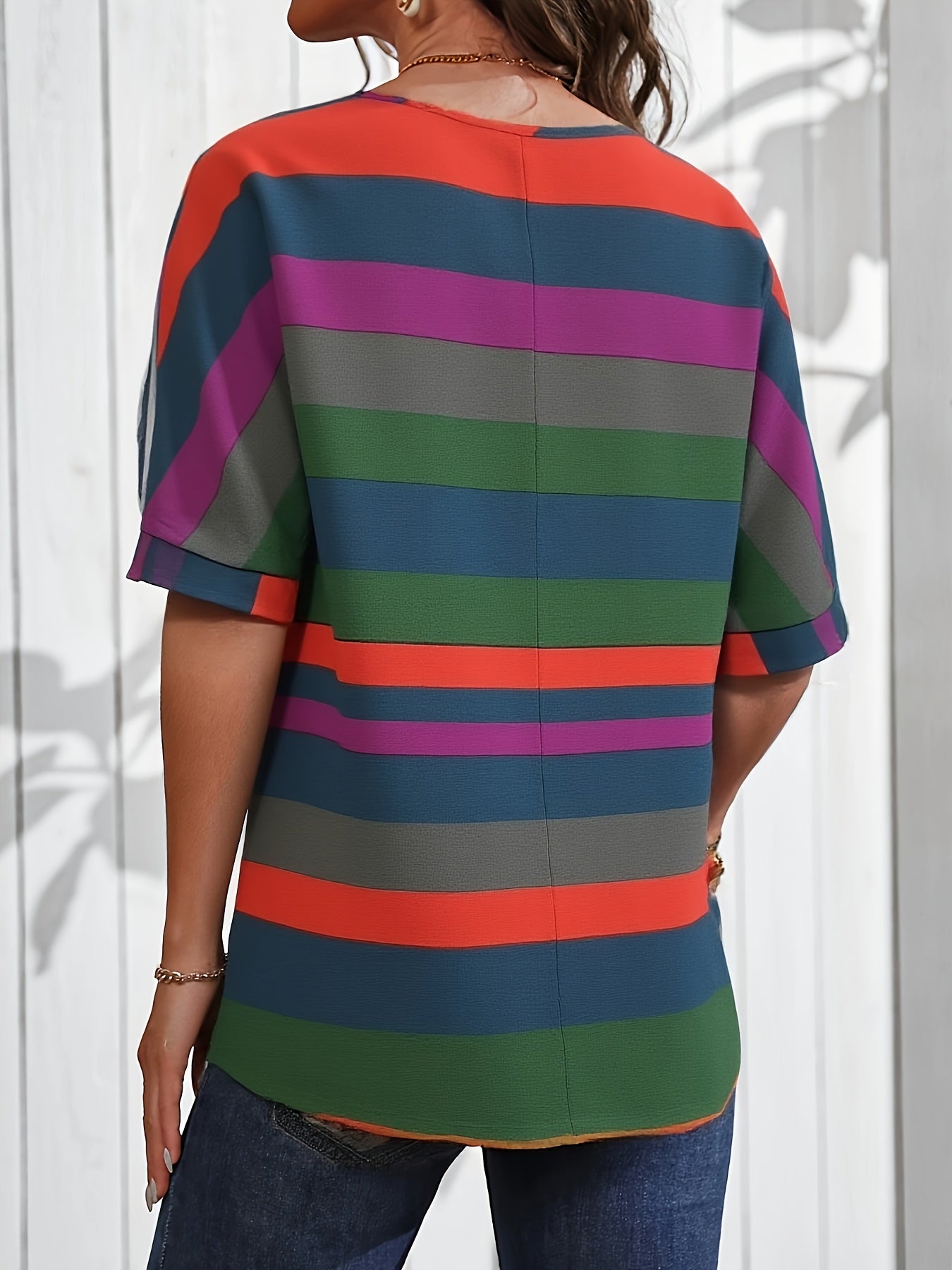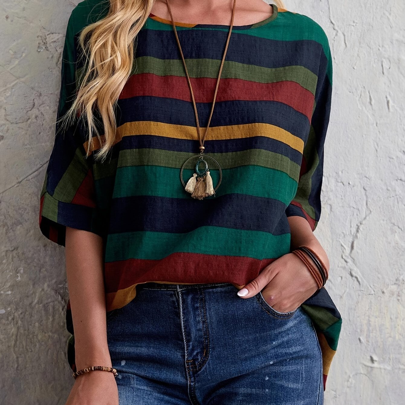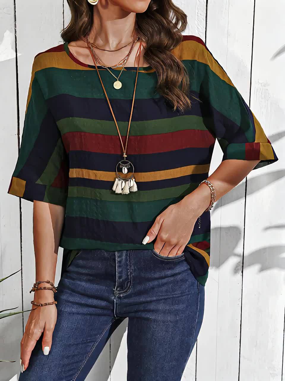 Bluzka Elżbieta to luźna propozycja w paski z rozszerzanymi rękawami i okrągłym dekoltem. Kolorowy blokowy wzór i oddychający materiał sprawiają, że idealnie nadaje się na wiosnę, lato i jesień.