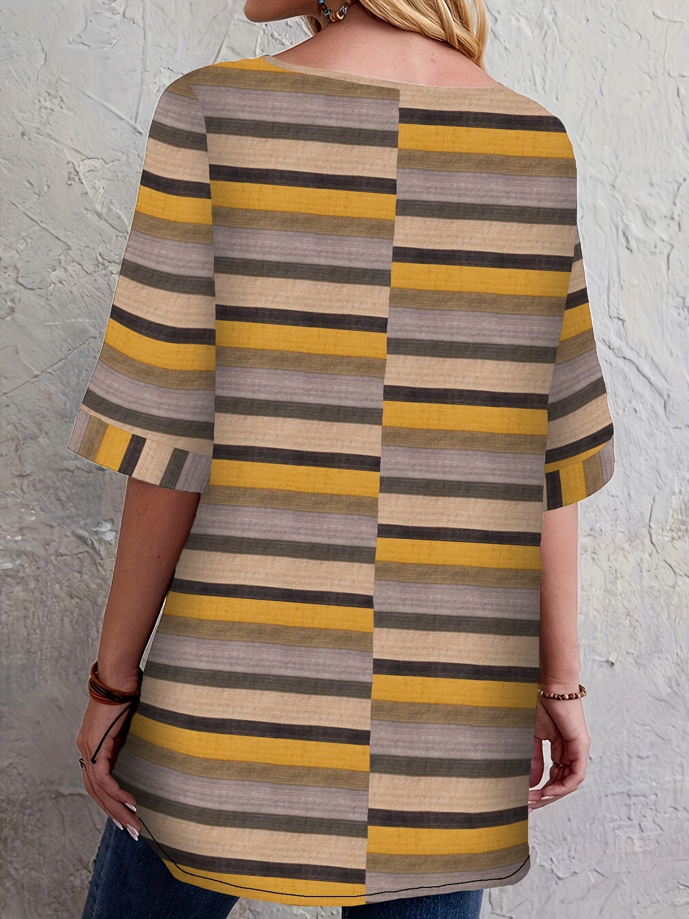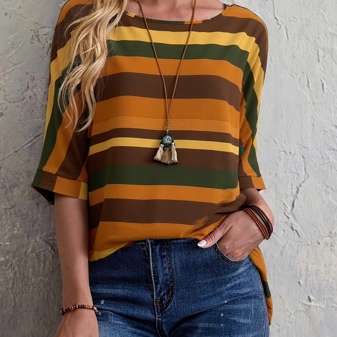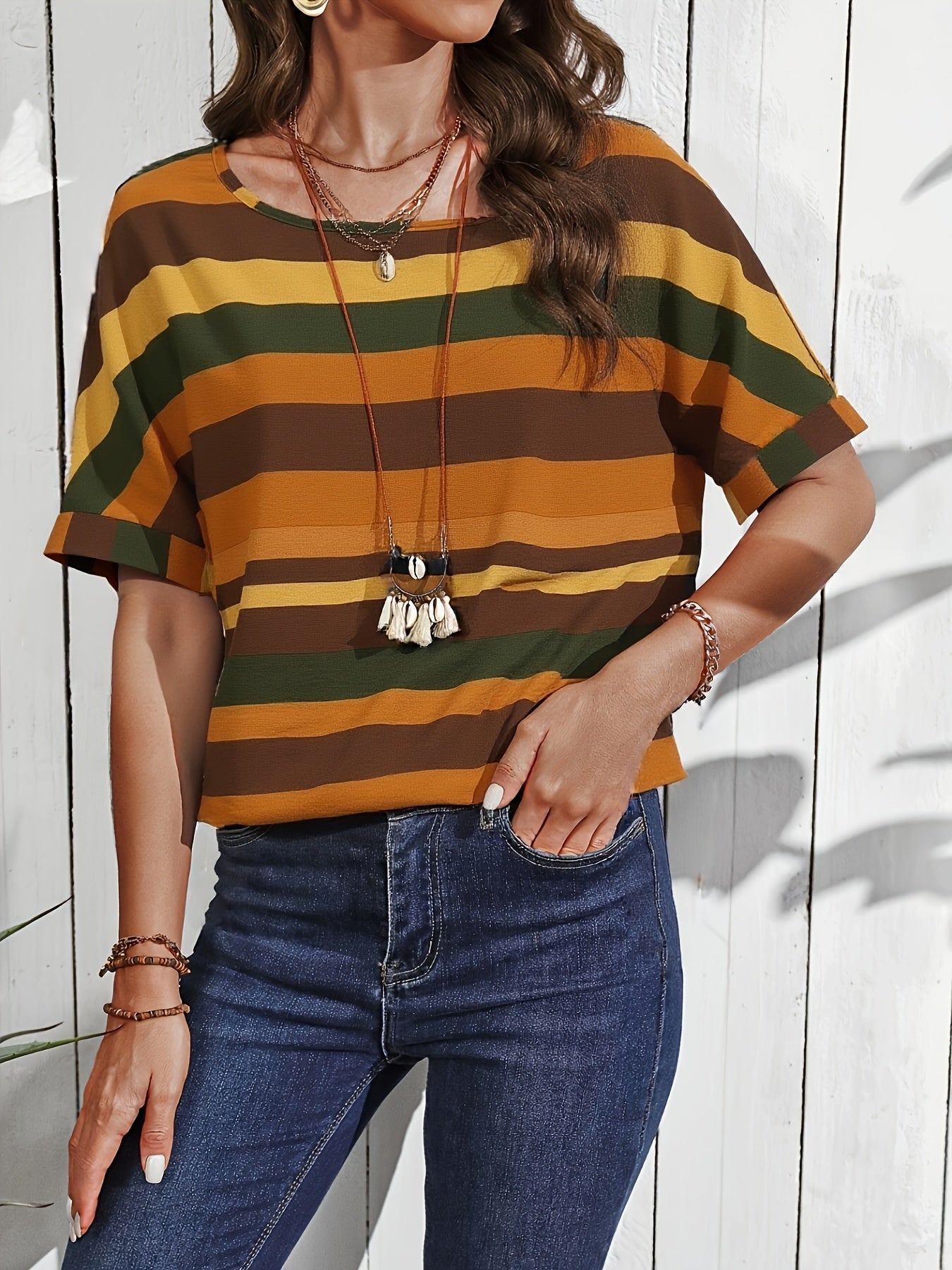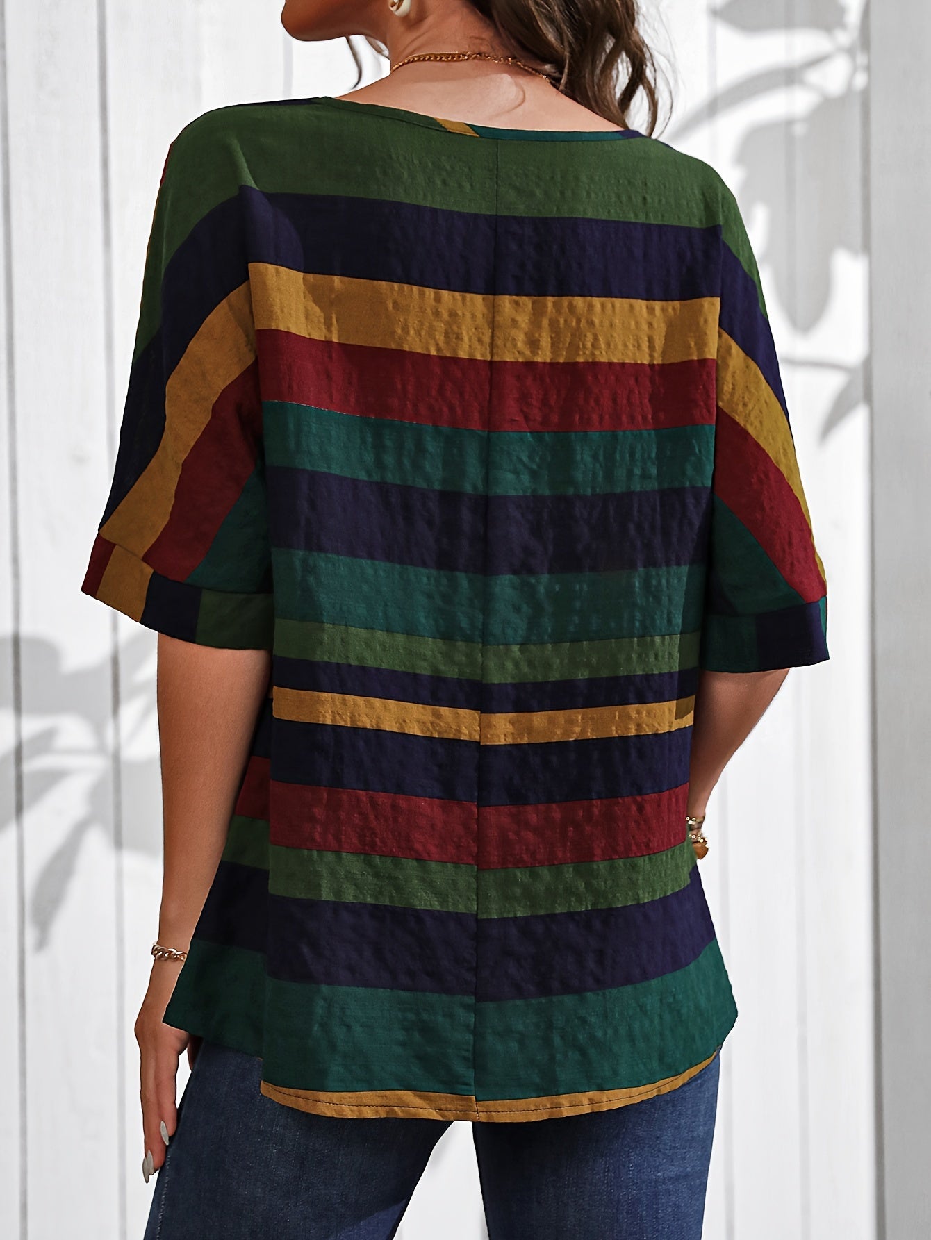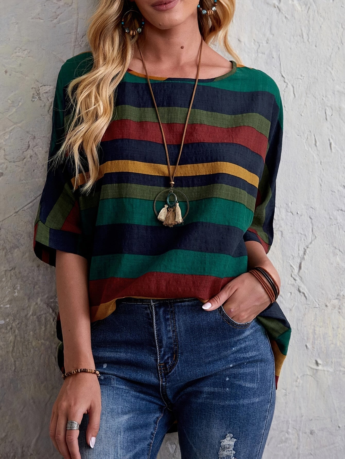 Bluzka Elżbieta to luźna propozycja w paski z rozszerzanymi rękawami i okrągłym dekoltem. Kolorowy blokowy wzór i oddychający materiał sprawiają, że idealnie nadaje się na wiosnę, lato i jesień.