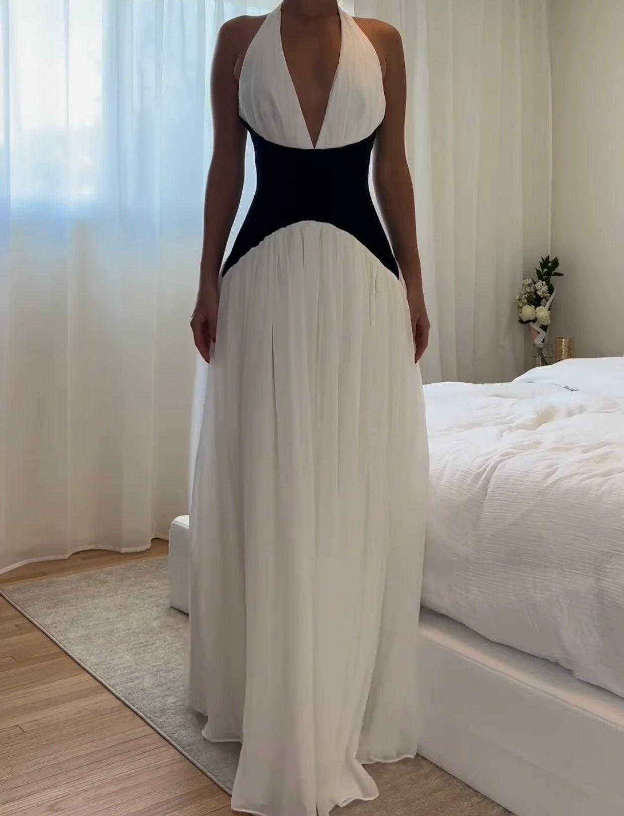Modna, seksowna sukienka typu sling z dekoltem w serek, dopasowana kolorystycznie, z przeszyciami w talii