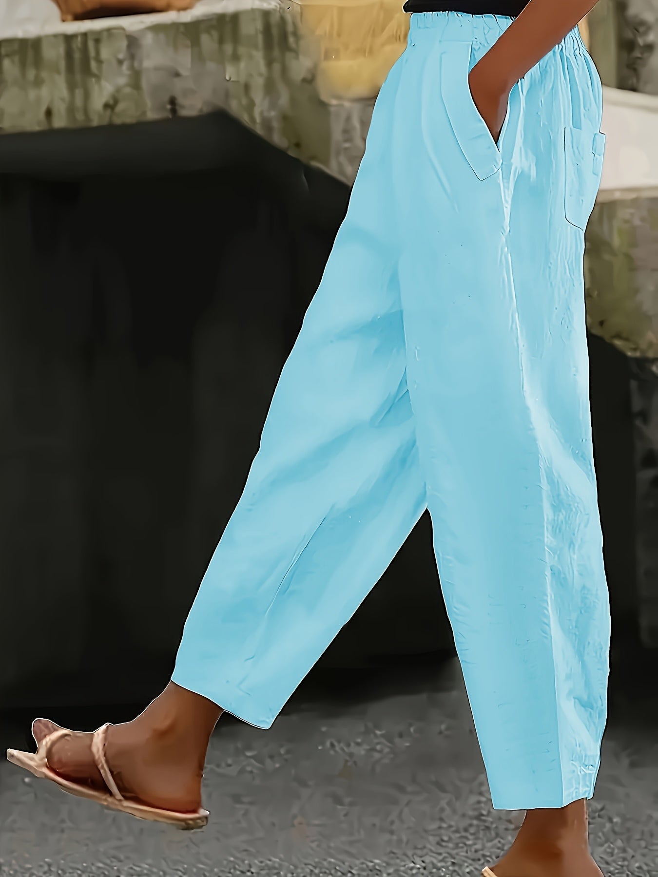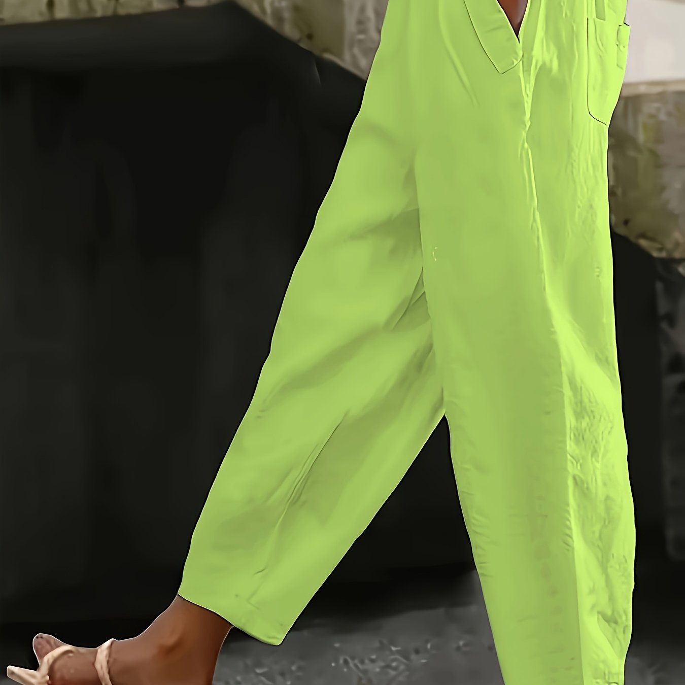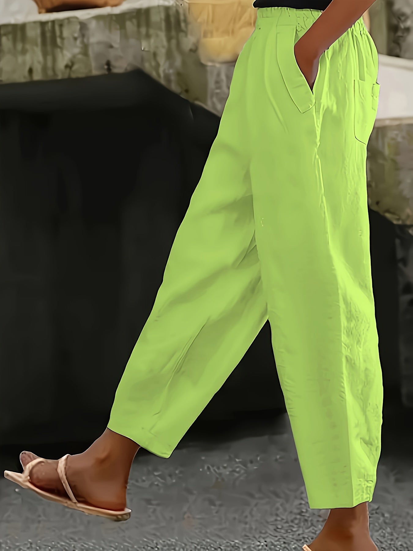 Jasnozielone spodnie capri z szerokimi nogawkami zapewniają lekkość i wygodę w letnich stylizacjach. Elastyczny pas ze sznurkiem ułatwia dopasowanie, a przewiewna bawełna sprawia, że świetnie sprawdzą się w upalne dni. Ich prosty krój i jednolity kolor pasują do wielu okazji. Idealne do codziennego noszenia i letnich spacerów.
