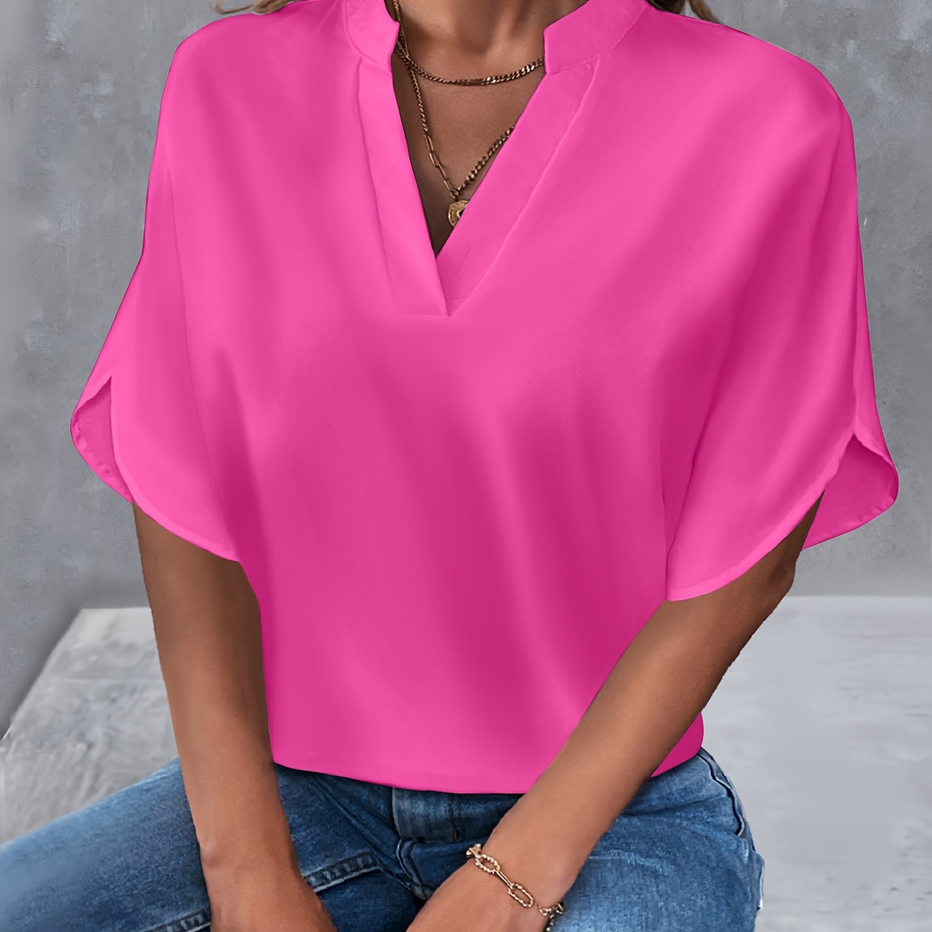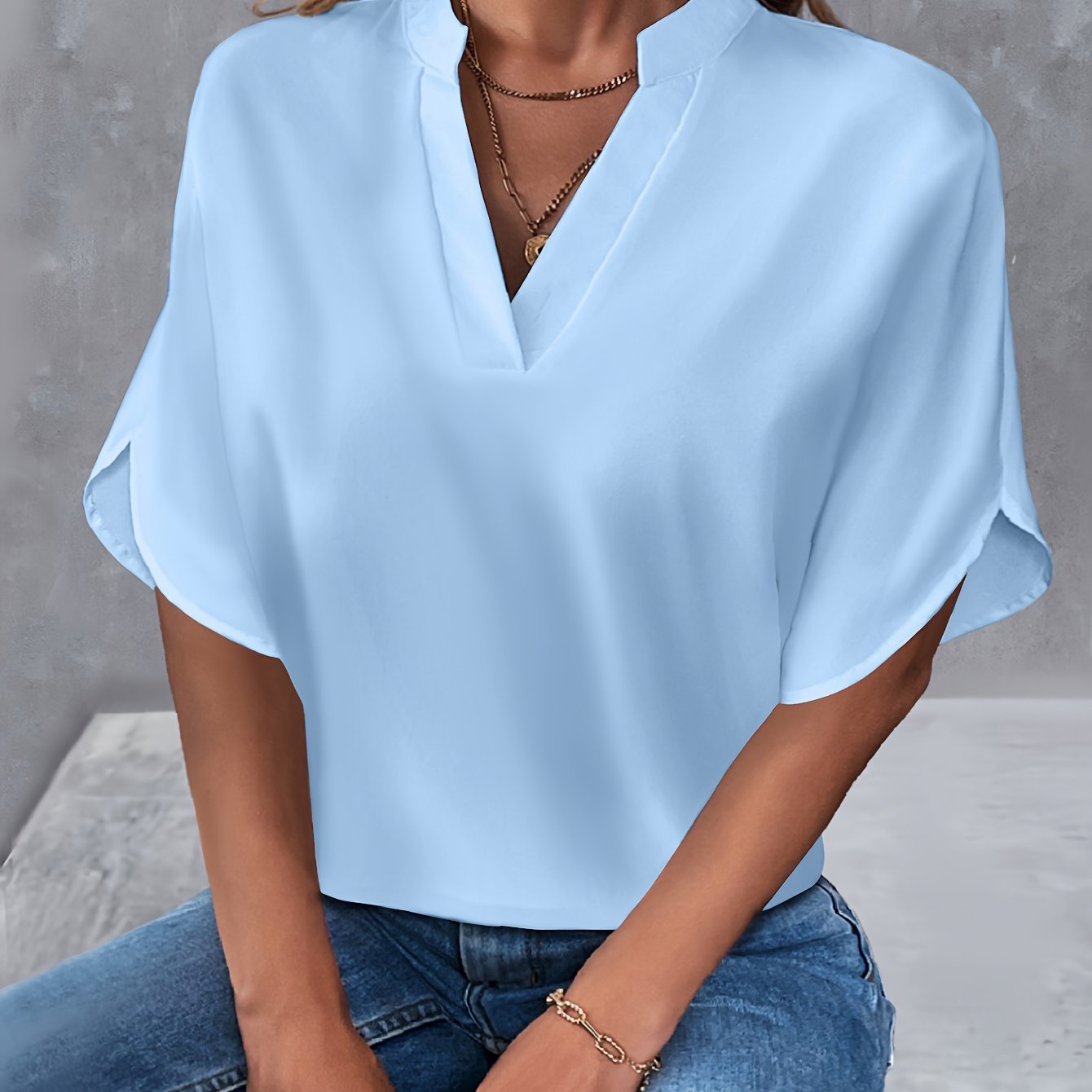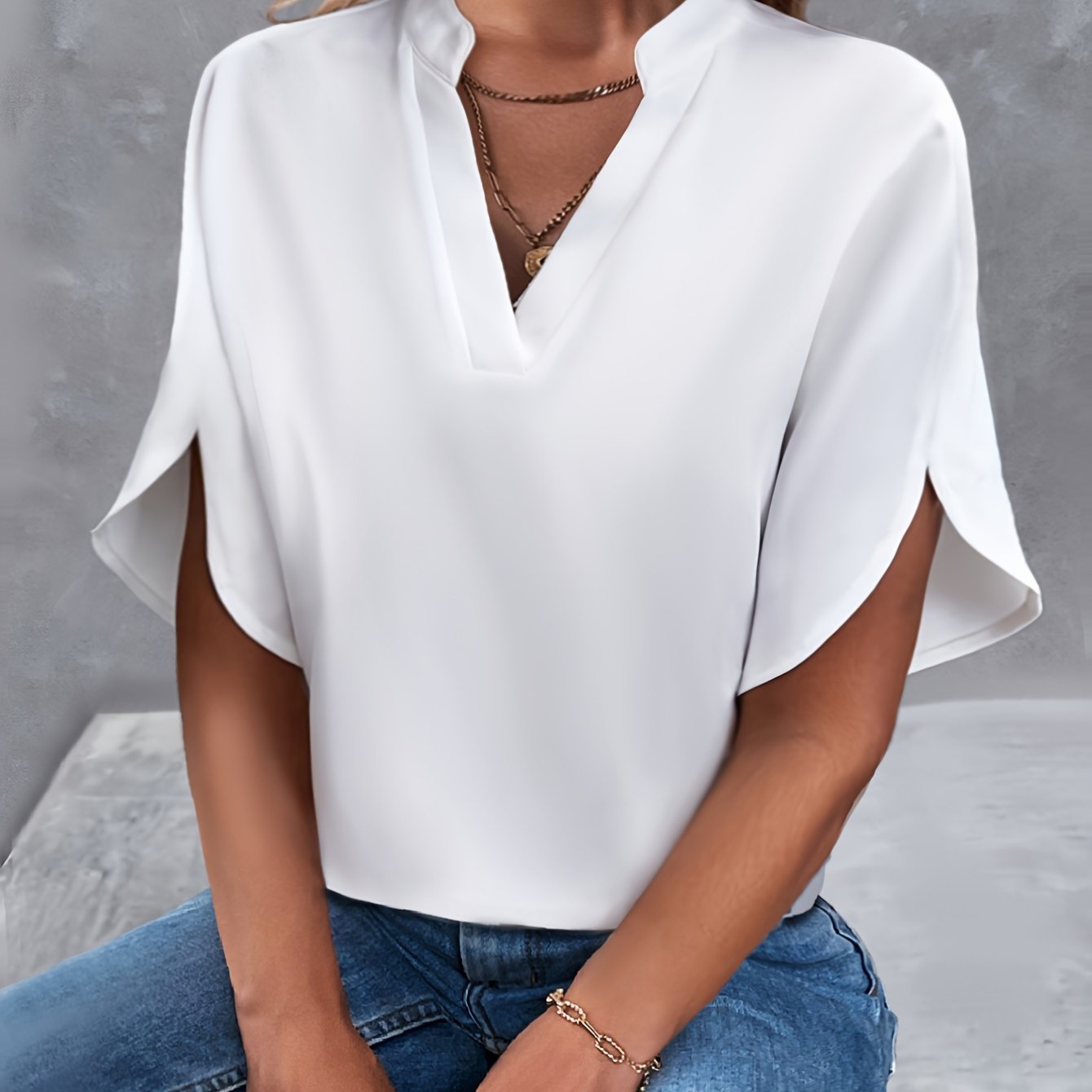 Bluzka z wyciętym dekoltem i rozcięciem, idealna na wiosnę i lato. Jej jednolity kolor i swobodny krój czynią ją łatwą do dopasowania do wielu stylizacji. Komfortowy materiał gwarantuje wygodę w codziennym użytkowaniu.