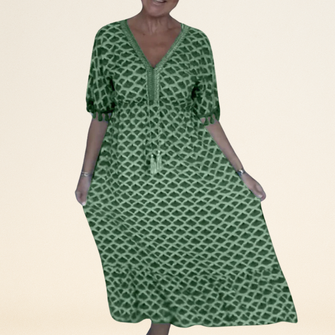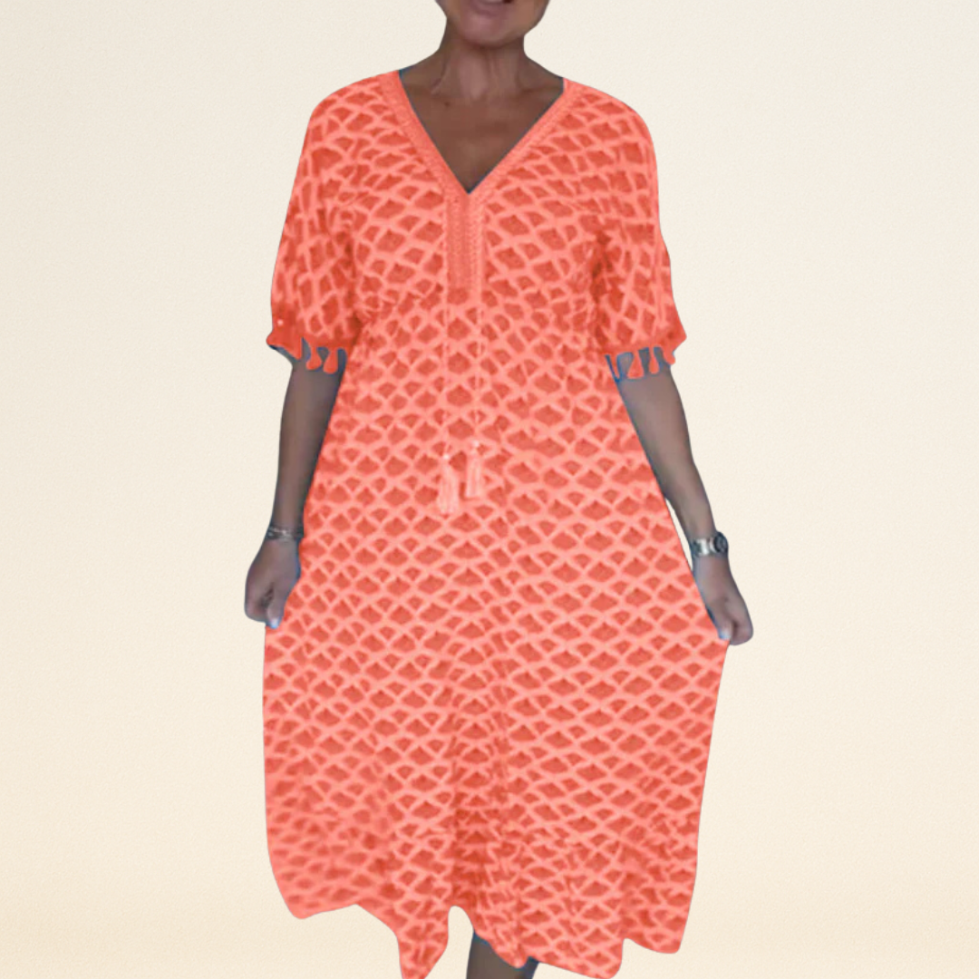 Poczuj niewymuszoną elegancję z sukienką Jelly Embellished V-Neck Dress – olśniewającą sukienką maxi, która łączy w sobie radosny urok z kobiecą gracją. Zaprojektowana dla osób ceniących niewymuszony styl, ta opływowa sylwetka wyróżnia się atrakcyjnym dekoltem w serek i frędzlami, które falują z każdym krokiem.