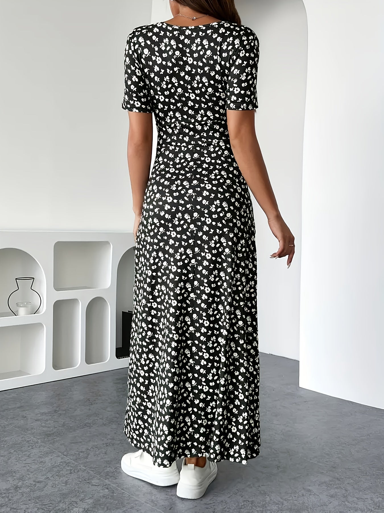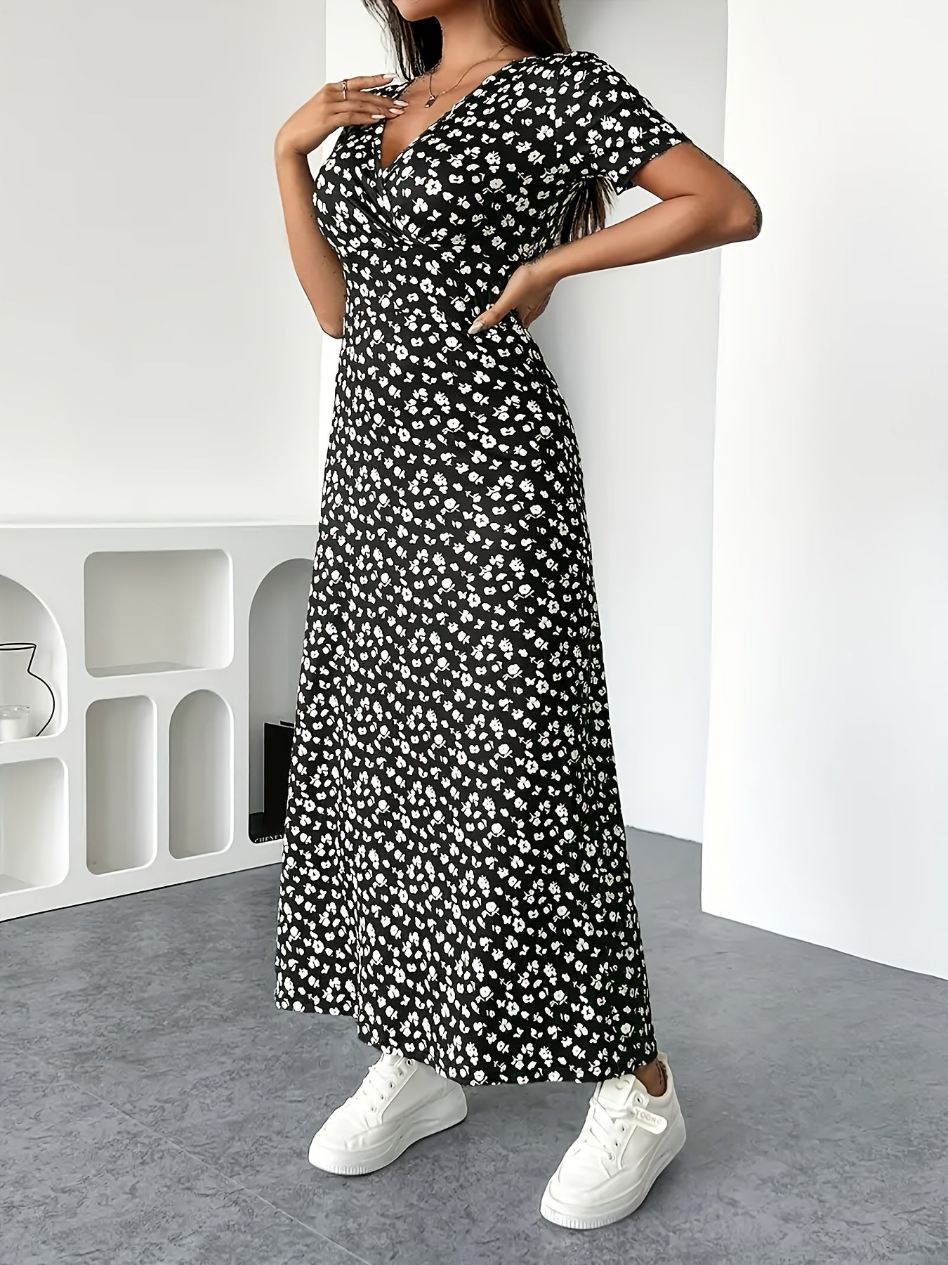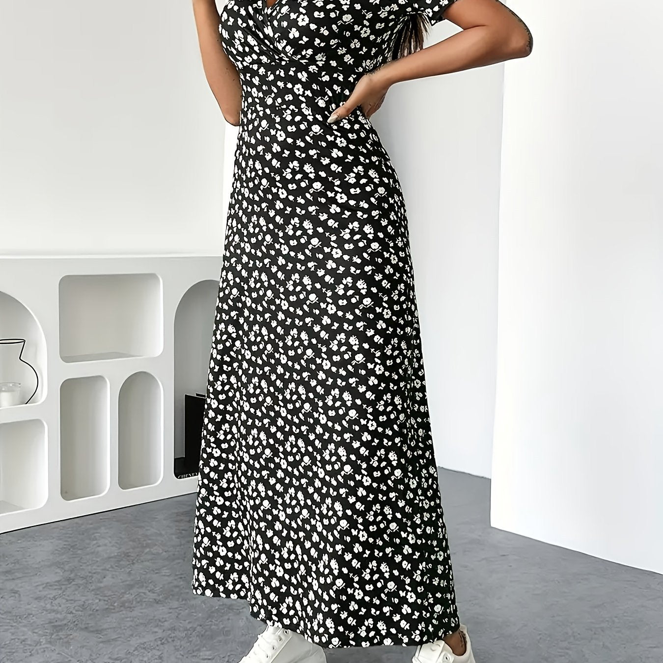 Czarno-biała sukienka z kwiatowym nadrukiem i dekoltem w kształcie litery V łączy swobodę z subtelną elegancją. Krótki rękaw i dopasowany pas pięknie akcentują figurę, a elastyczna tkanina zapewnia wygodę. Lekki krój w linii A sprawia, że sukienka idealnie nadaje się na wiosnę, lato i jesień. Kwiatowy wzór dodaje świeżości i podnosi nastrój.