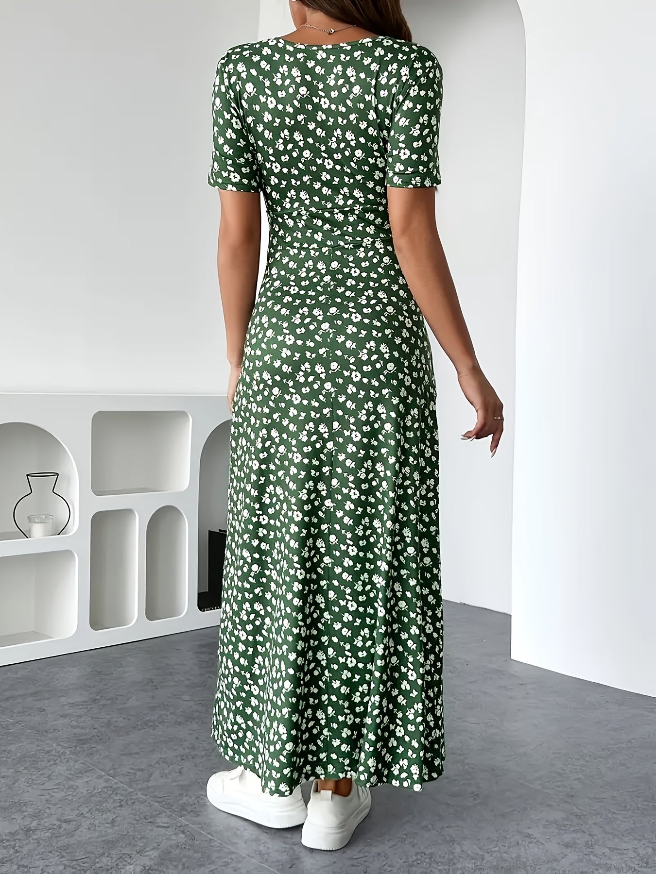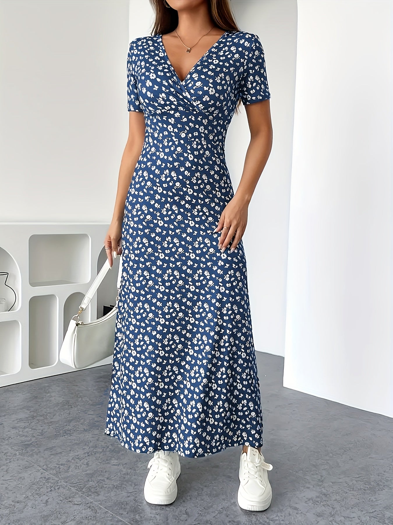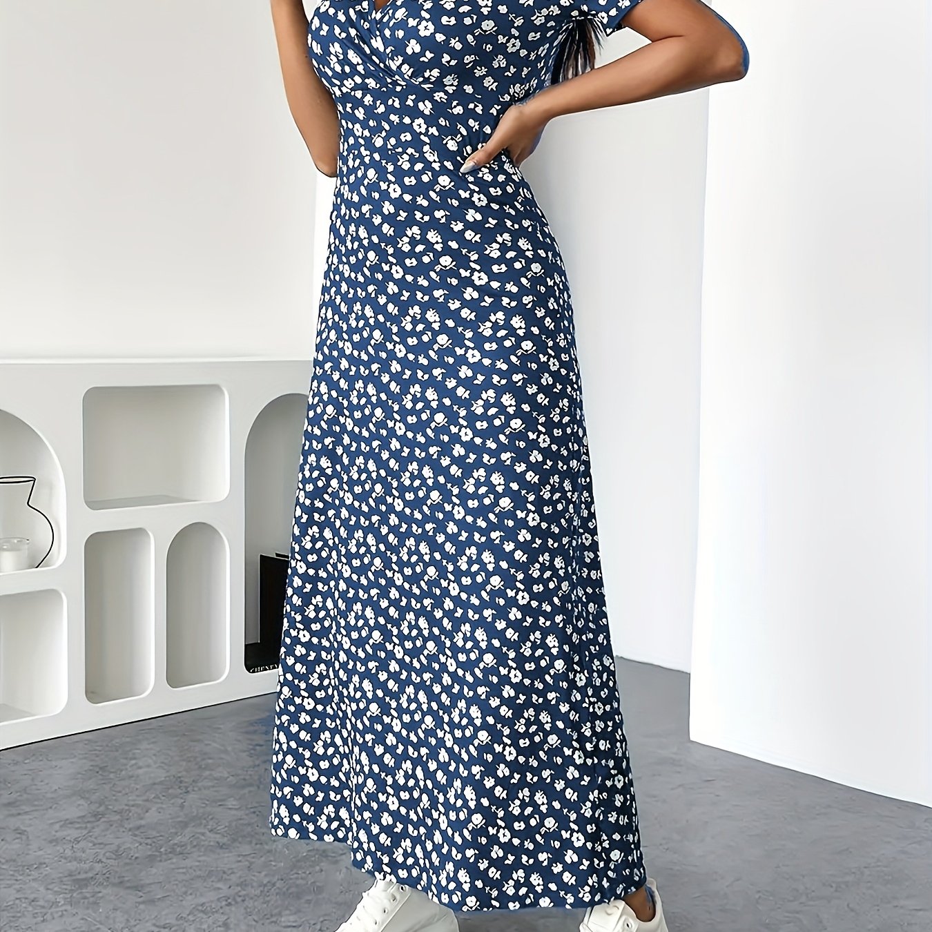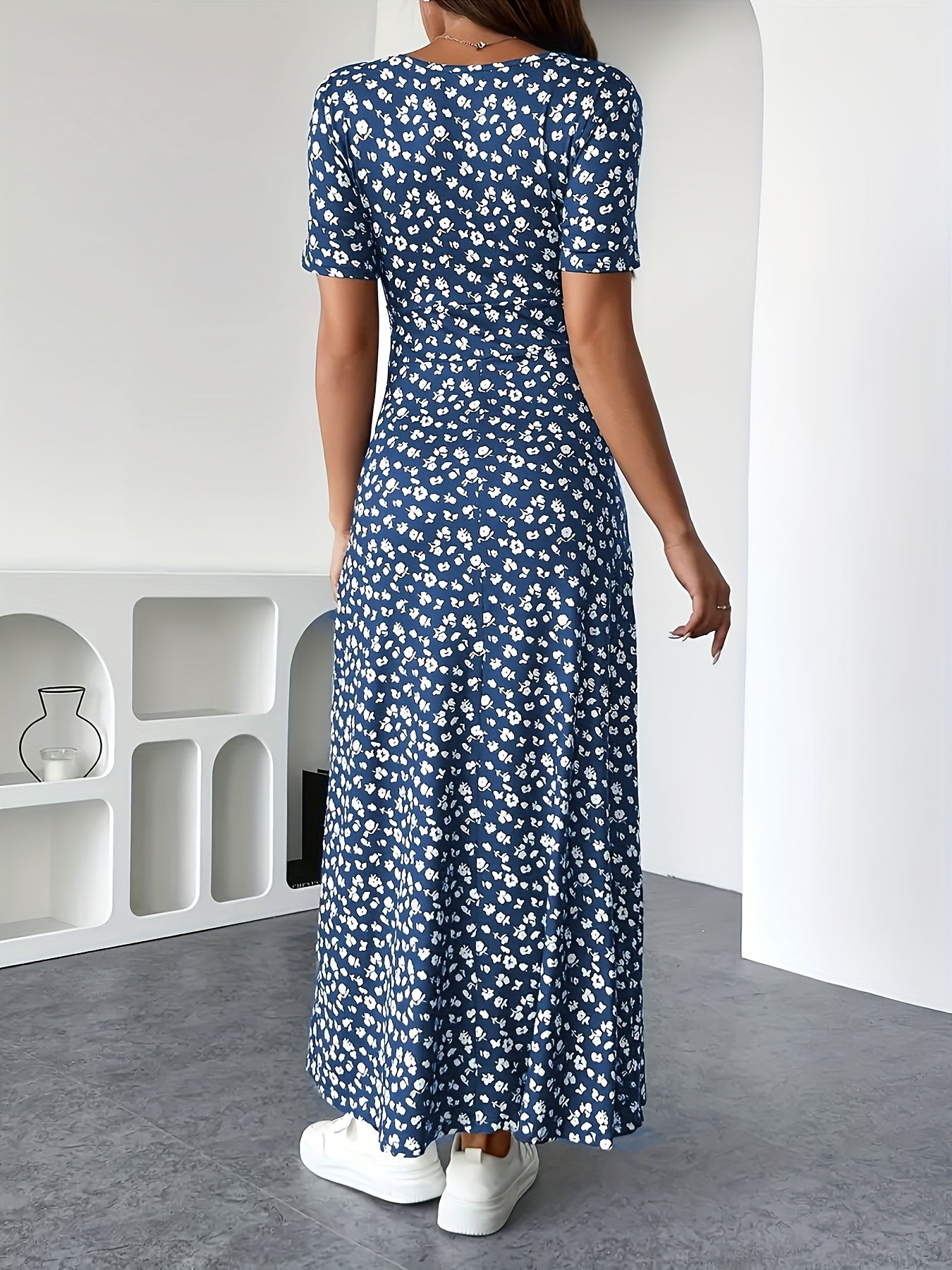 Czarno-biała sukienka z kwiatowym nadrukiem i dekoltem w kształcie litery V łączy swobodę z subtelną elegancją. Krótki rękaw i dopasowany pas pięknie akcentują figurę, a elastyczna tkanina zapewnia wygodę. Lekki krój w linii A sprawia, że sukienka idealnie nadaje się na wiosnę, lato i jesień. Kwiatowy wzór dodaje świeżości i podnosi nastrój.