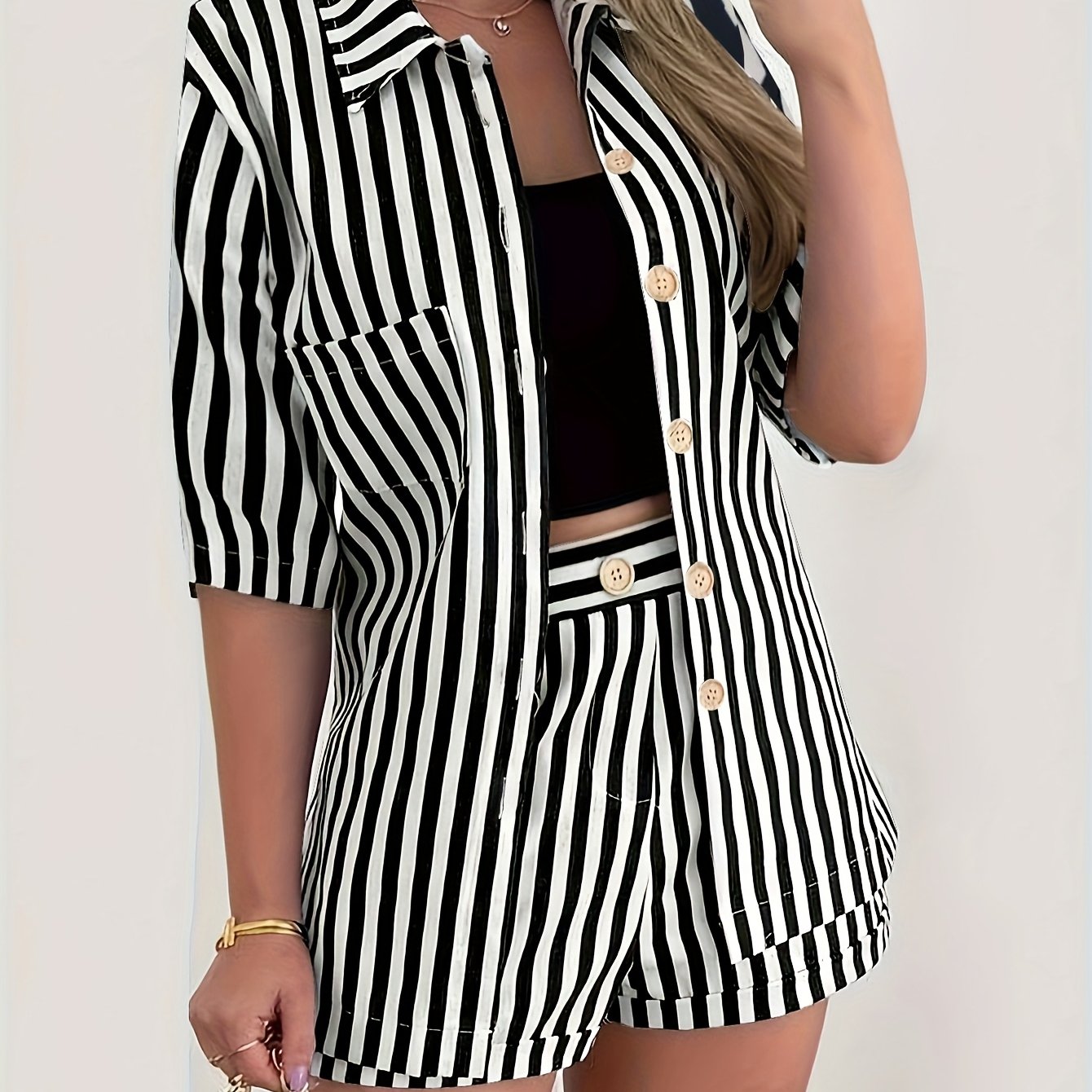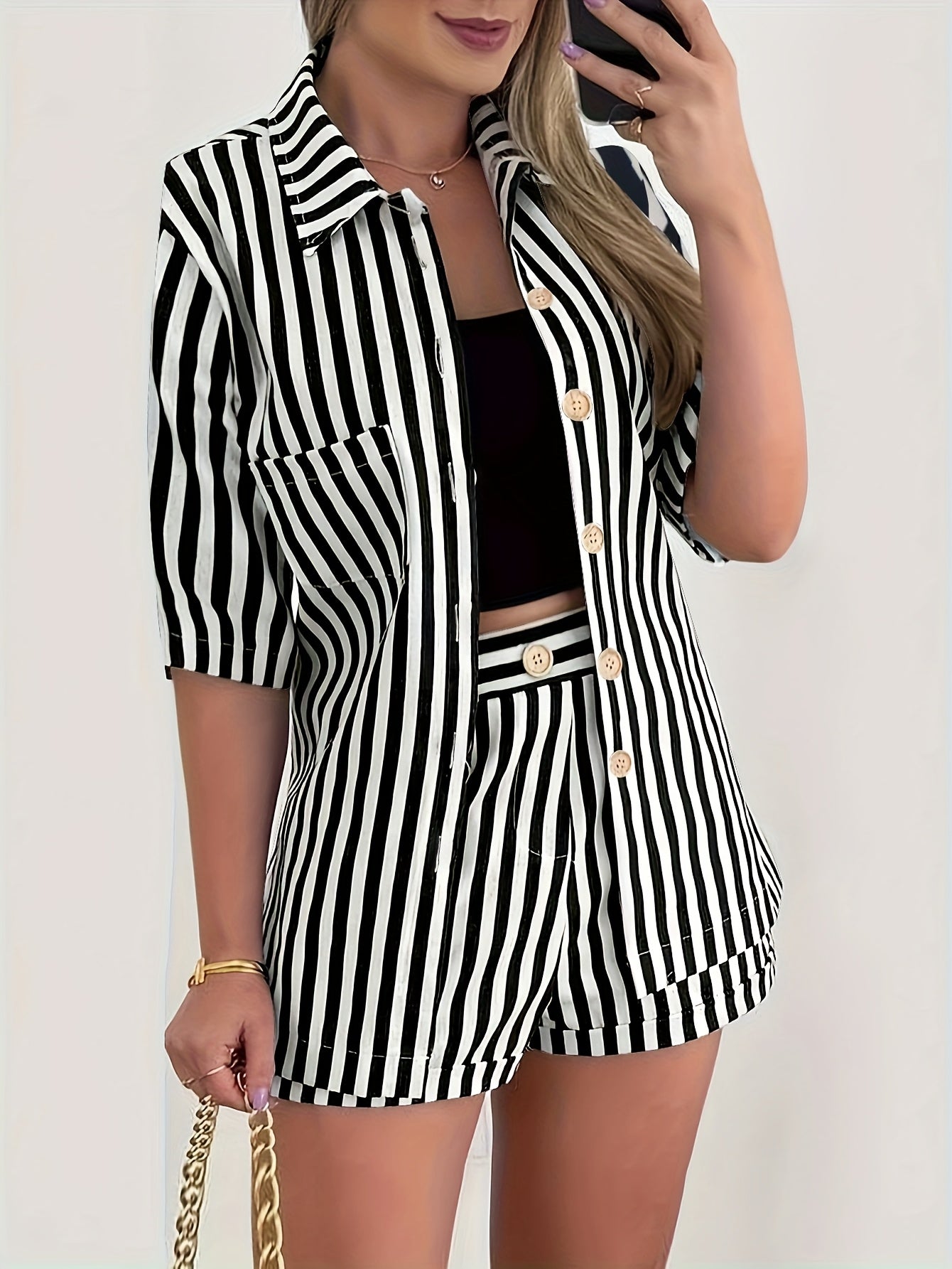 Zestaw Justyna łączy krótki rękaw z guzikami i szorty z wysokim stanem w modny wzór w paski. Mikroelastyczna tkanina zapewnia wygodę, a elegancki krój czyni go uniwersalnym na lato.