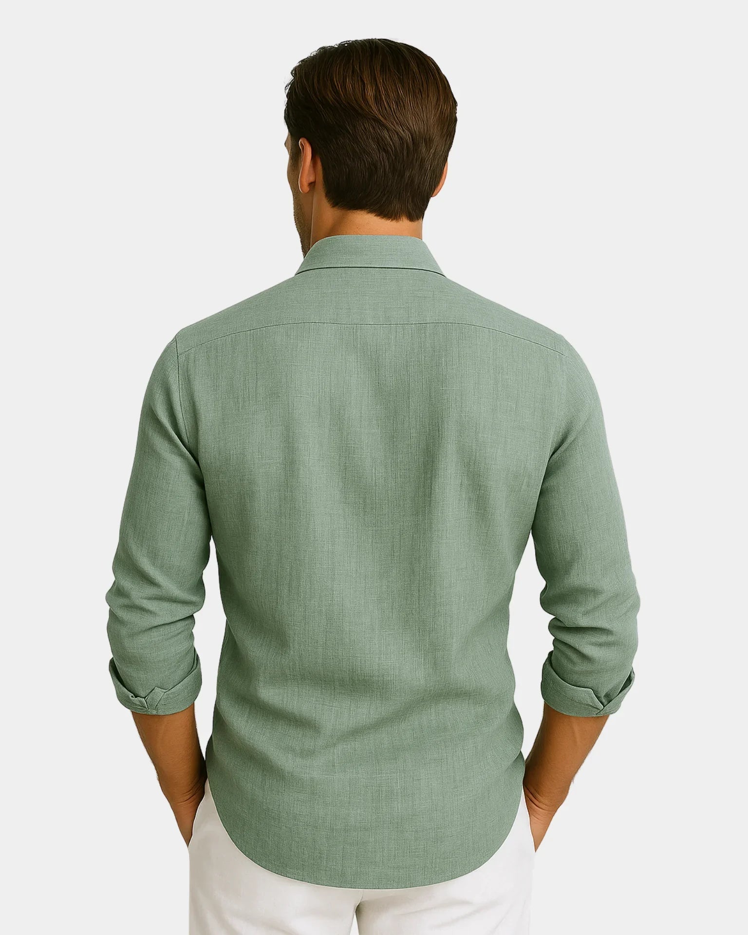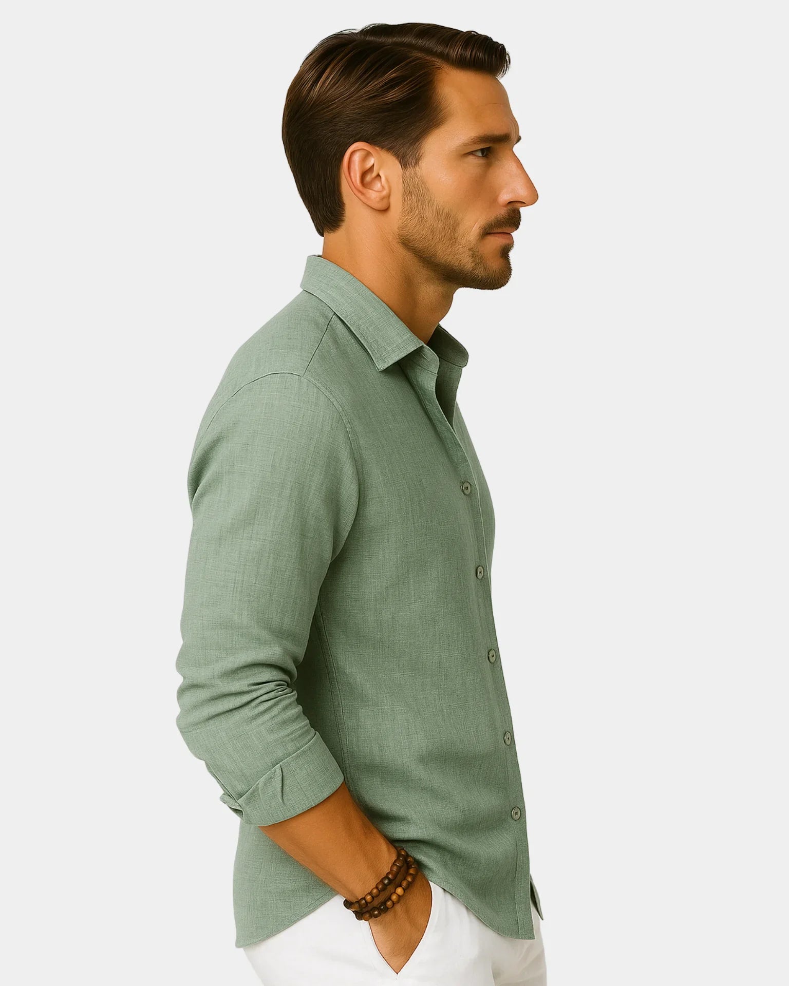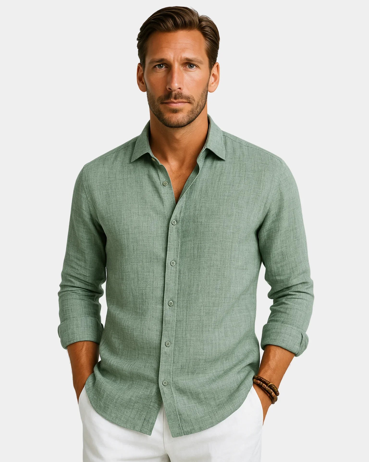 Model Kacper – lniana koszula został zaprojektowany z eleganckim kołnierzykiem typu spread, wzmocnionymi szwami i naturalnymi guzikami z muszli, co zapewnia idealną równowagę między wyraźną formą a swobodnym luksusem — to niezbędny element każdej wyrafinowanej garderoby.