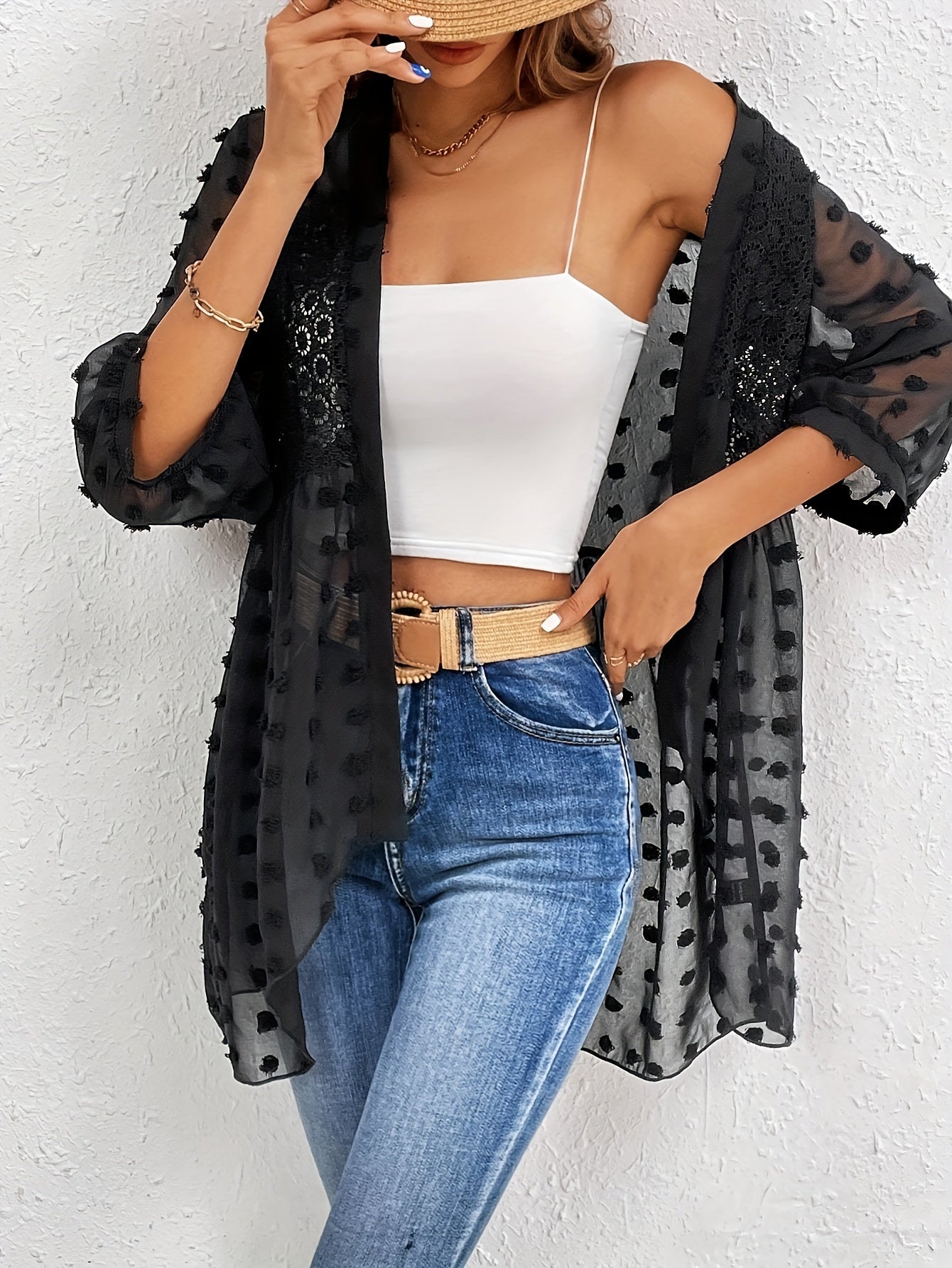 Elegancki kardigan z otwartym przodem w kratę, idealny na cały rok. Wykonany z mieszanki poliestru, lekki i łatwy w pielęgnacji. Sprawdzi się jako uzupełnienie casualowych i eleganckich stylizacji.