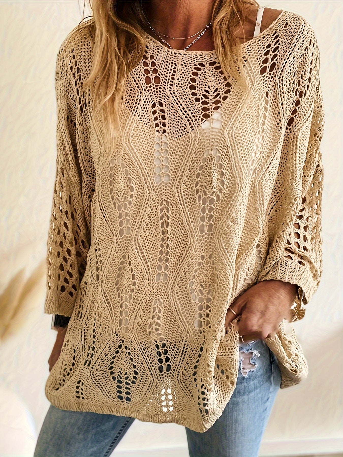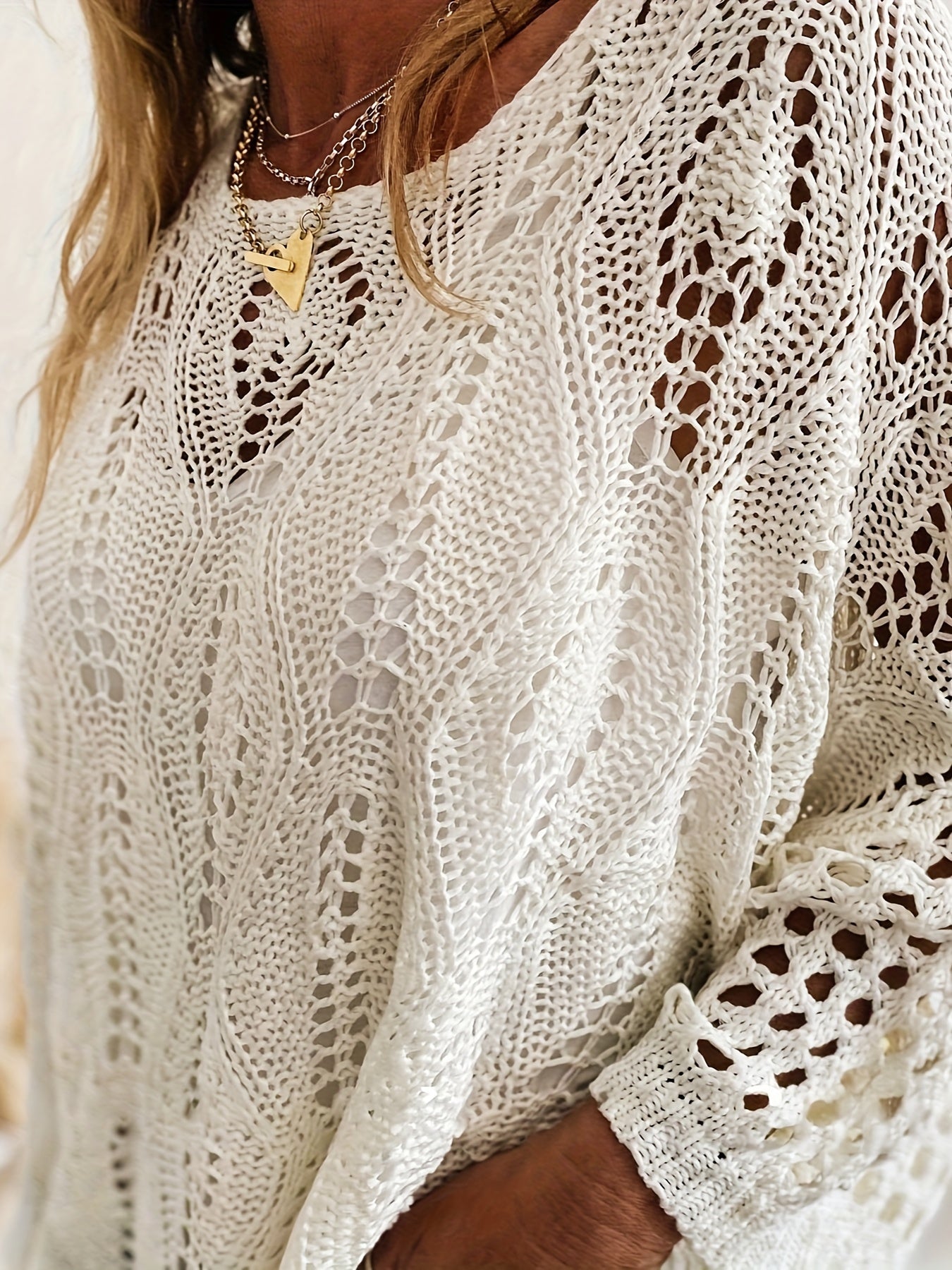 Top Klaudia to lekki model ażurowy z okrągłym dekoltem i rękawami nietoperz. Idealny na lato, oferuje przewiewność i stylowy, wakacyjny wygląd.