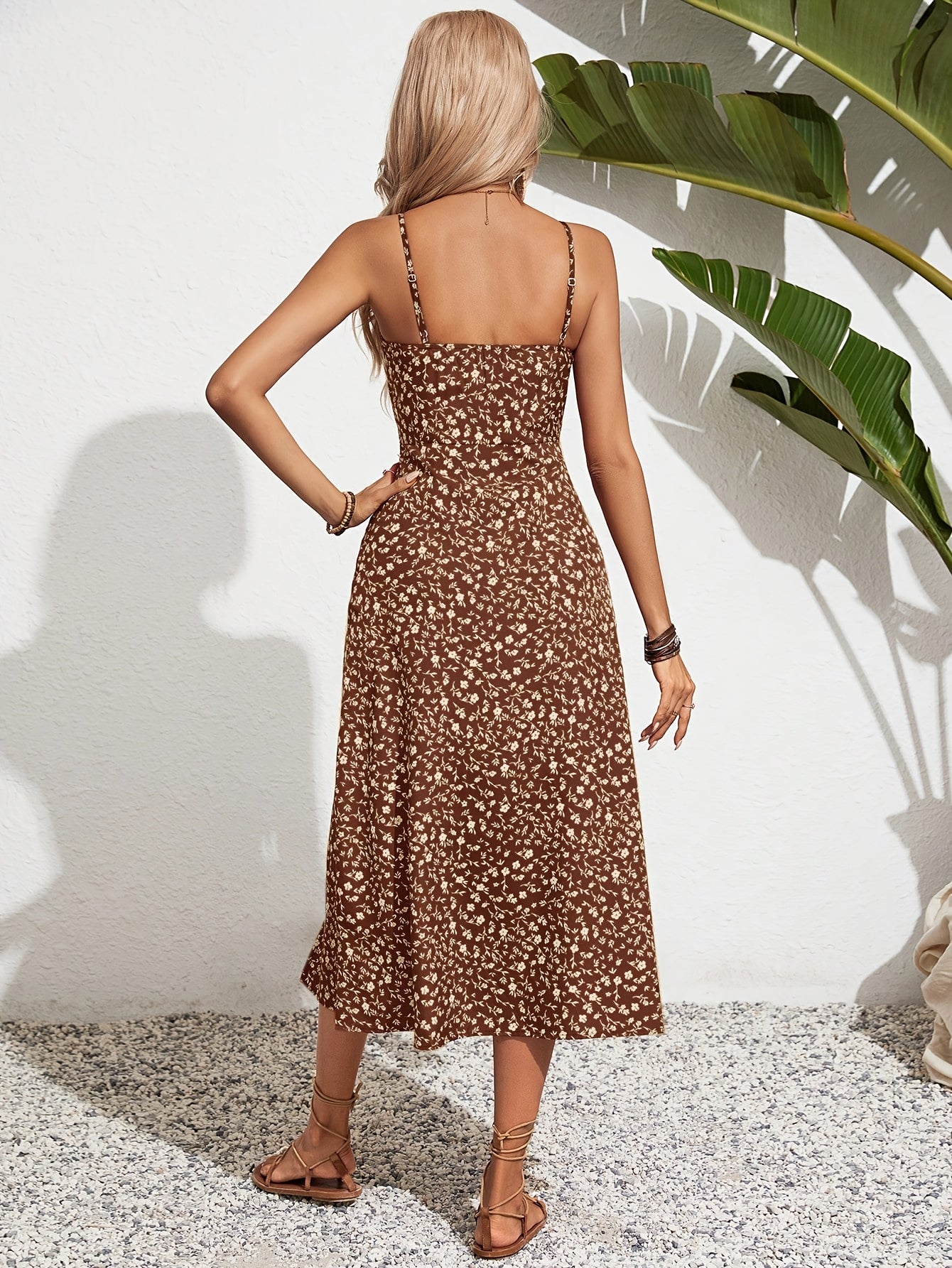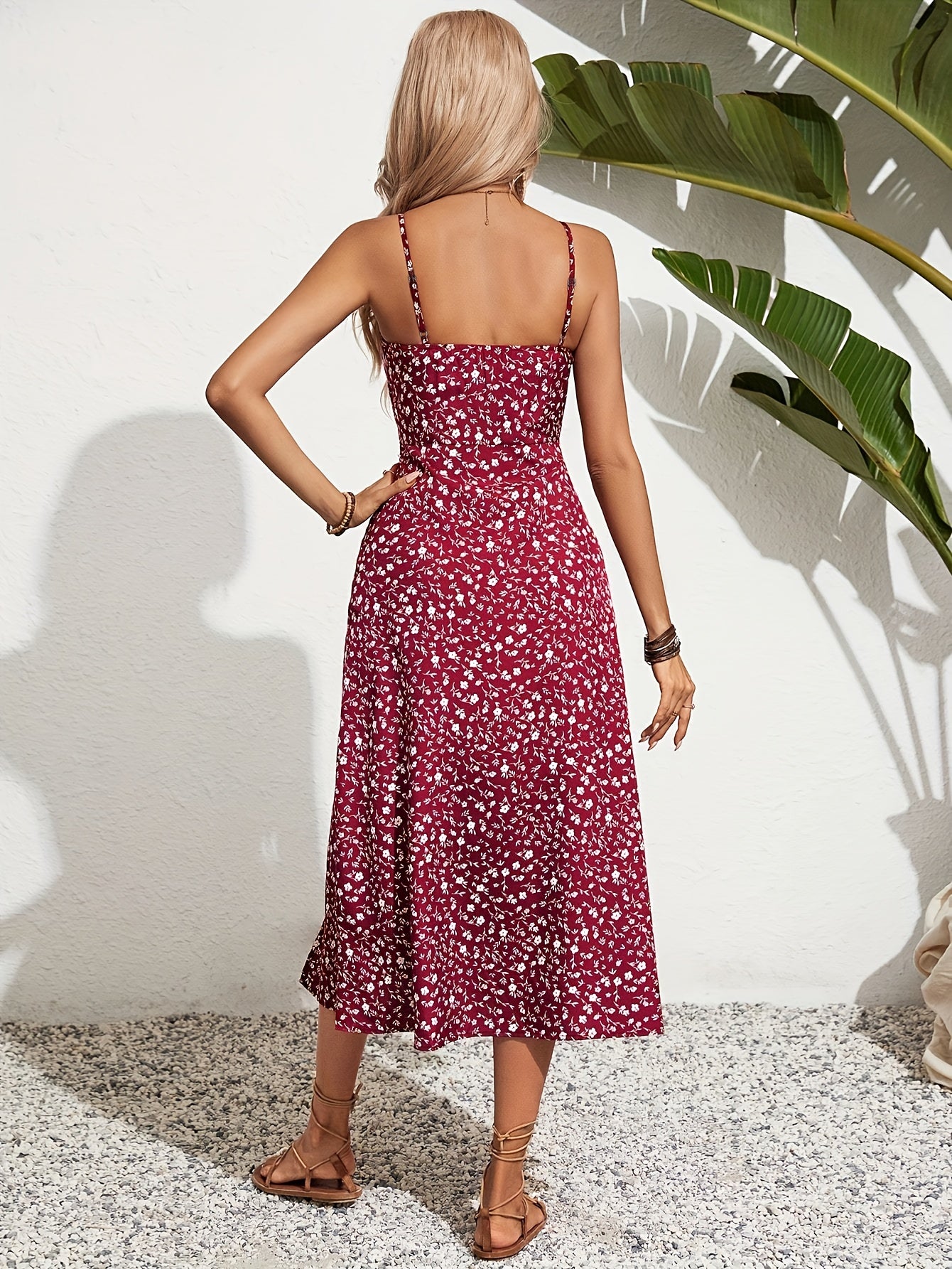 Czerwona sukienka midi w kwiaty z dekoltem V Emilia