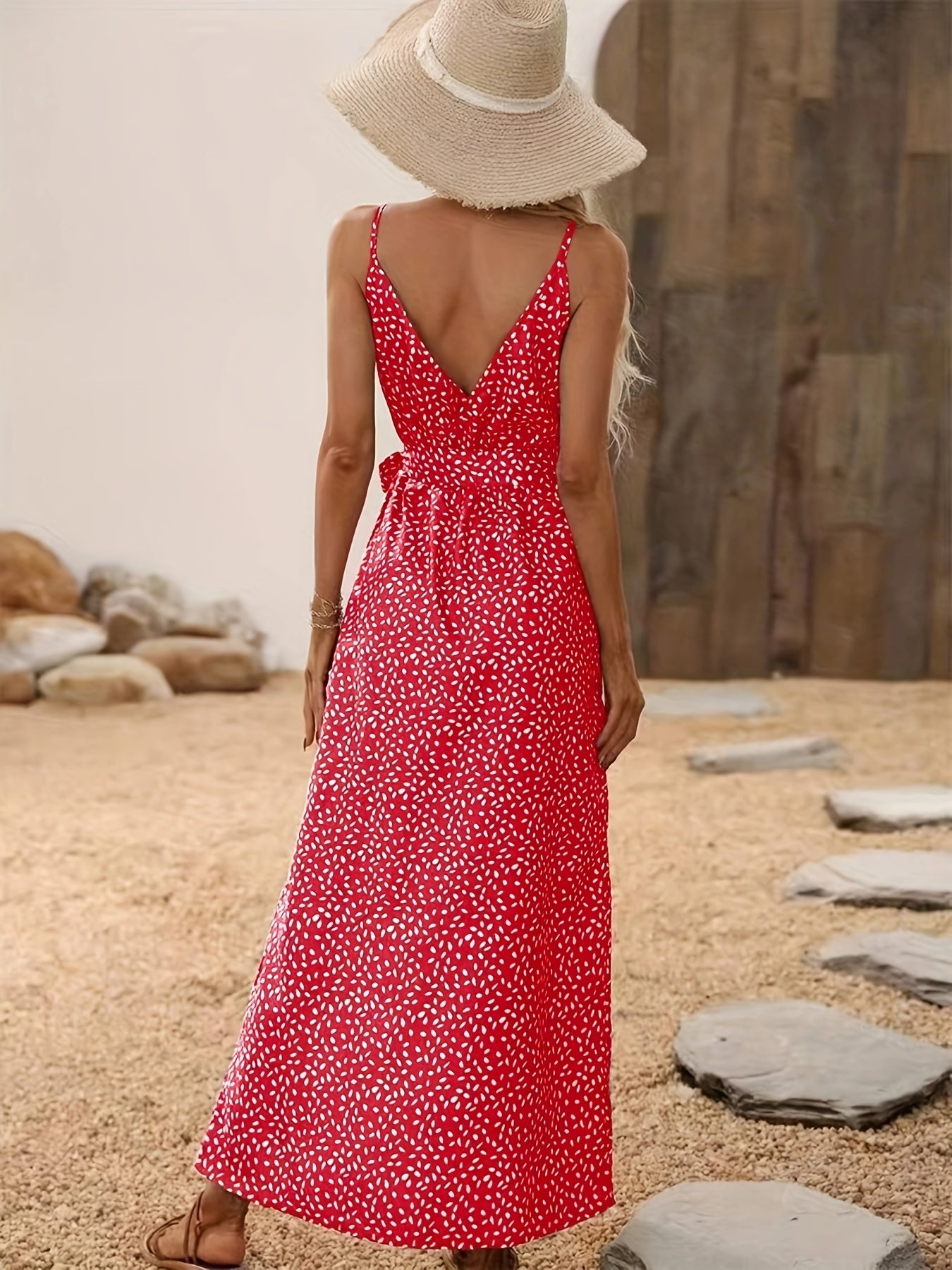 Sukienka Klaudia to elegancka maxi z głębokim dekoltem V, paskiem w talii i wysokim rozcięciem. Groszkowy wzór dodaje jej retro uroku, idealnego na plażowe wyjścia i letnie wakacje.