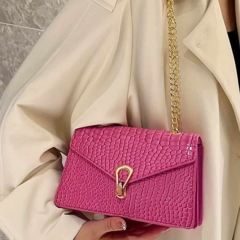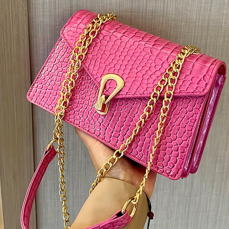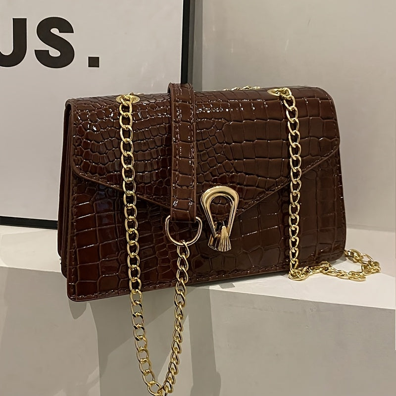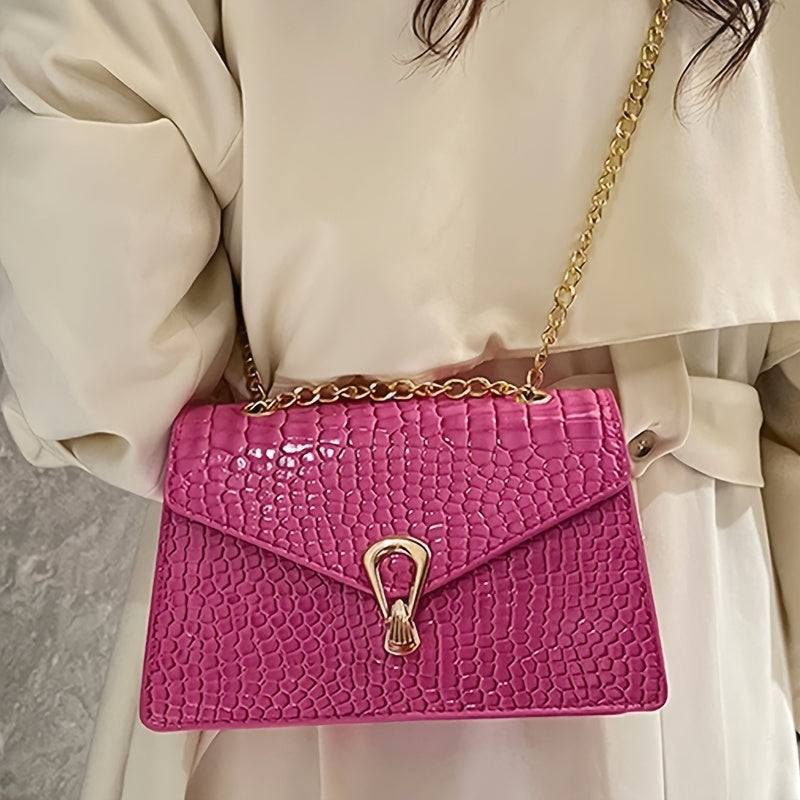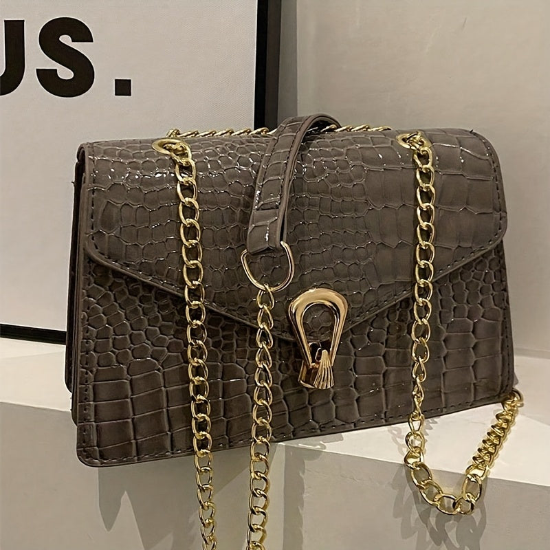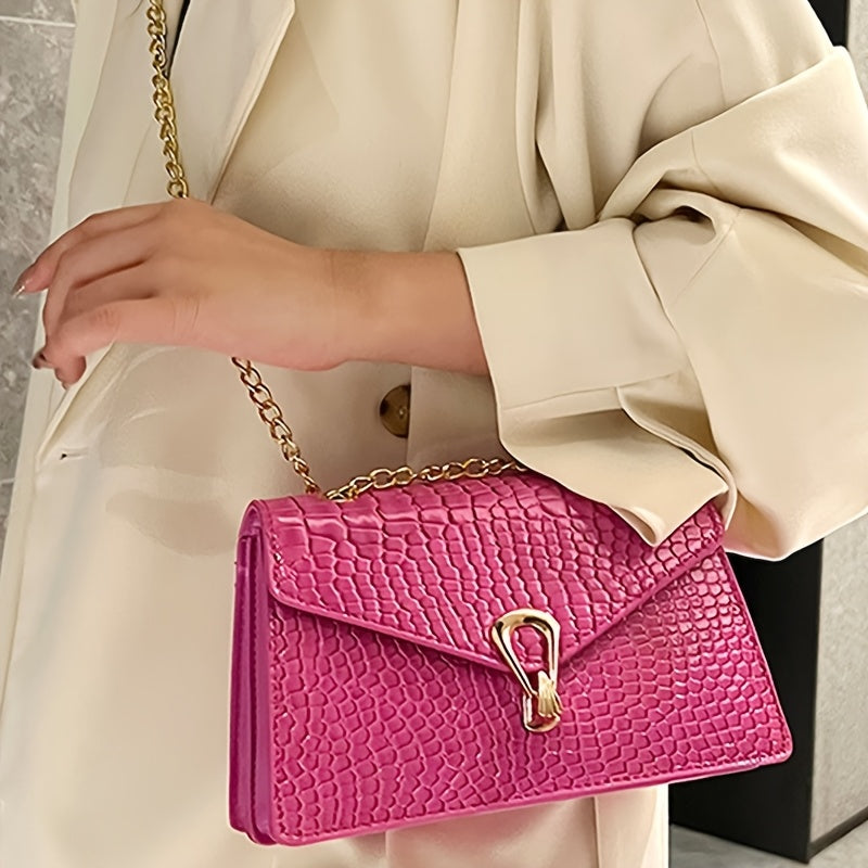 Stylowa torba satchel z modnym wzorem wężowej skóry i złotym paskiem-łańcuszkiem. Łączy elegancję z nowoczesnym akcentem, nadając wyjątkowego charakteru każdej stylizacji. Kompaktowa, ale pojemna – idealna na formalne i codzienne okazje. Niezastąpiona w kolekcji każdej kobiety.