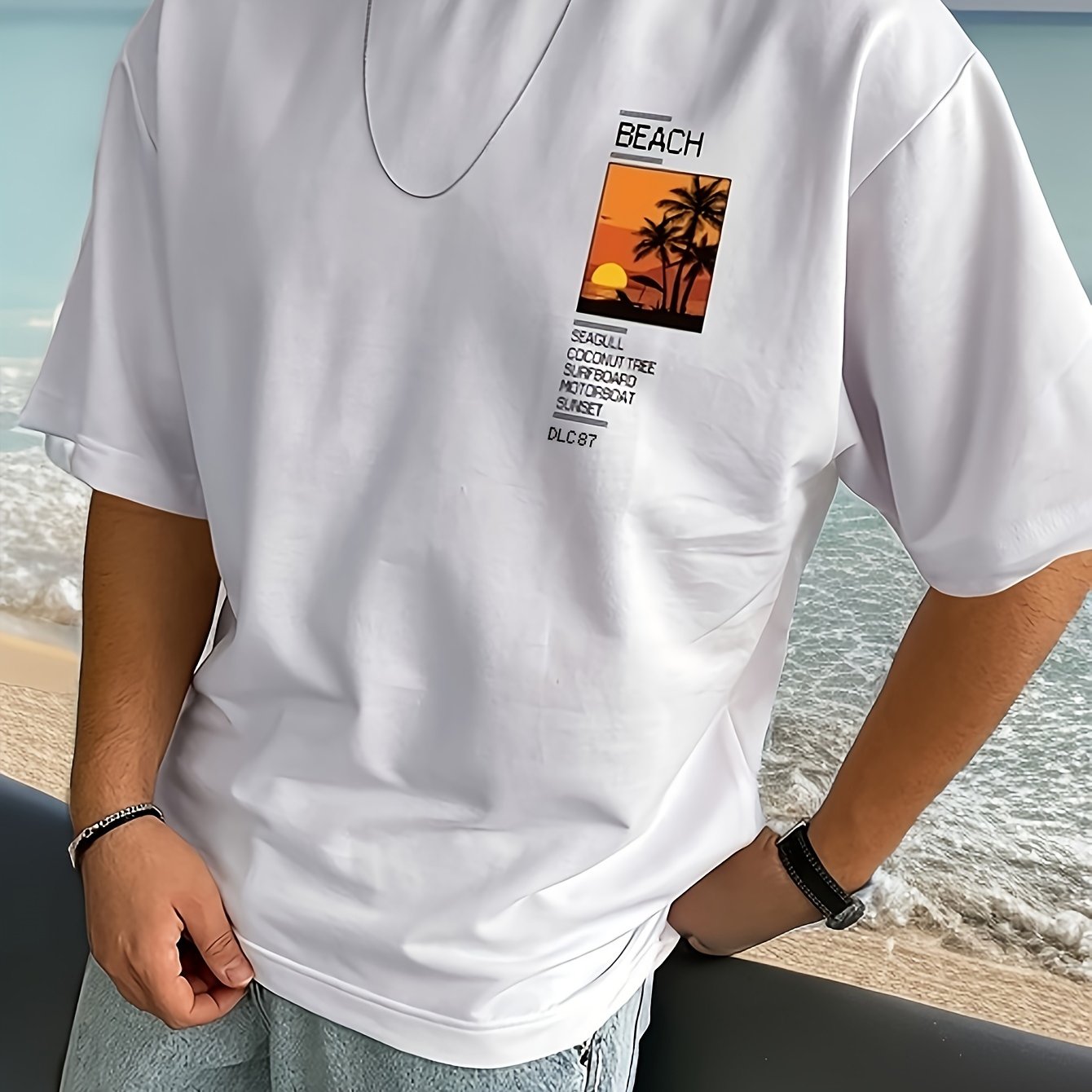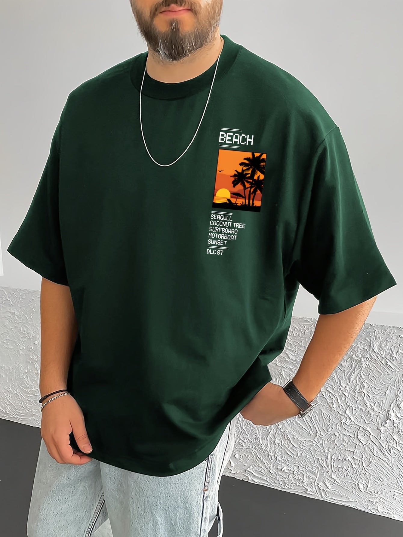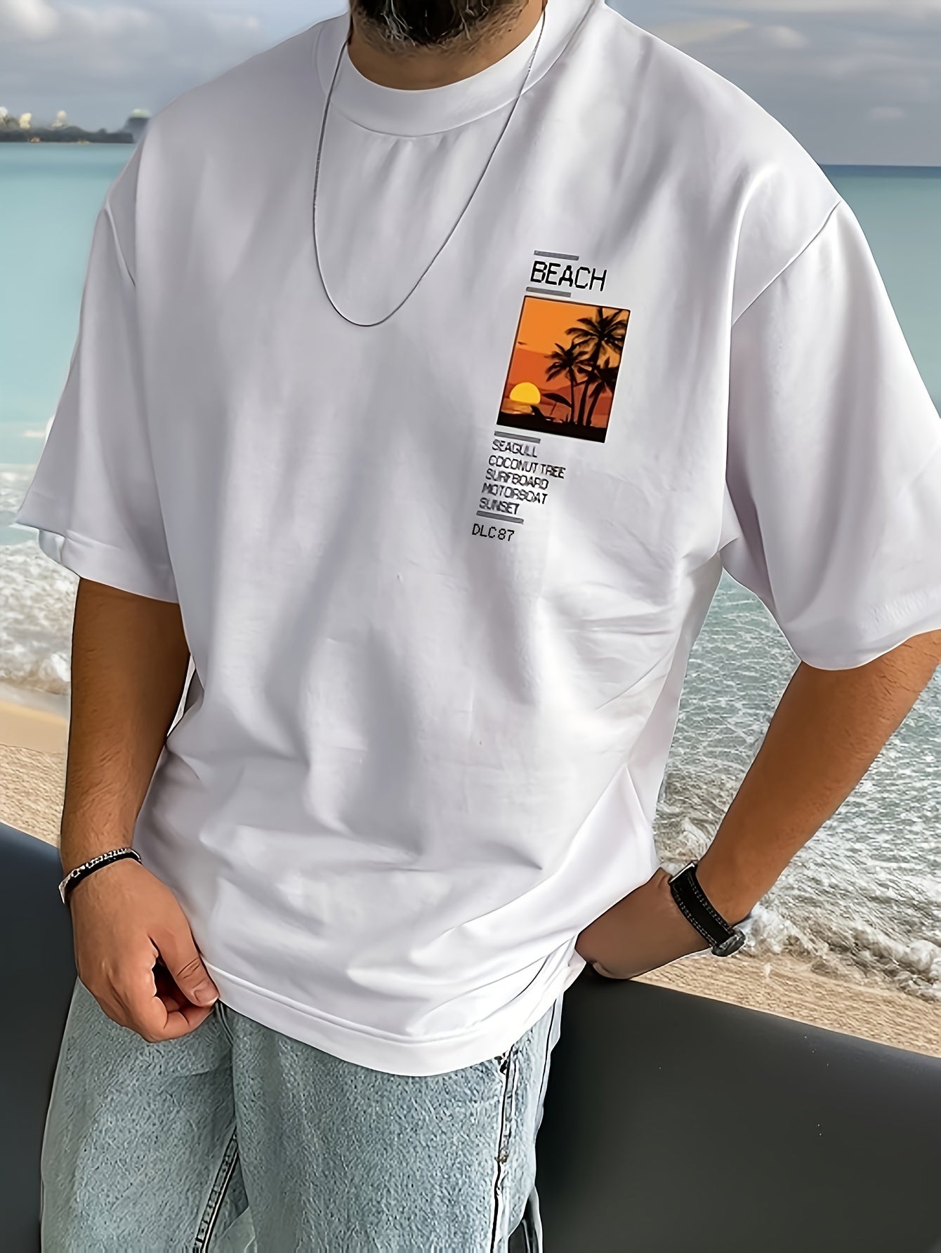Luźna koszulka męska z nadrukiem BEACH to letnia klasyka. Okrągły dekolt i krótki rękaw gwarantują komfort, a minimalistyczny nadruk podkreśla wakacyjny styl. Idealna na plażę i wyjazdy weekendowe.