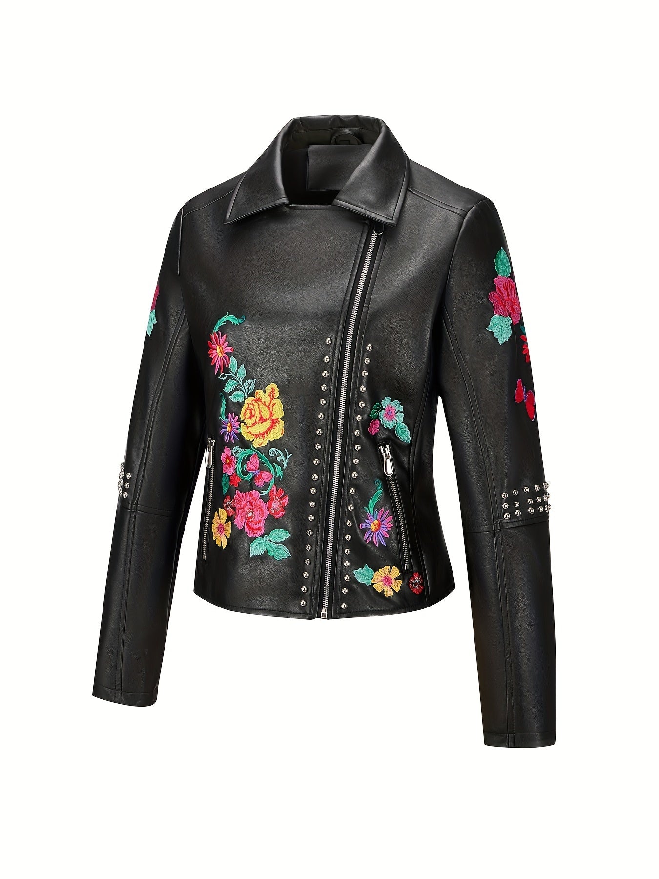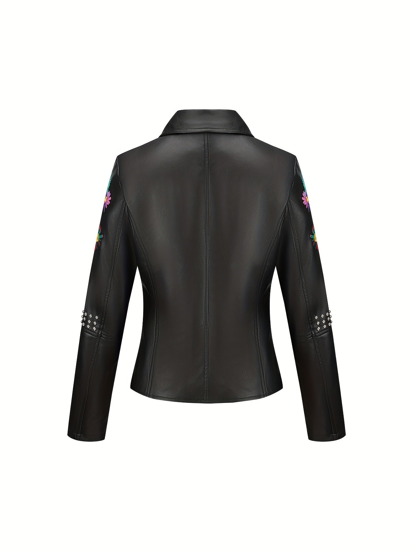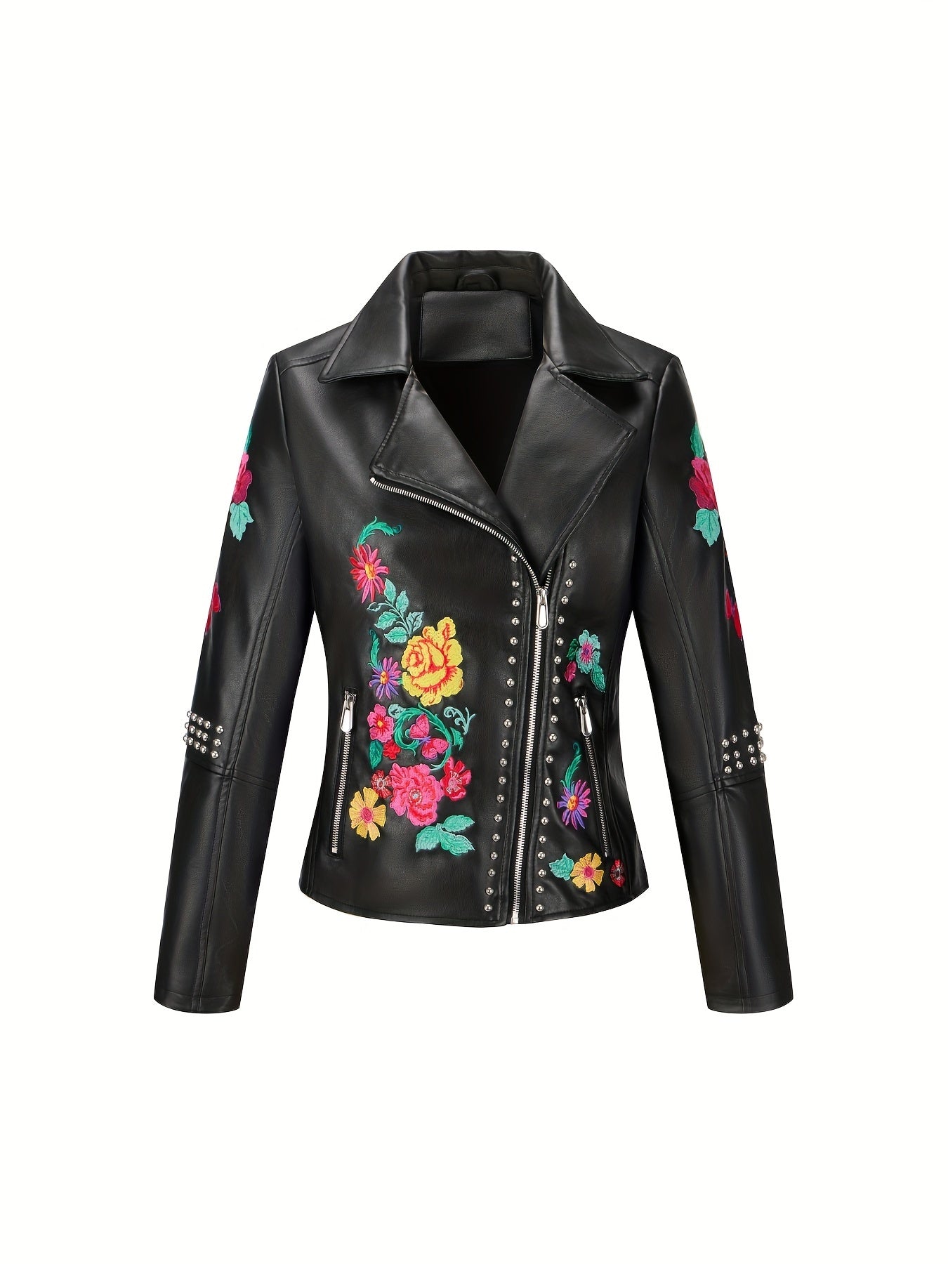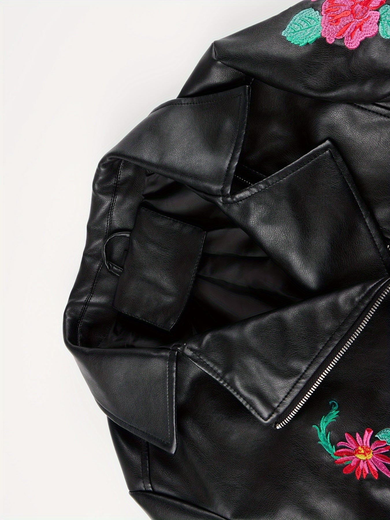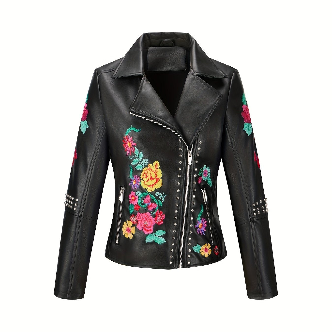 Kurtka motocyklowa z ekoskóry z kwiatowym wzorem w czerni z różowym i zielonym akcentem. Idealna na wiosenne i jesienne stylizacje casualowe. Łączy odwagę z kobiecą delikatnością.