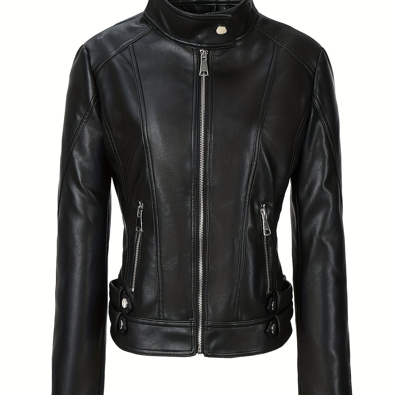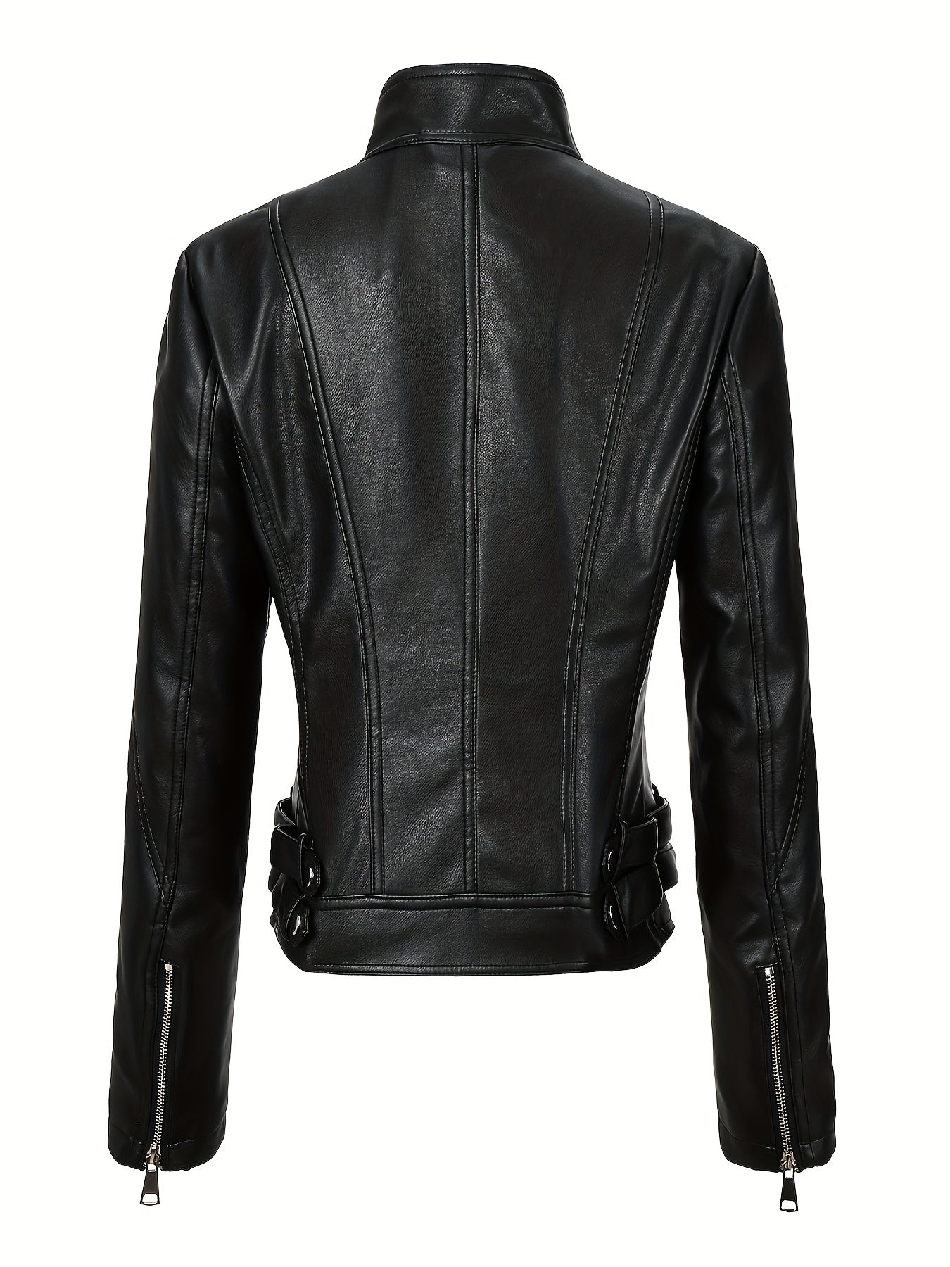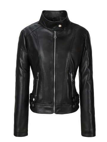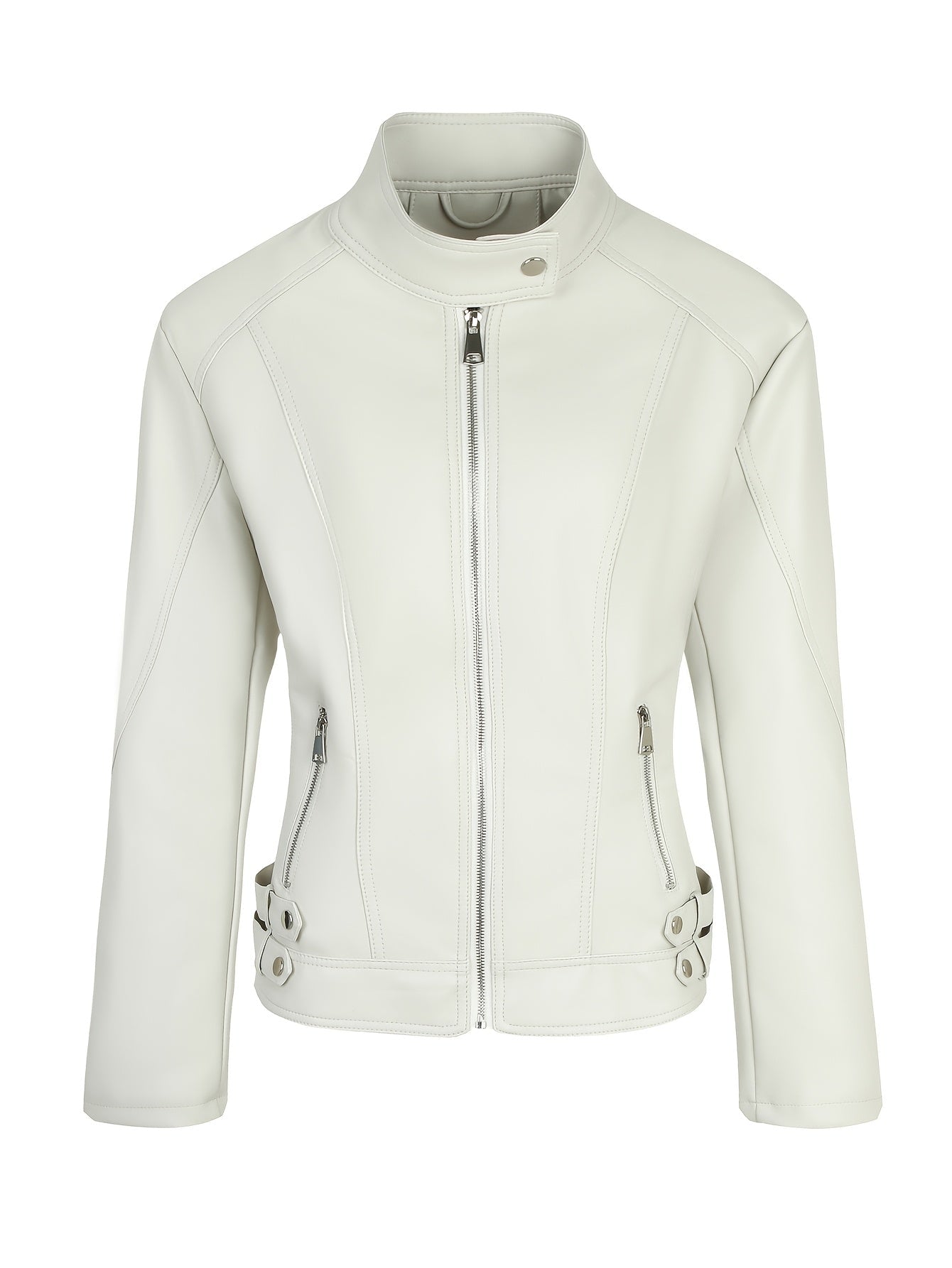 Czarna kurtka motocyklowa slim-fit z metalicznymi nitkami i stojącym kołnierzem. Łączy casualowy luz z elegancją, będąc idealną propozycją na każdą porę roku. Zamek i guziki dodają funkcjonalności.