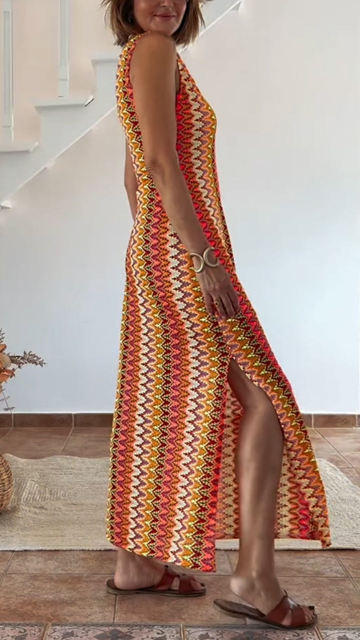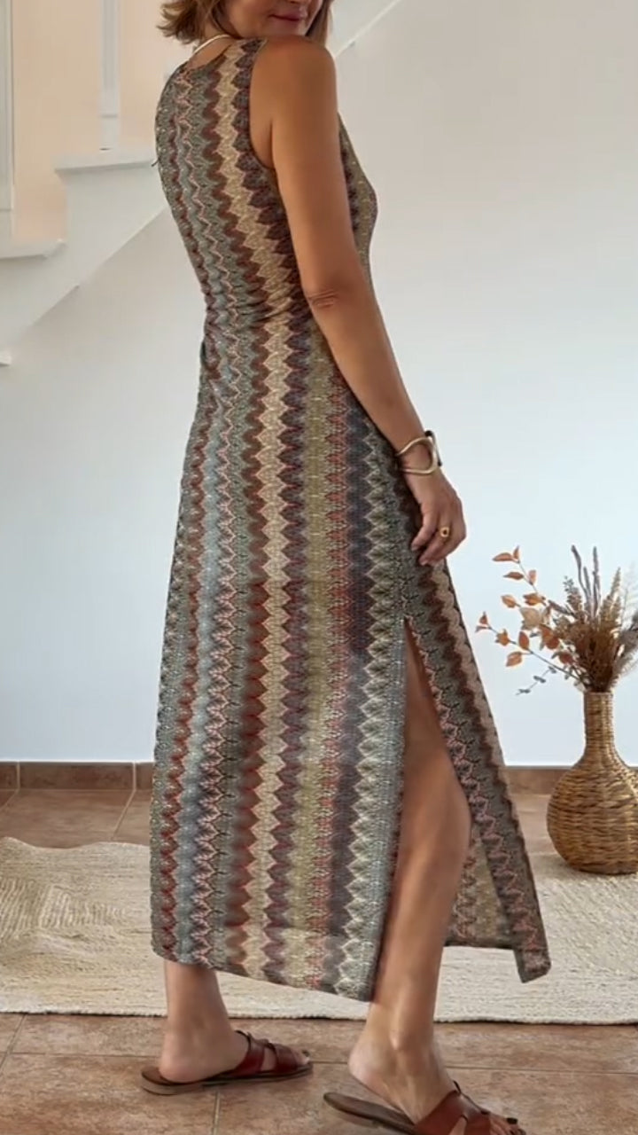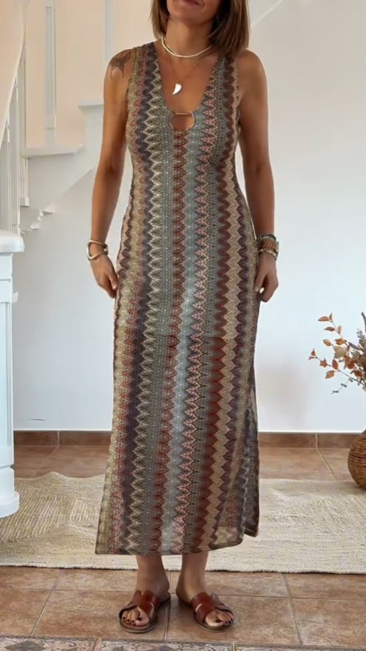 / Damska sukienka casualowa z patchworkowym wzorem i dekoltem w serek