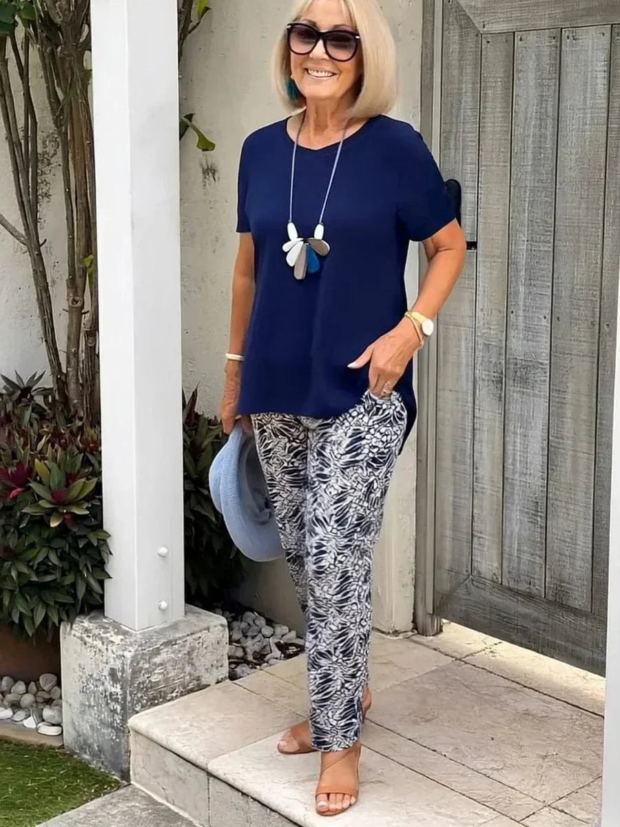 Wkrocz w słoneczne dni z niewymuszonym urokiem. Zestaw Larissa łączy w sobie odważny, botaniczny styl z codzienną swobodą. Luźna bluzka i zwężane spodnie z nadrukiem liści to kwintesencja swobody ruchów i komfortu. Niezależnie od tego, czy wybierasz się na brunch, czy na spacer po mieście, Solana pomoże Ci wyglądać stylowo bez wysiłku.