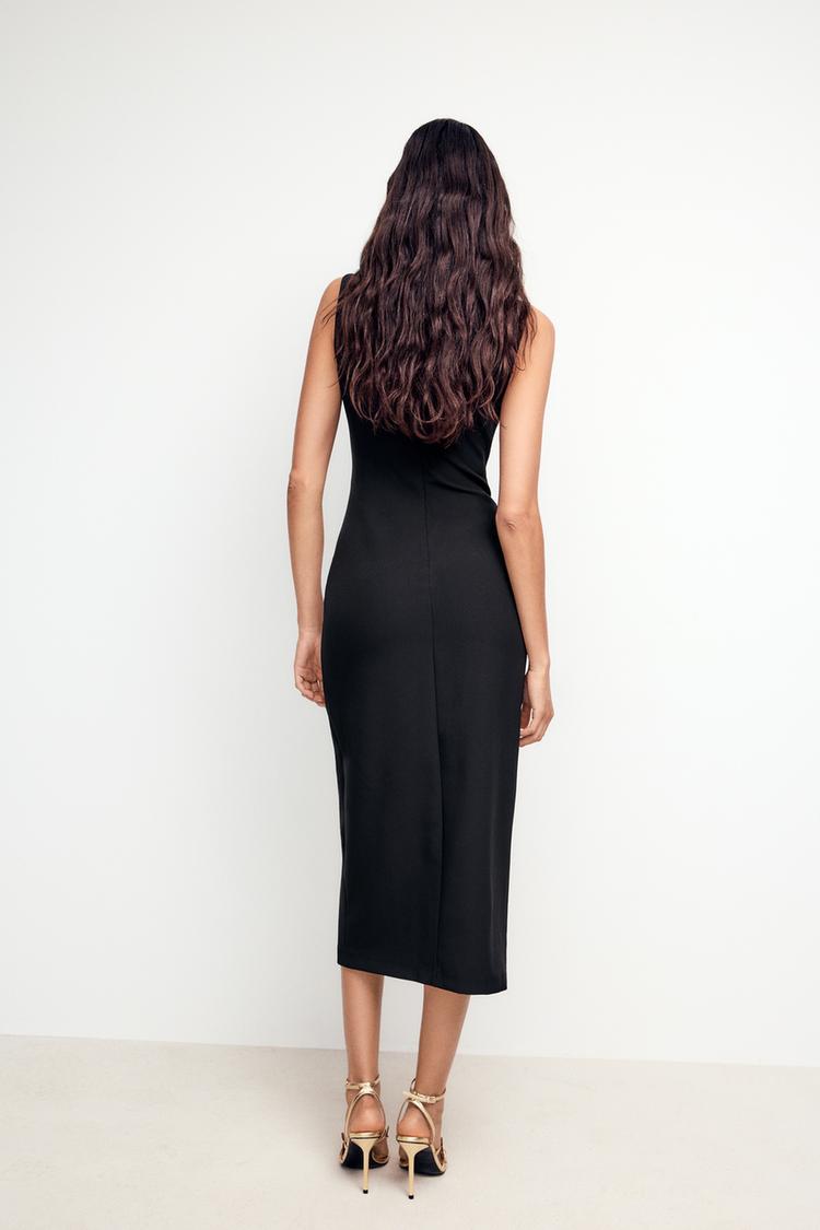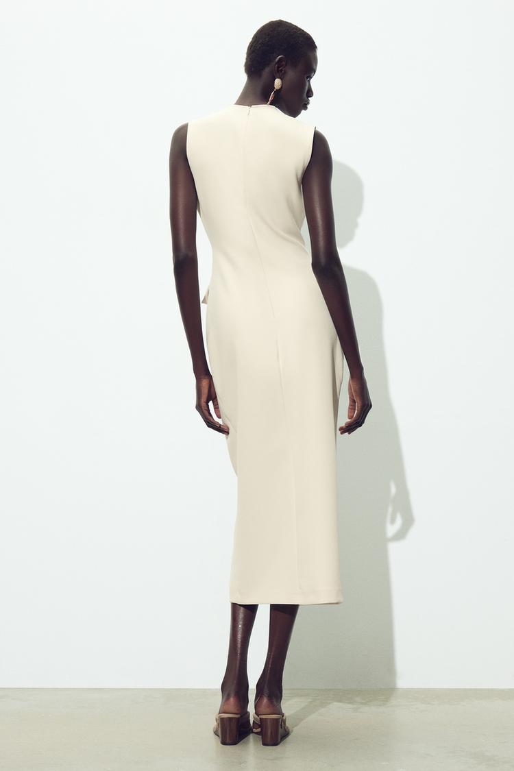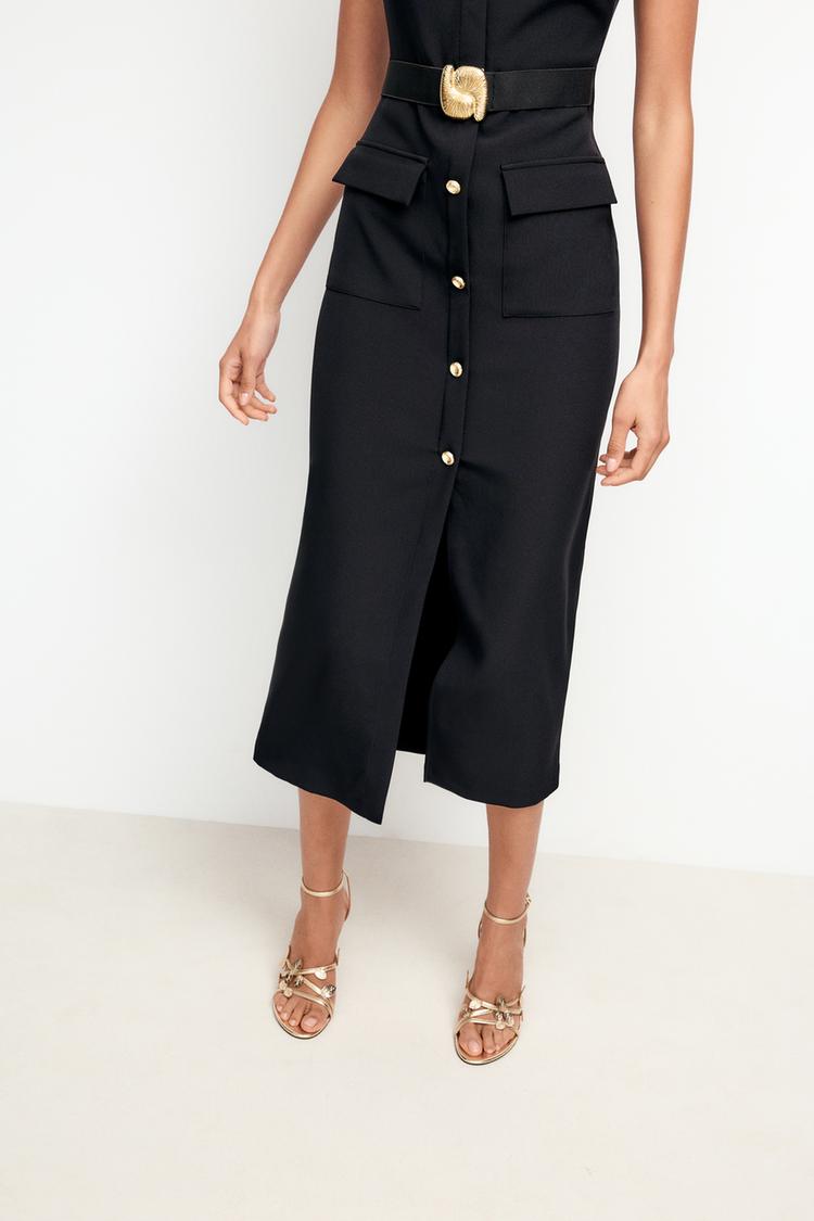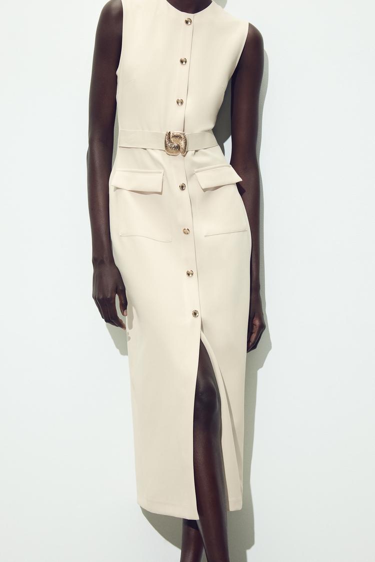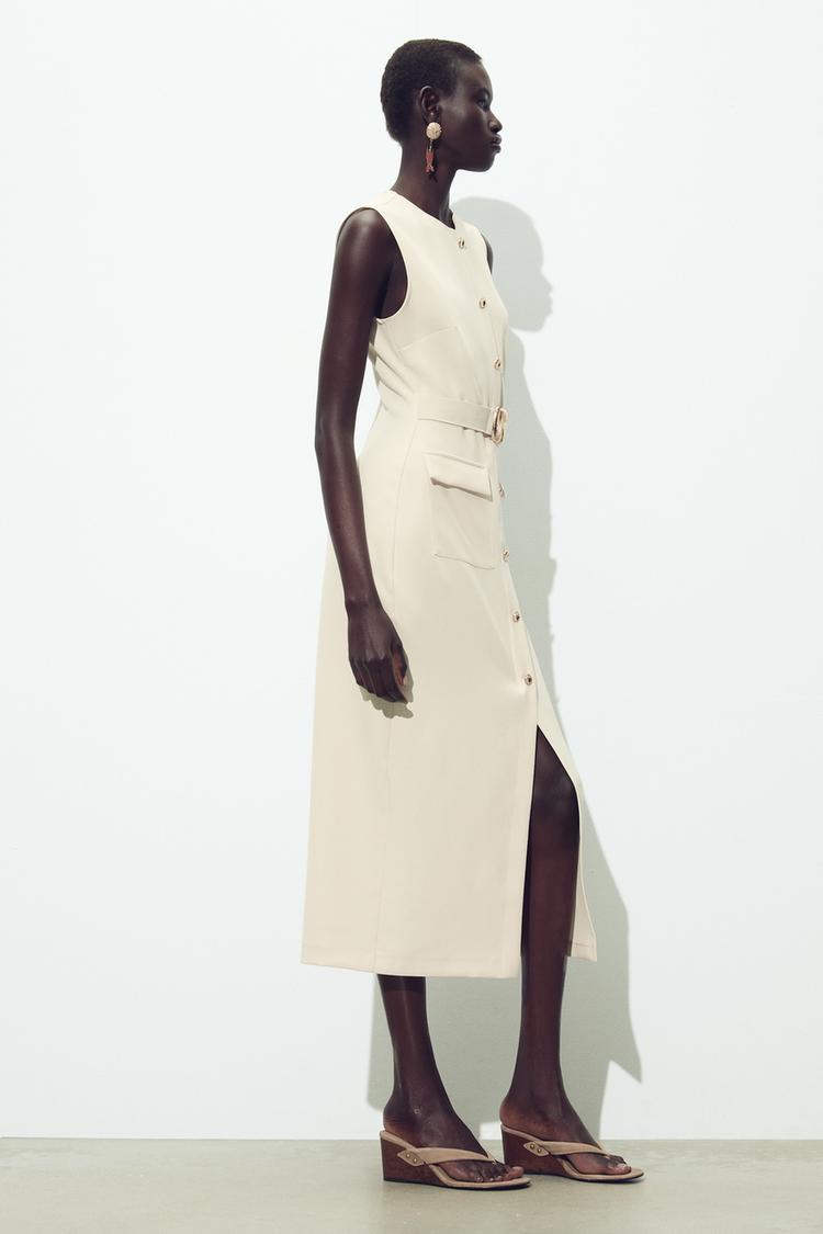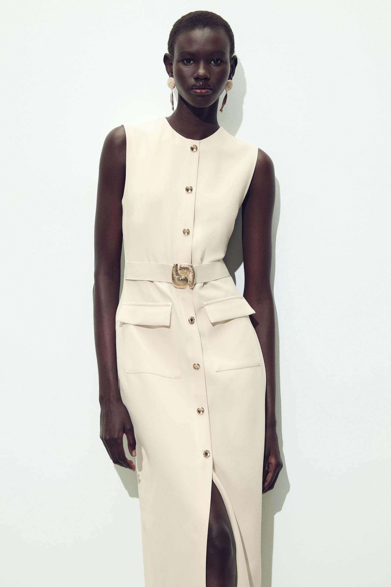 Sukienka Leonie Crepe z paskiem łączy ponadczasową elegancję z nowoczesnymi detalami i stanowi uniwersalny dodatek do Twojej garderoby. Wykonana z miękkiej mieszanki krepy, ta sukienka midi bez rękawów ma okrągły dekolt, ozdobne guziki i elastyczną talię ze złotą aplikacją.