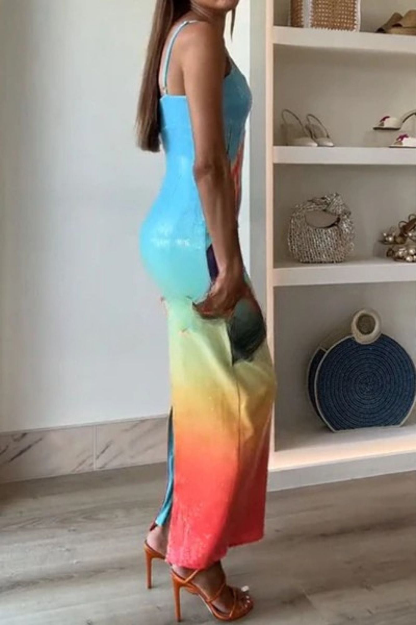 Senne Marzenia – Cekinowa Maxi Sukienka Z Gradientowym Nadrukiem