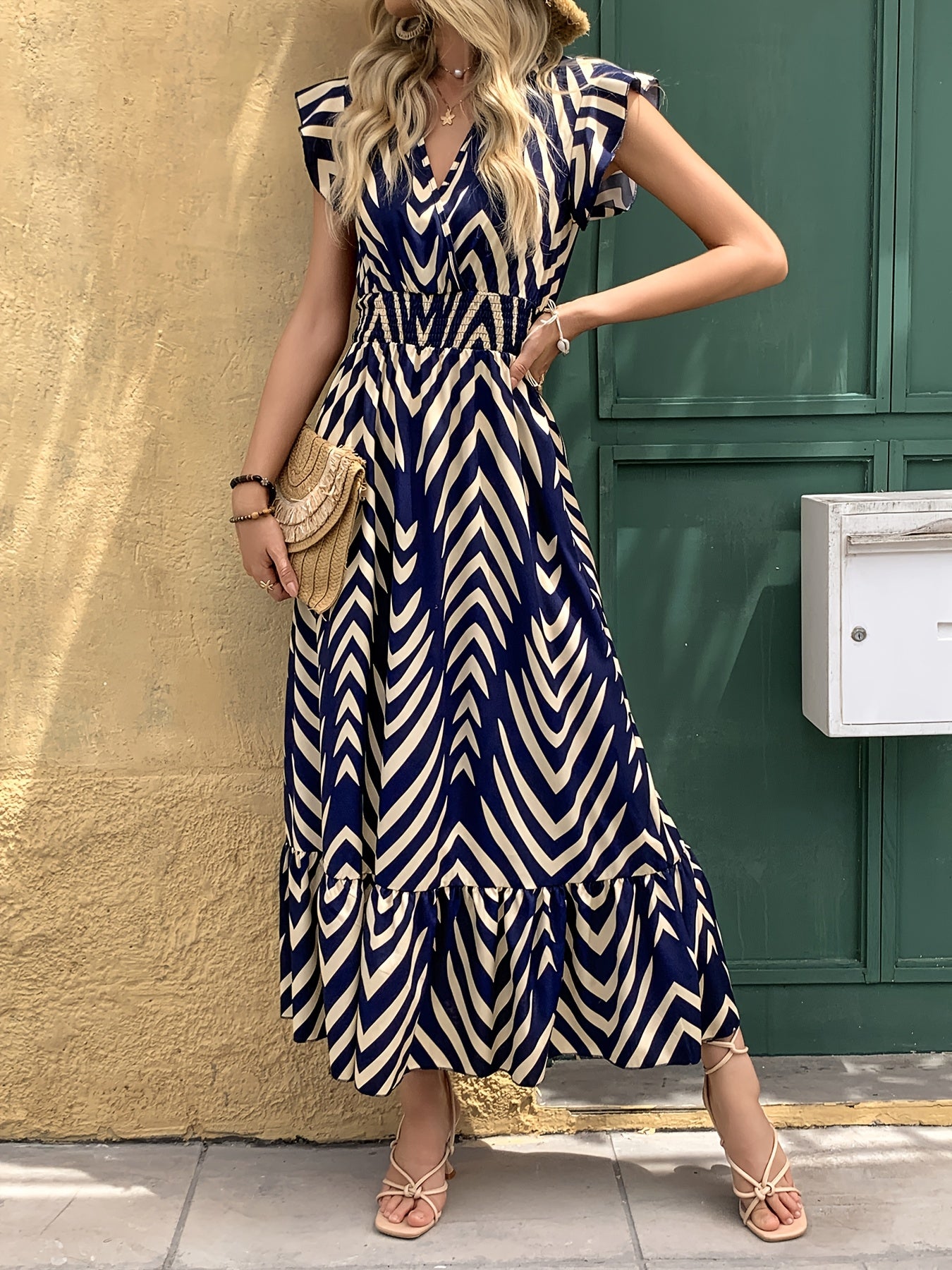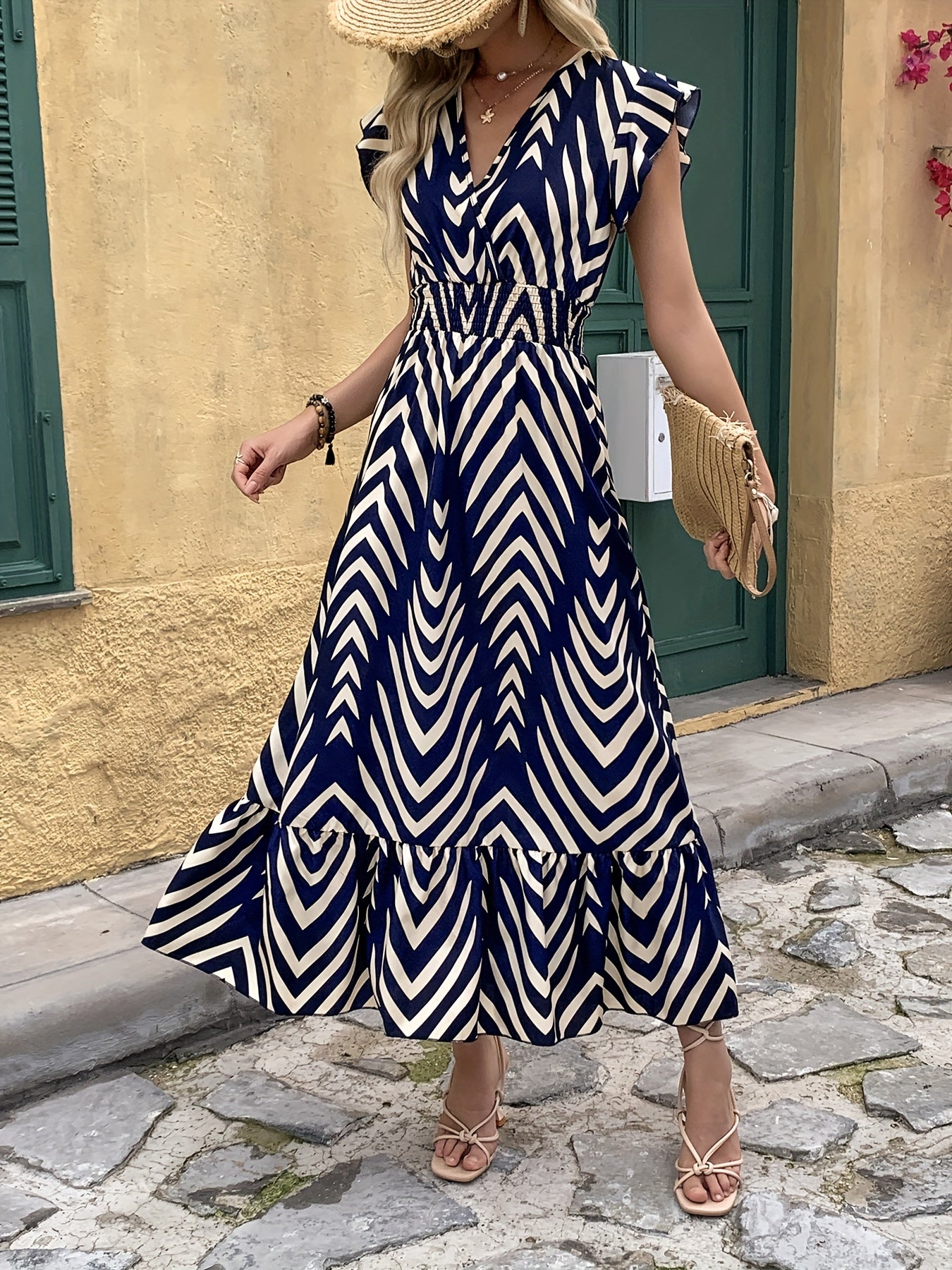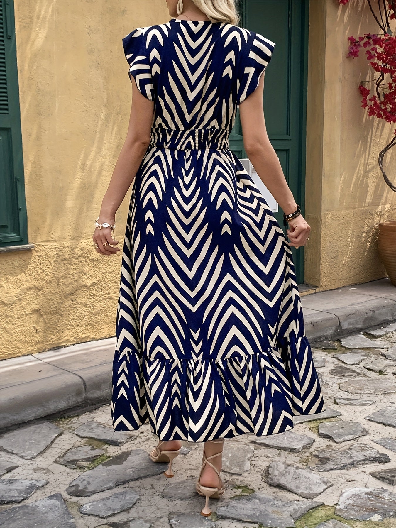 Letnia sukienka z geometrycznym wzorem i falbanką na rękawach wyróżnia się świeżym, artystycznym charakterem. Mikroelastyczna tkanina zapewnia wygodę i lekkość noszenia przez cały dzień. Idealna na lato i inne pory roku, gdy chcesz wyglądać modnie i czuć się komfortowo. Jej geometryczny design dodaje dynamiki każdej stylizacji.