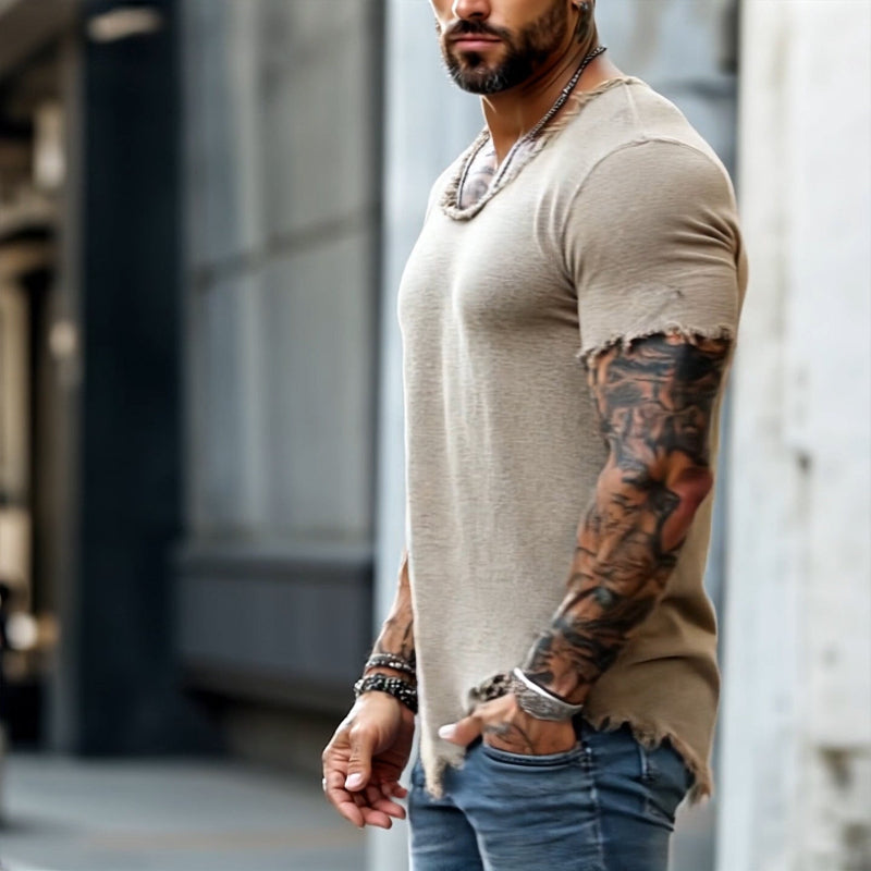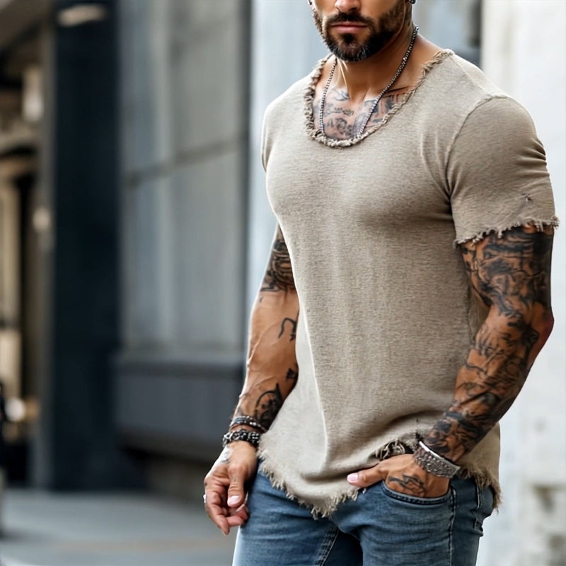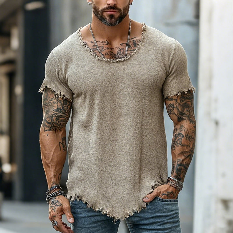 Męska koszulka polo w stylu retro, casualowa, z krótkim rękawem i surowym wykończeniem, z okrągłym dekoltem i rozdarciami
