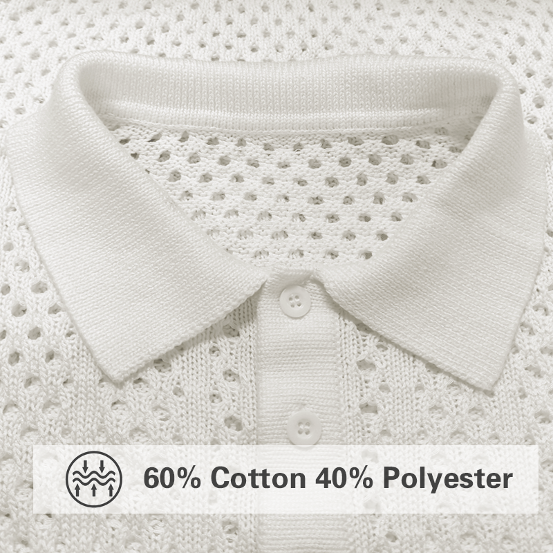 • Szczegóły projektu: Wzór w kratę z wycięciami w solidnej konstrukcji dzianinowej, z kołnierzykiem z klapami i tradycyjną sylwetką polo