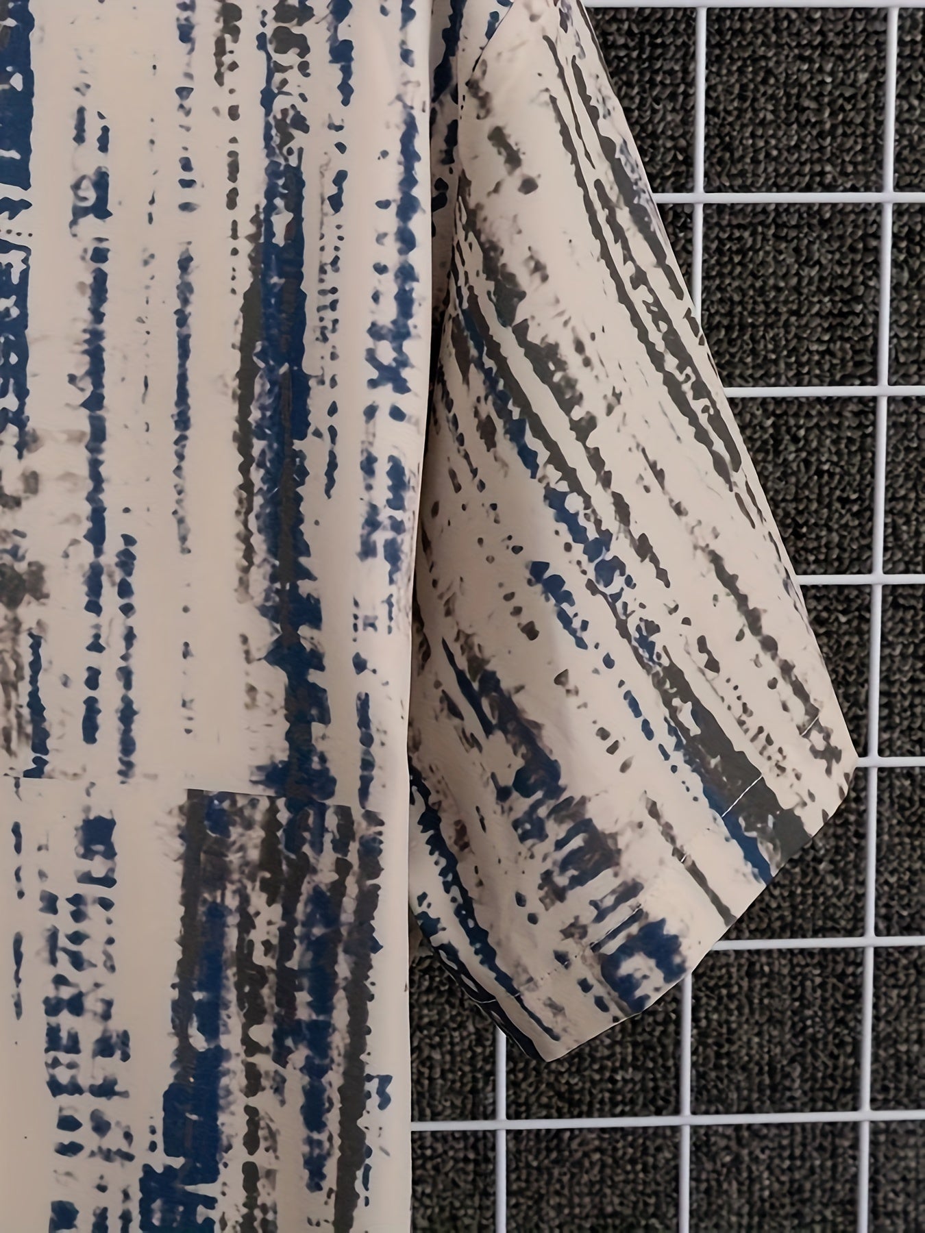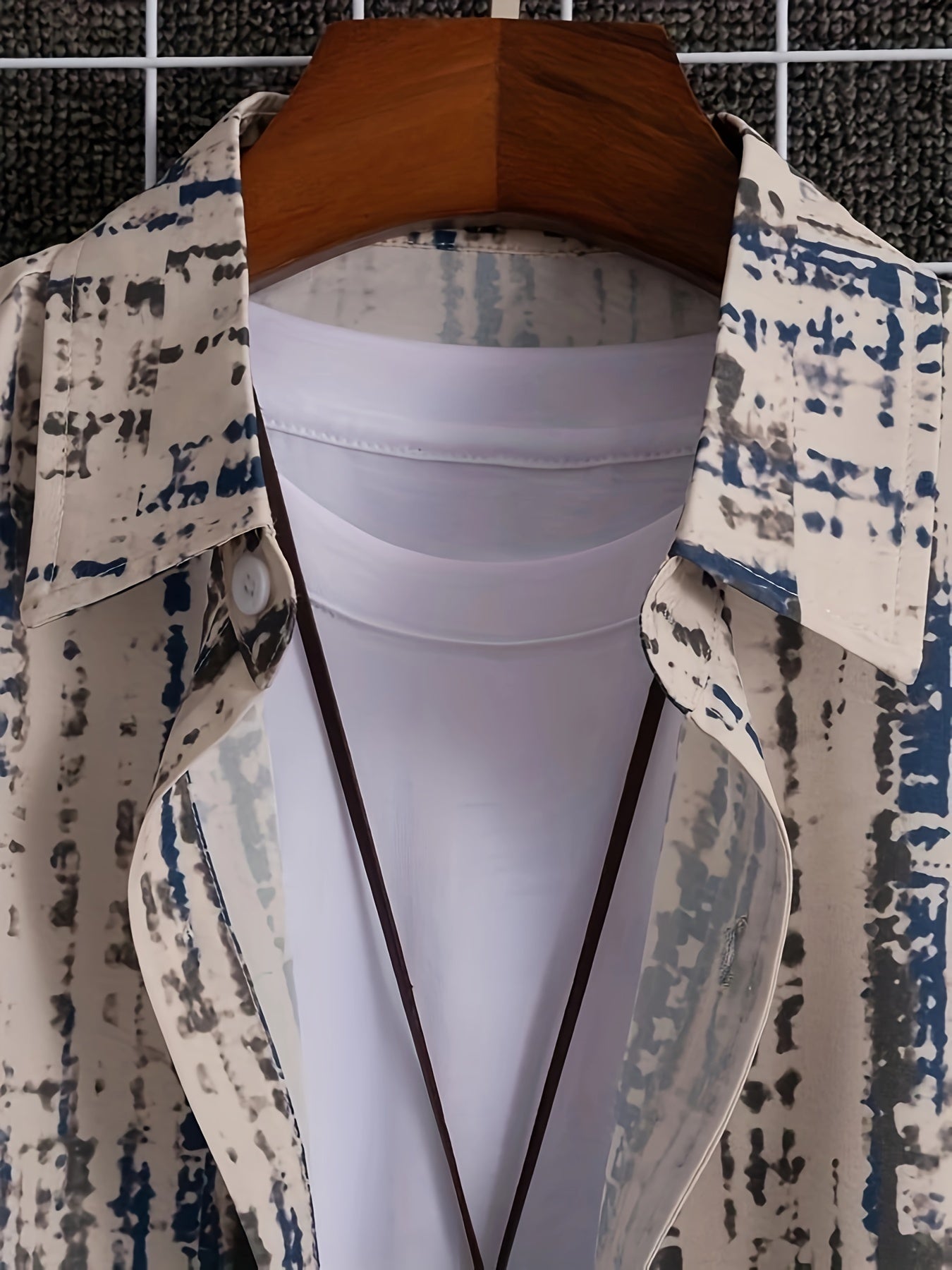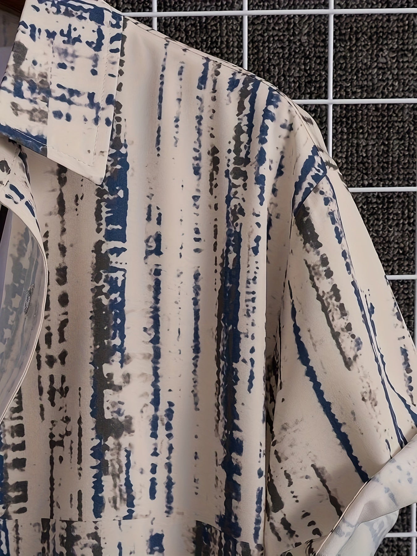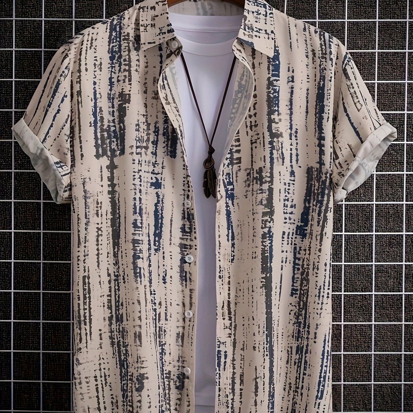 Luźna koszula męska z nadrukiem geometrycznym i kołnierzykiem z klapami. Krótki rękaw i zapinanie na guziki czynią ją idealną na ciepłe dni. Sprawdzi się podczas wyjazdów i spotkań towarzyskich.