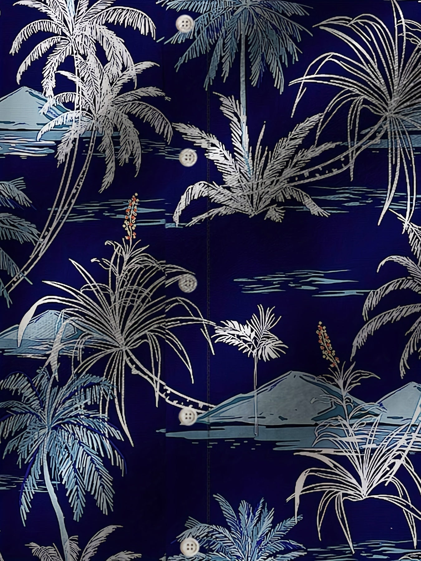 Hawajska koszula męska z nadrukiem drzewa kokosowego i kołnierzykiem z klapami. Krótki rękaw i lekki poliester sprawiają, że to idealny wybór na lato i plażowe stylizacje. Dostępna także w większych rozmiarach.