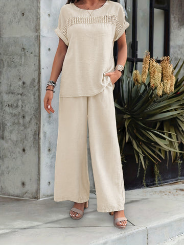 Komplet zapewnia wygodę i elegancję w codziennym noszeniu, świetnie komponując się z dodatkami wakacyjnymi i miejskimi.