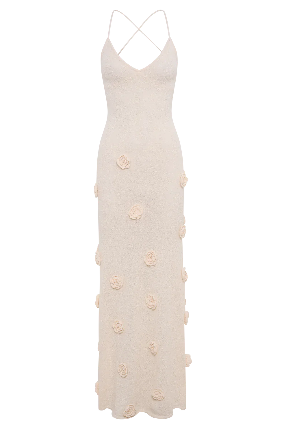 Sukienka maxi Nayla Crochet Floral to Twój idealny letni look. Z atrakcyjnym dekoltem w serek, zabawnymi ramiączkami i dopasowanym krojem, sukienka ozdobiona jest ręcznie wykonanymi kwiatowymi akcentami. Wykonana z lekkiej, miękkiej dzianiny, idealnie sprawdzi się na plaży, wakacjach lub spontanicznych wypadach.
