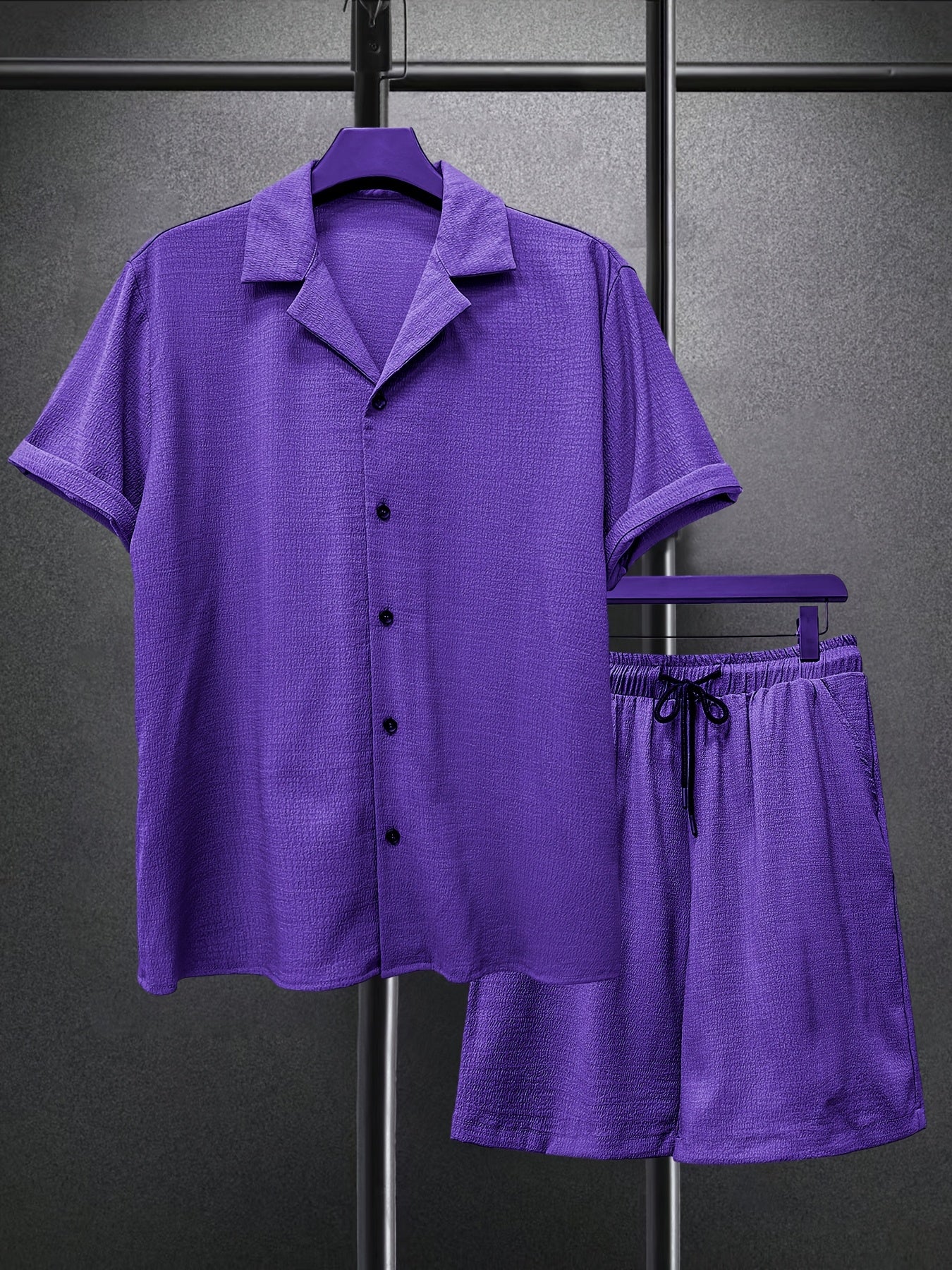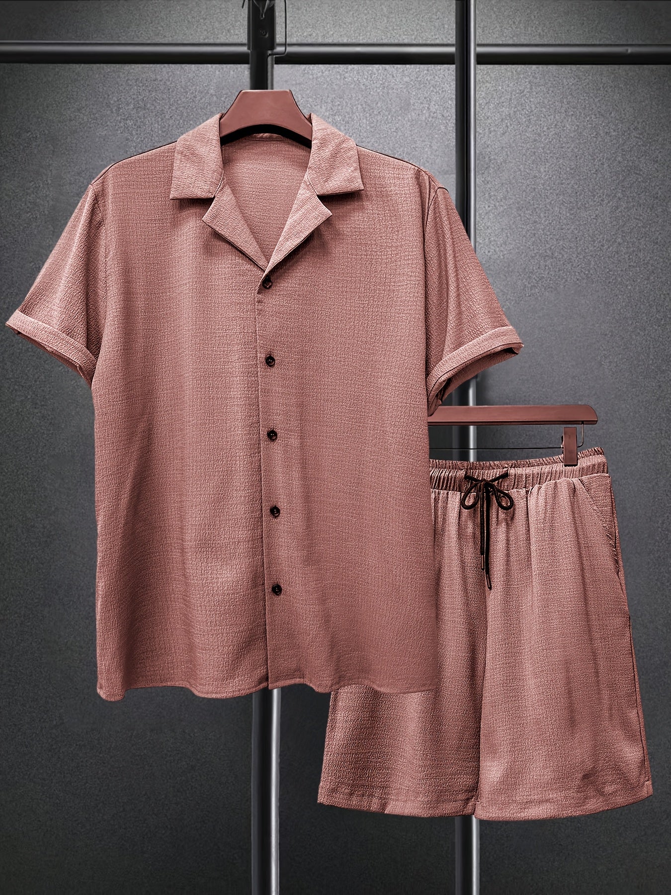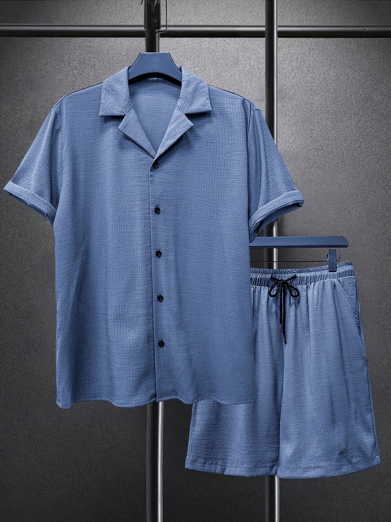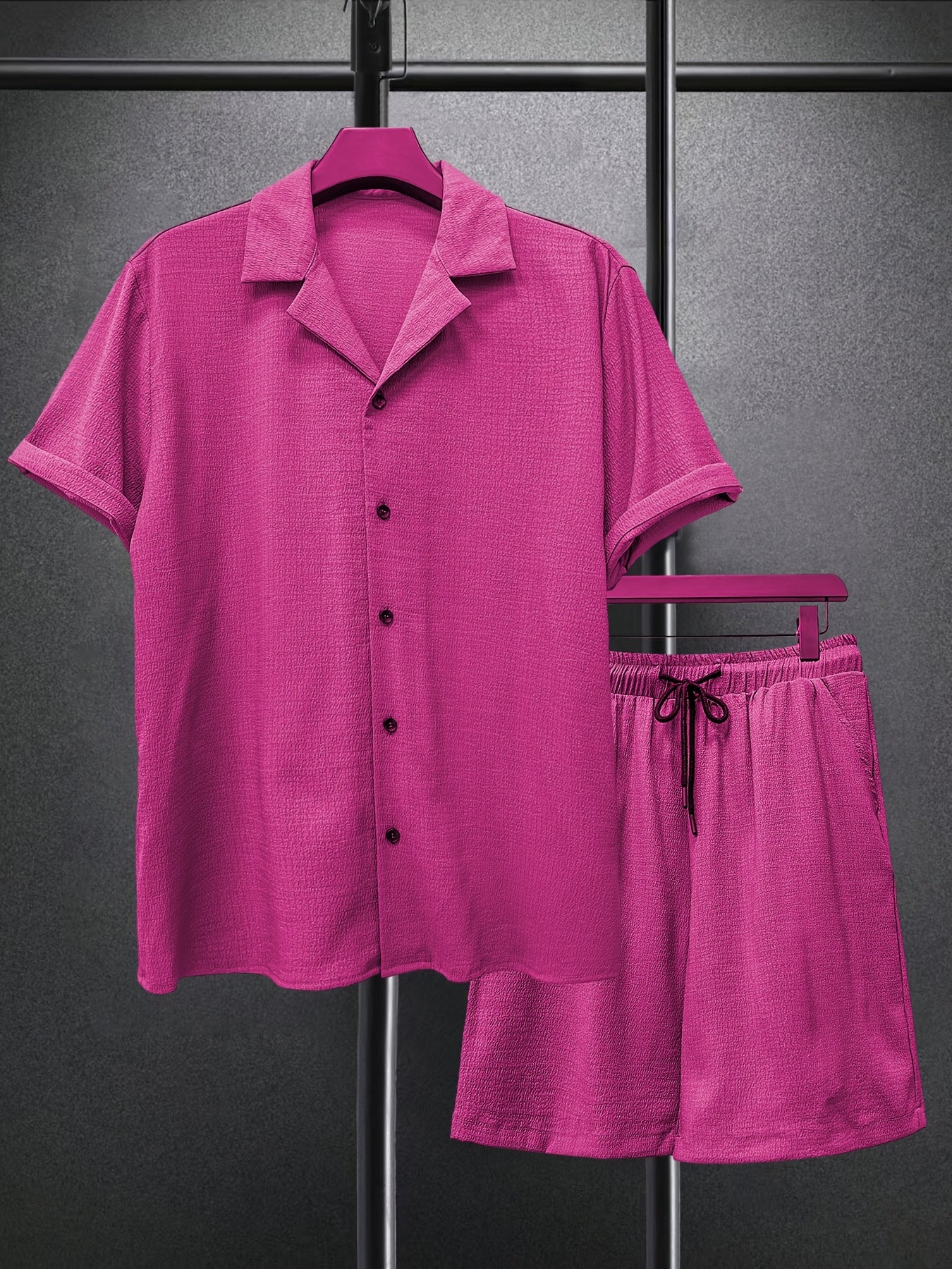 Lekki garnitur męski z małą kratką i szortami to idealne rozwiązanie na lato. Połączenie wygodnej koszuli z krótkim rękawem i spodni czyni go idealnym na plażę, podróż czy codzienny wyjazd. Oddychający materiał zapewnia komfort w upalne dni.
