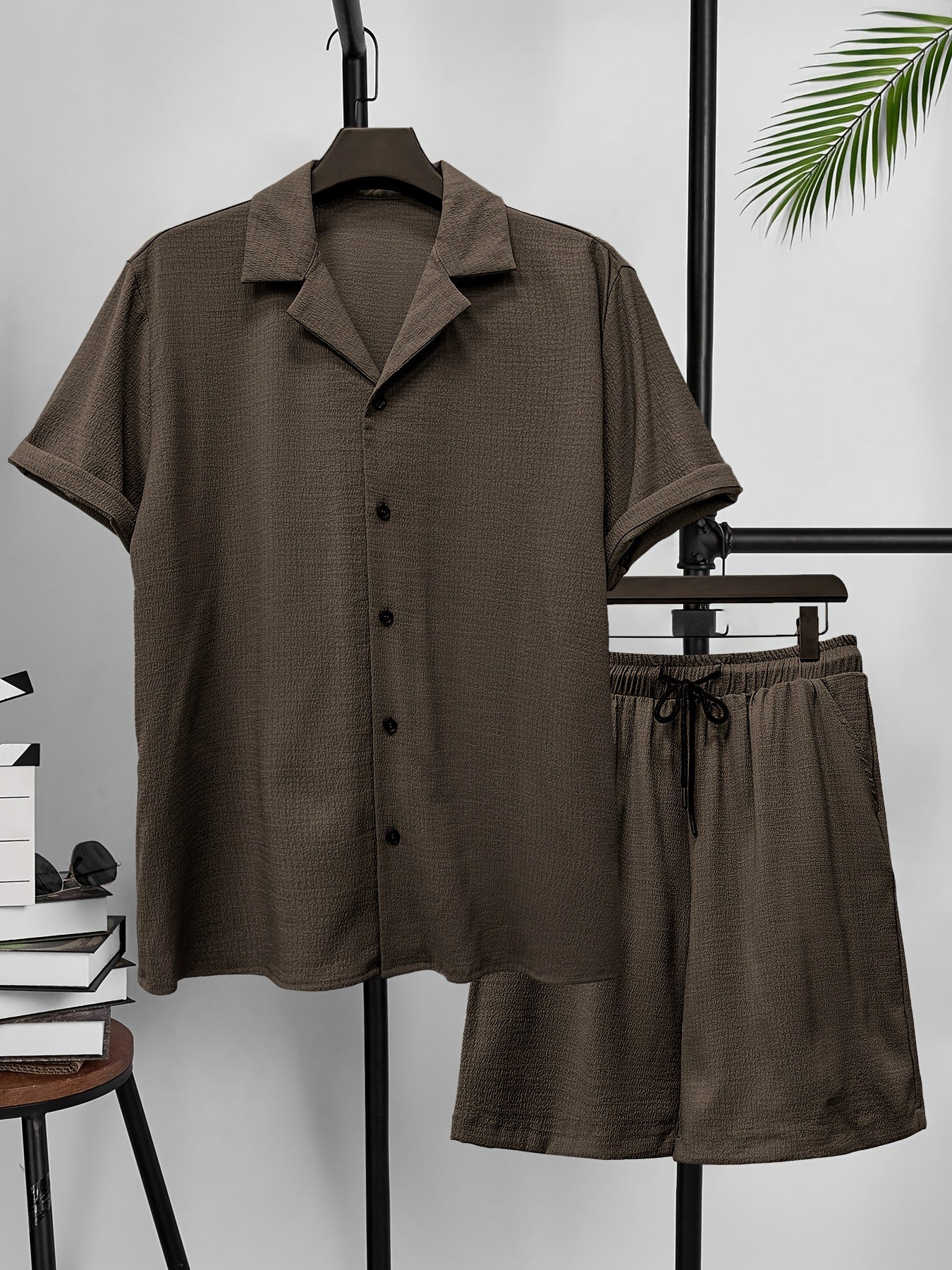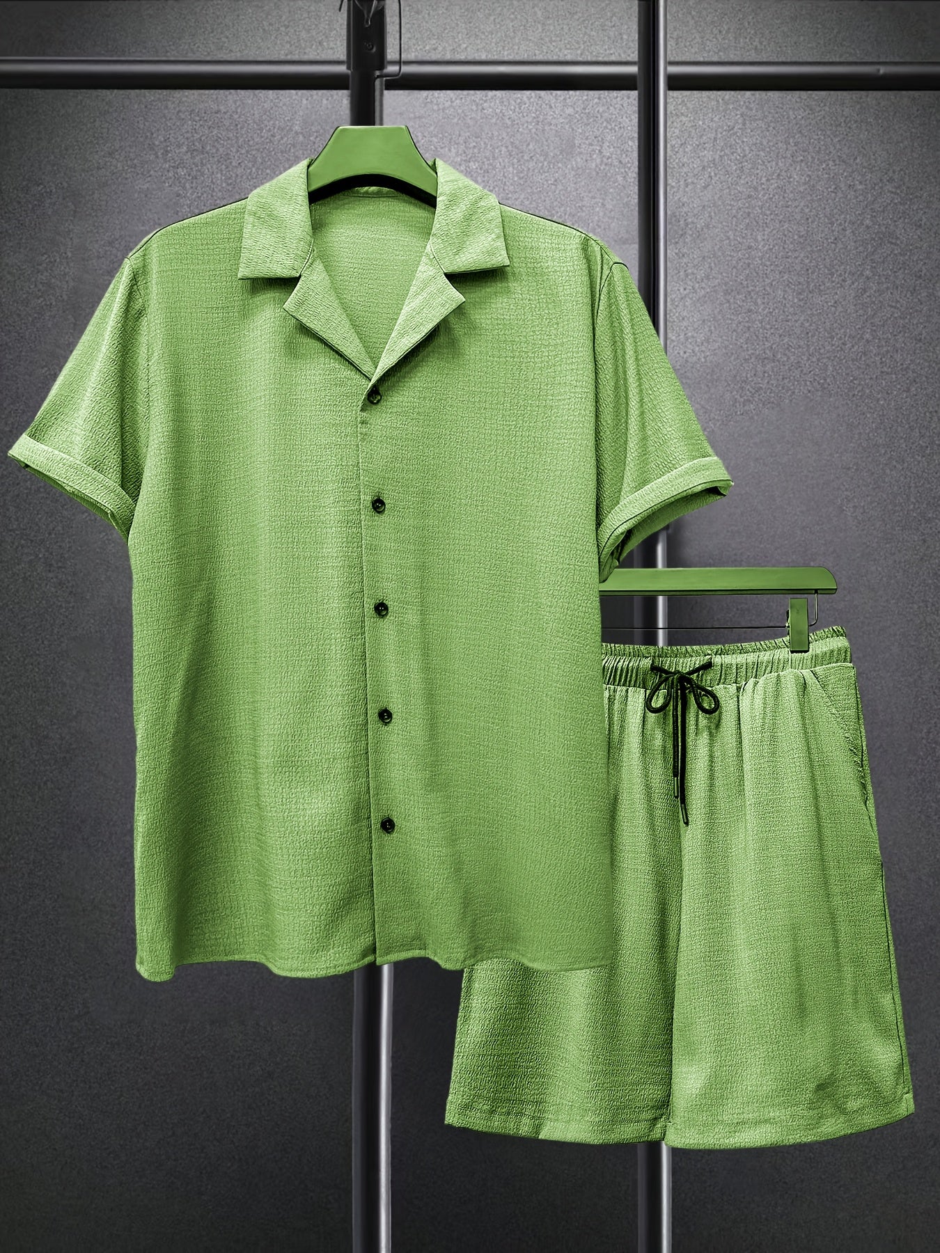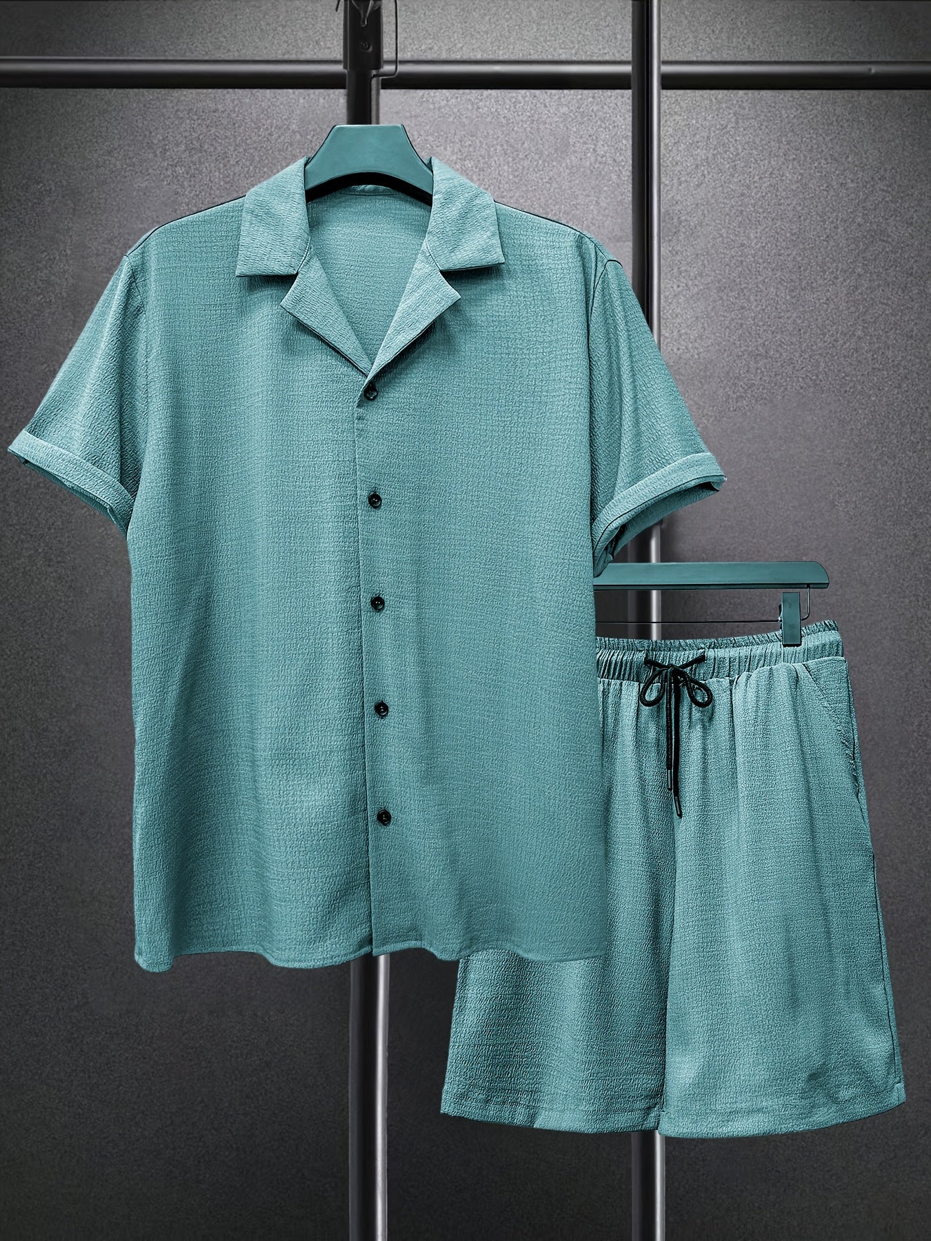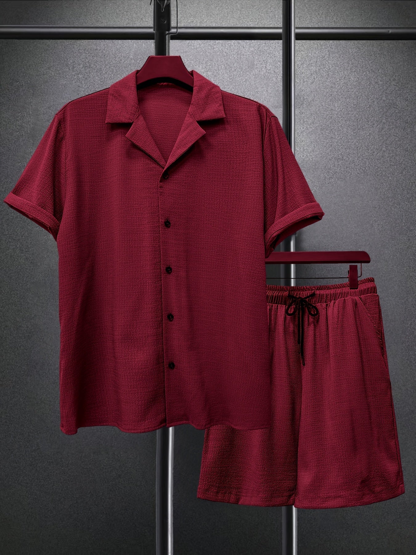 Lekki garnitur męski z małą kratką i szortami to idealne rozwiązanie na lato. Połączenie wygodnej koszuli z krótkim rękawem i spodni czyni go idealnym na plażę, podróż czy codzienny wyjazd. Oddychający materiał zapewnia komfort w upalne dni.
