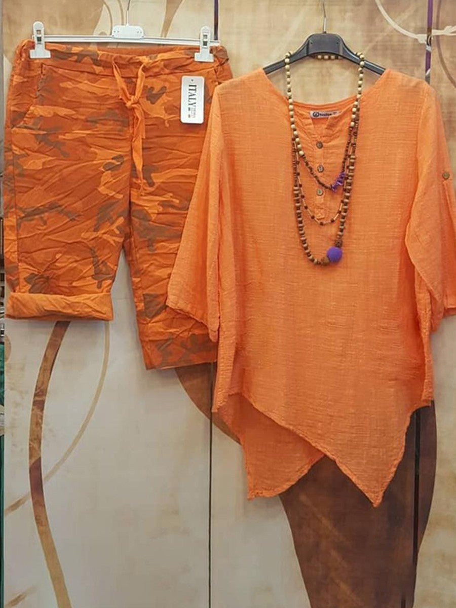Pomarańczowy dwuczęściowy garnitur z okrągłym dekoltem i krótkim rękawem
