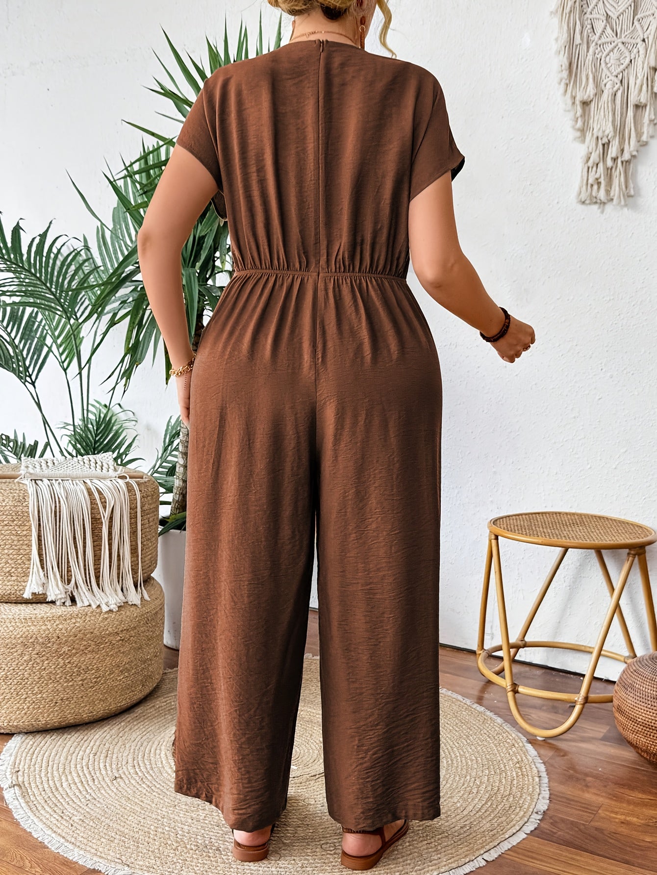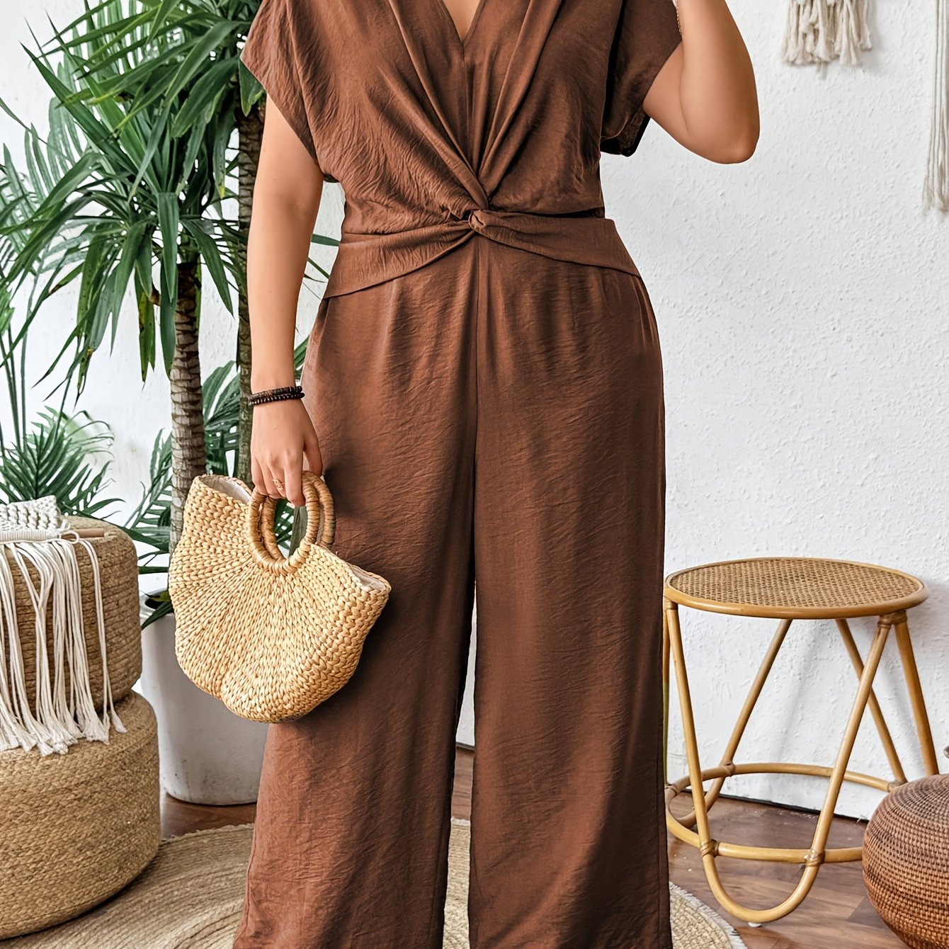 Jednokolorowy kombinezon z dekoltem w serek i skręcanym pasem. Luźny krój i lekka tkanina czynią go wygodnym na co dzień i do biura. Idealny wybór dla kobiet ceniących prostotę i funkcjonalność w eleganckim wydaniu.